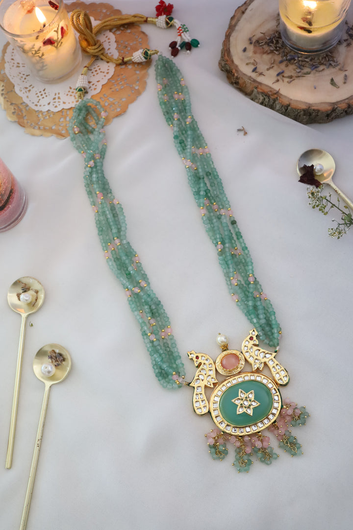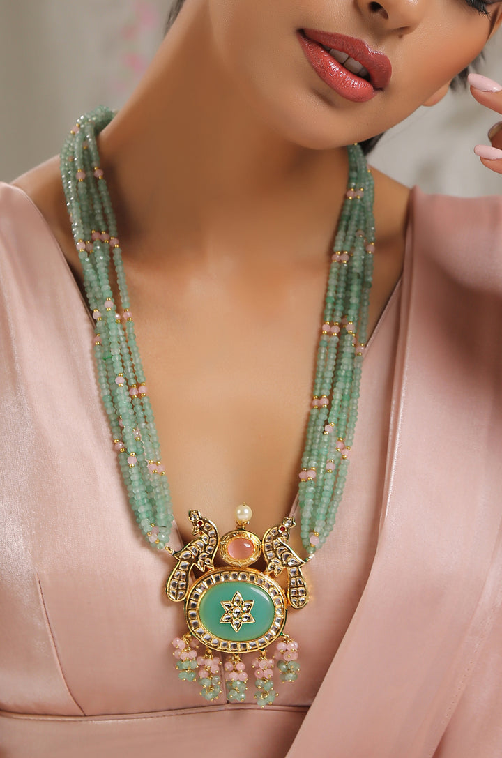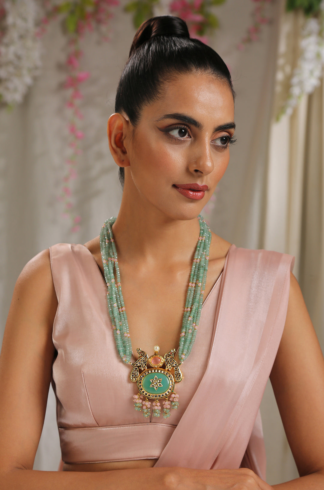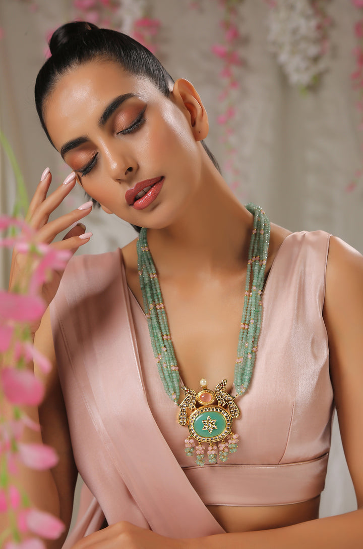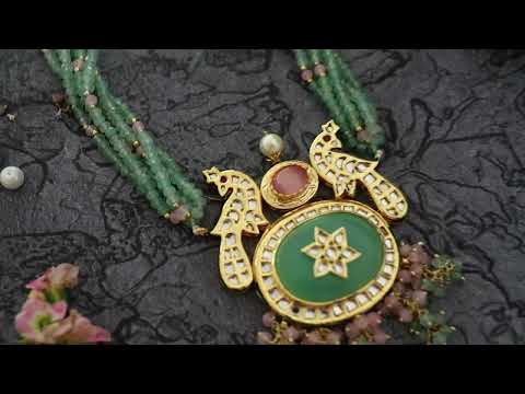 The Tuhin kundan necklace set features oodles of sea green and rose pink stones with a statement kundan pendant. A perfect fit for them is breezy summer lehengas and sarees.