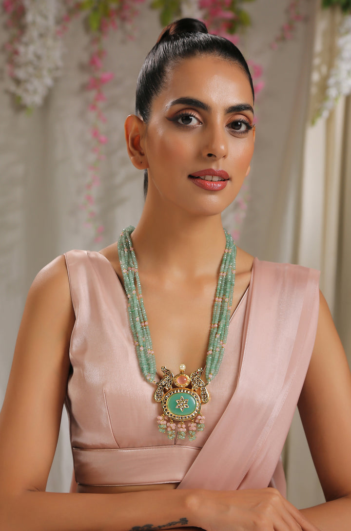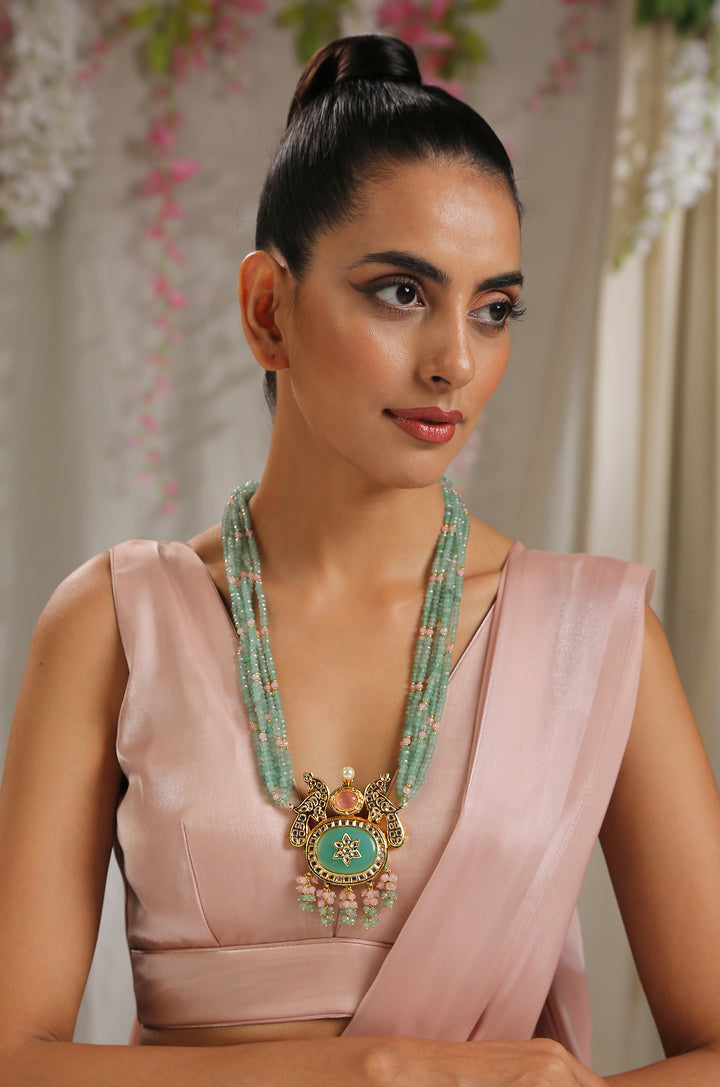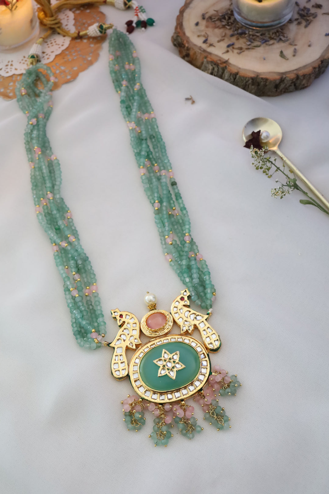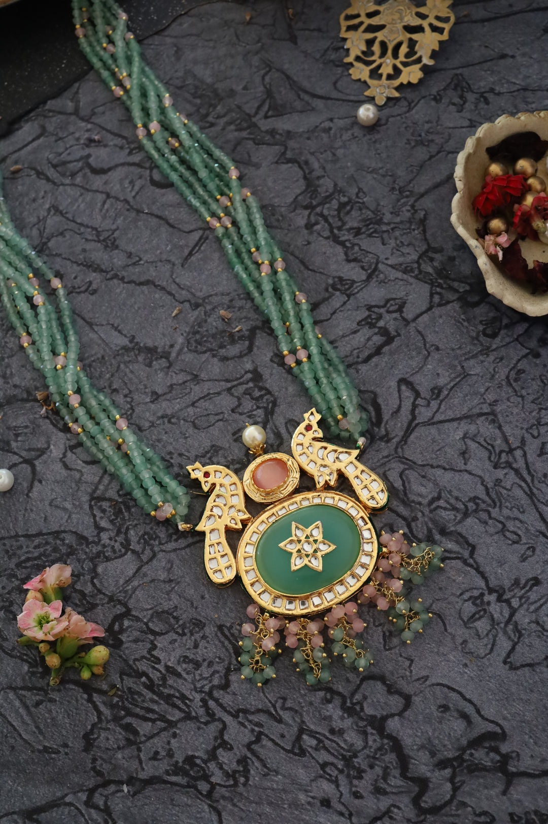 The Tuhin kundan necklace set features oodles of sea green and rose pink stones with a statement kundan pendant. A perfect fit for them is breezy summer lehengas and sarees.