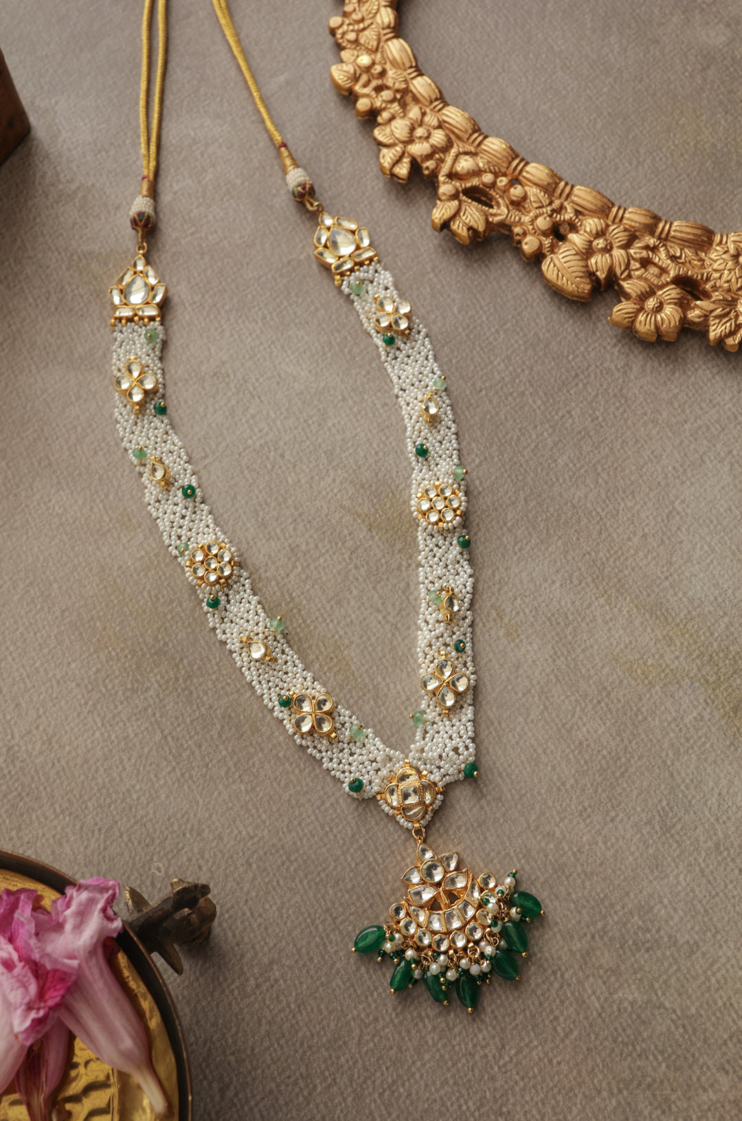 This necklace is a testament to exceptional craftsmanship, where each pearl and Kundan stone is meticulously placed to create a design of unparalleled beauty. The intricate detailing and unique arrangement exude a regal aura, making it a statement piece that reflects timeless elegance and artistry.