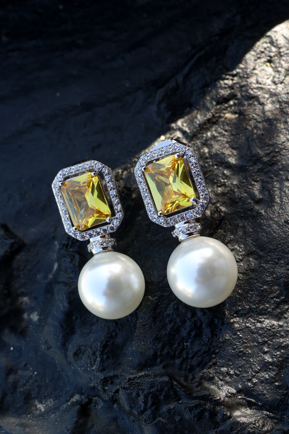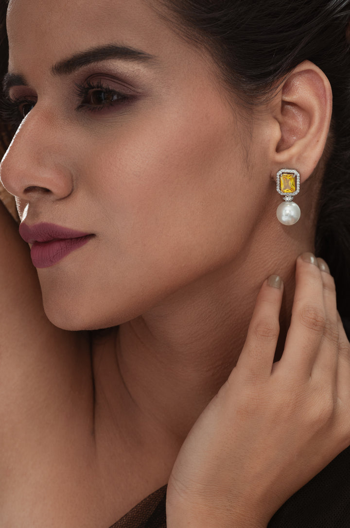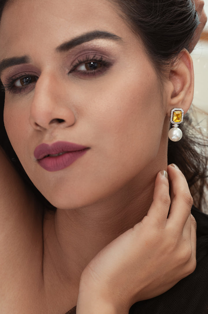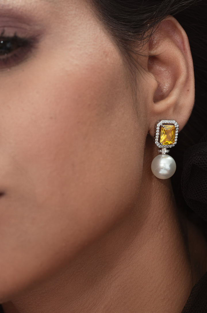 These minimalistic earrings are adorned with yellow zirconia crystals, cubic zirconia, and a dangling freshwater pearl combine subtle elegance with a touch of sophistication.