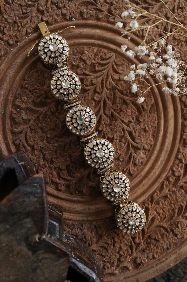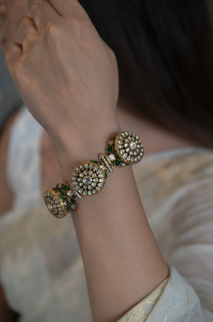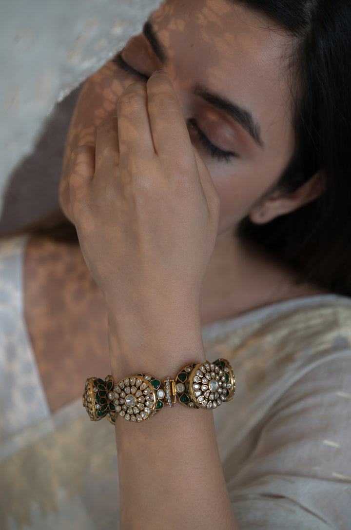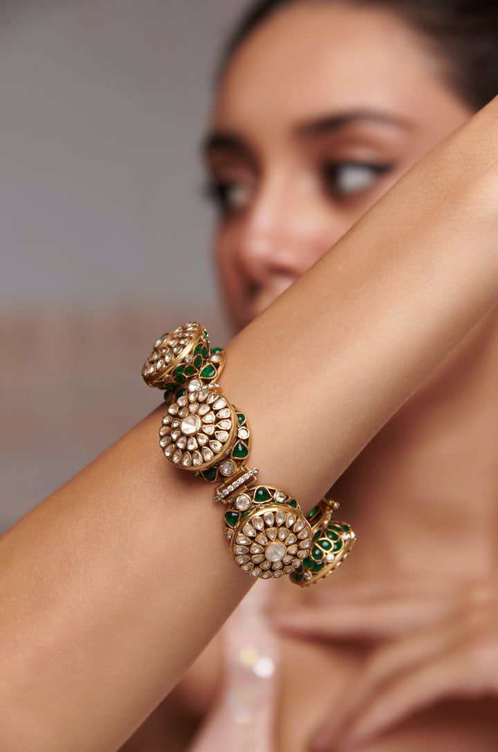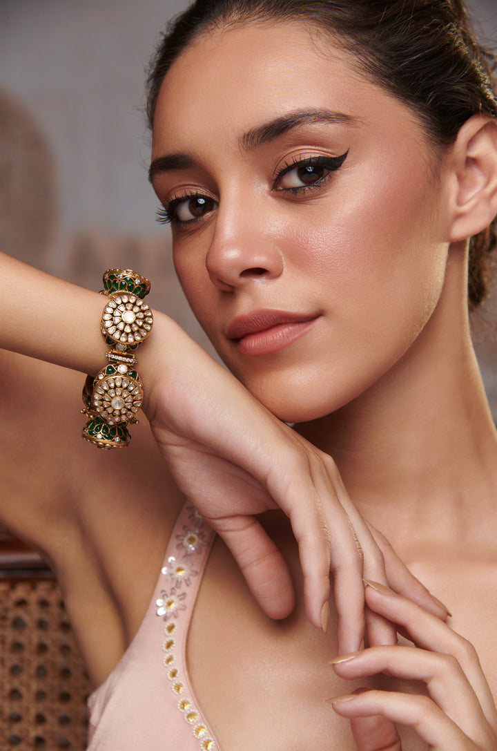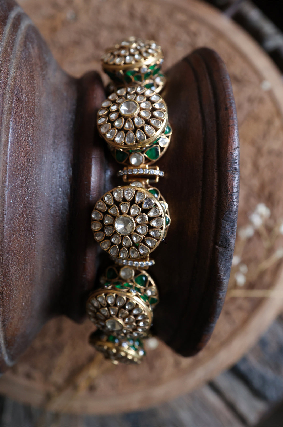 A treasured heirloom that can be passed down to generations, encapsulating heritage and traditions our Dayita bracelet is handcrafted in sterling silver with moissanite polkis and emerald green colored stones. Pair these with evening escapades and balmy brunches for a decidedly snazzy look.