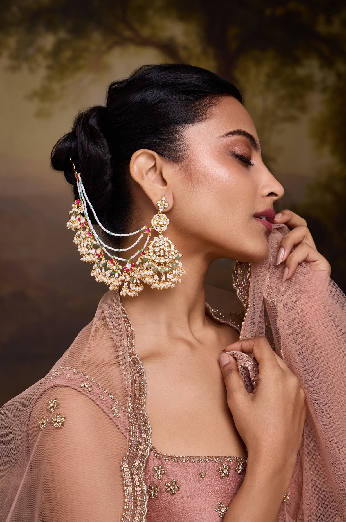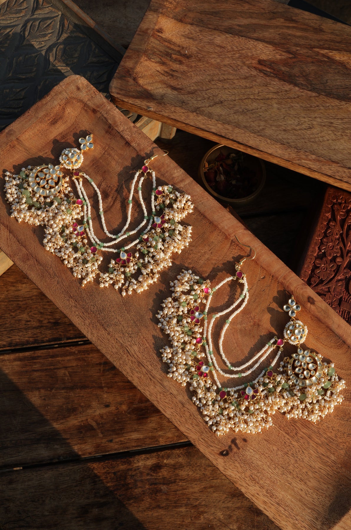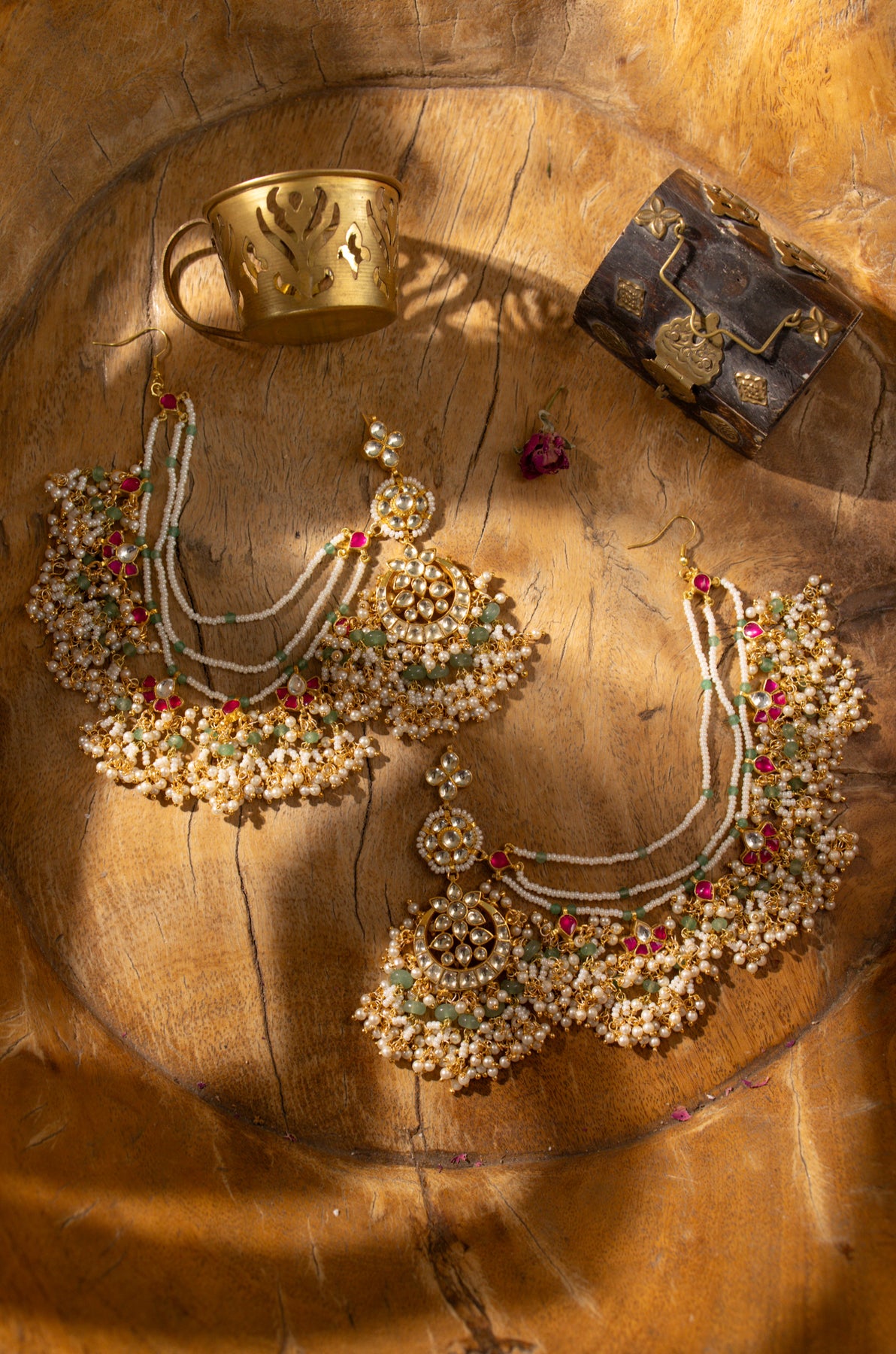 Elevate your ensemble with these stunning chaandbaali earrings, embellished with pearl clusters, mint onyx, and subtle ruby red kundan accents. The design showcases intricately tiered kundan danglers and refined multi-strand side chains that cascade elegantly into the hair, radiating regal elegance and enduring grace.