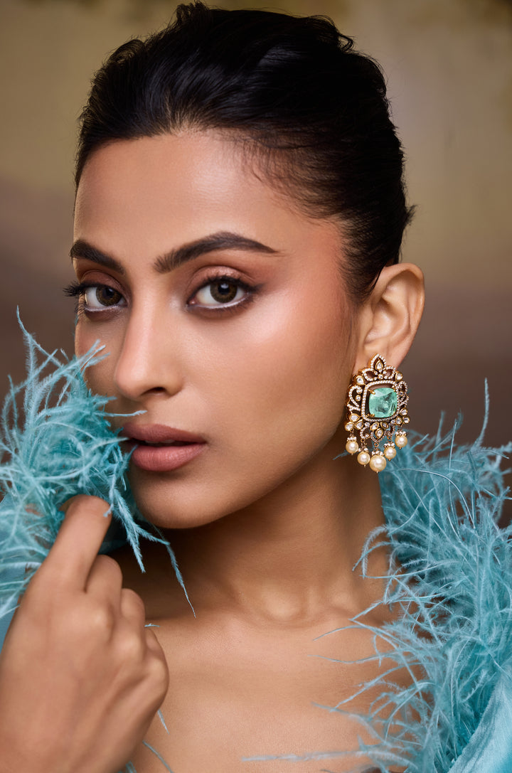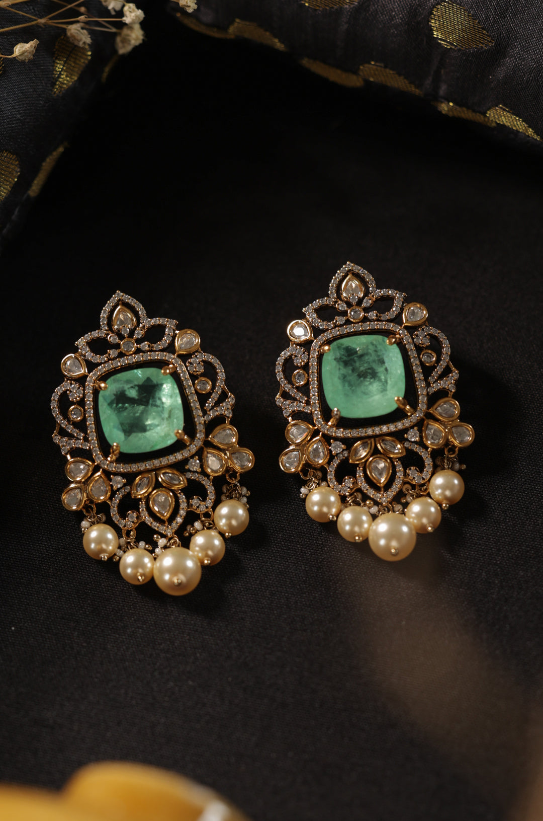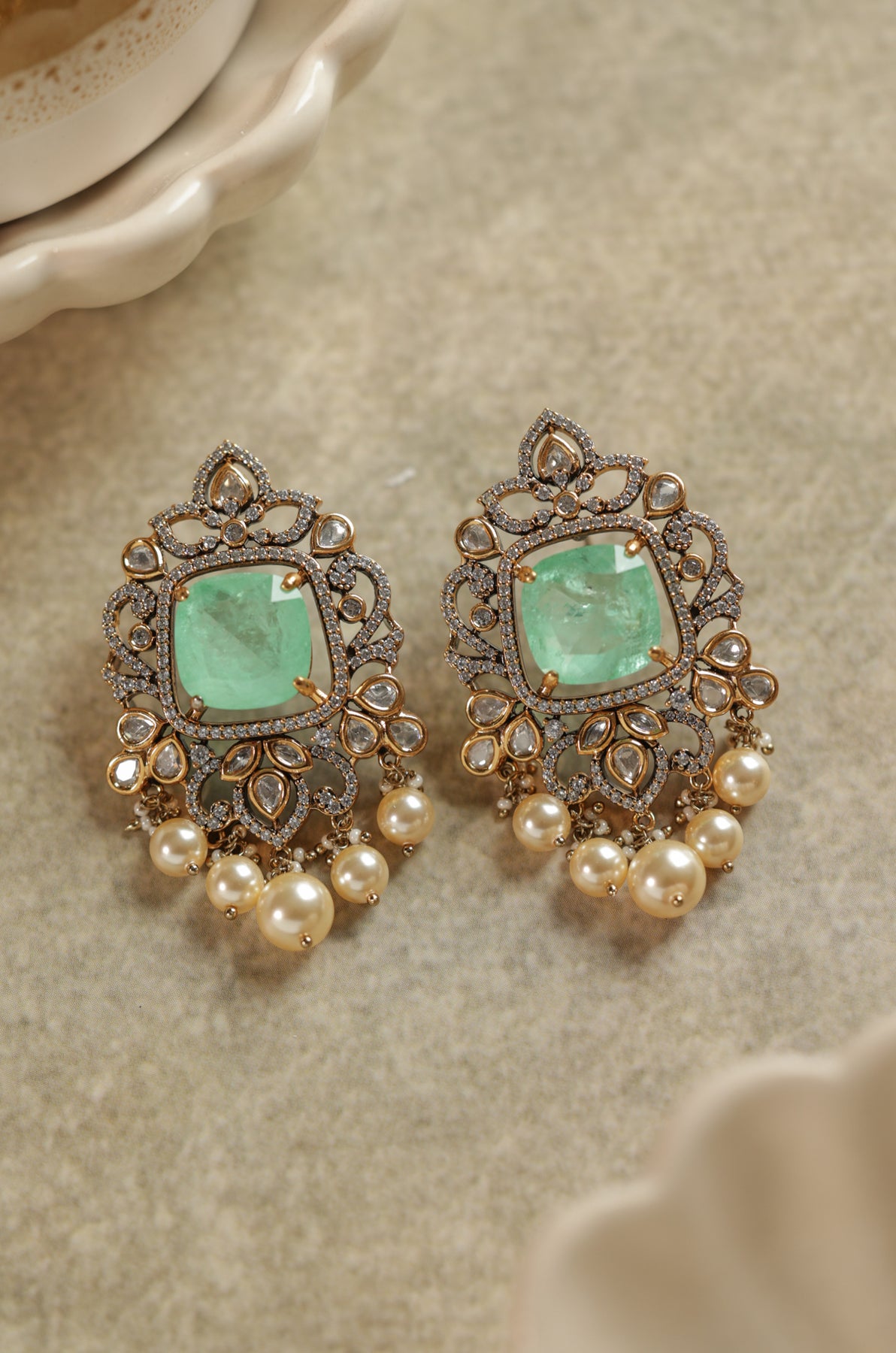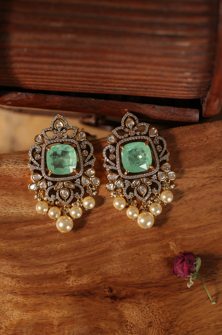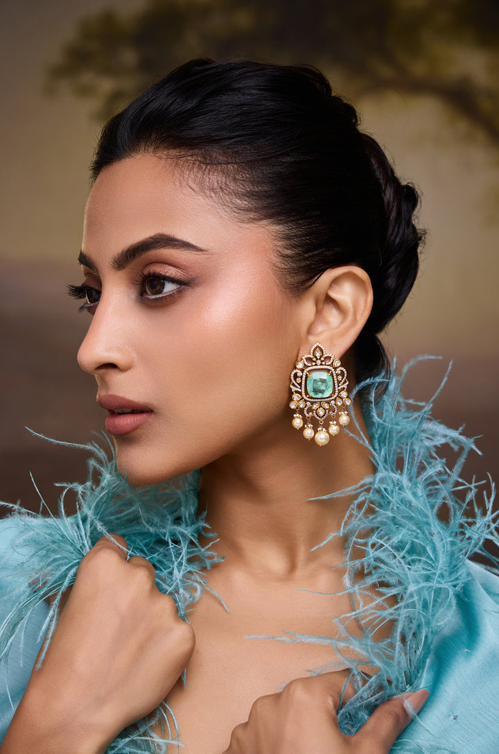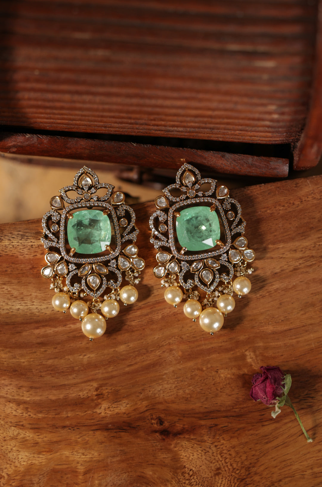 Elevate your traditional ensemble with the regal charm of our Eiray earrings. These exquisite earrings feature a stunning square-cut mint stone at the center, surrounded by dazzling zirconia and intricate polki work that radiates vintage elegance. The cascading pearls add a touch of grace and movement, making them a perfect blend of heritage and sophistication. Ideal for weddings, festive occasions, or royal soirees, these earrings are a timeless statement piece crafted for the modern queen.