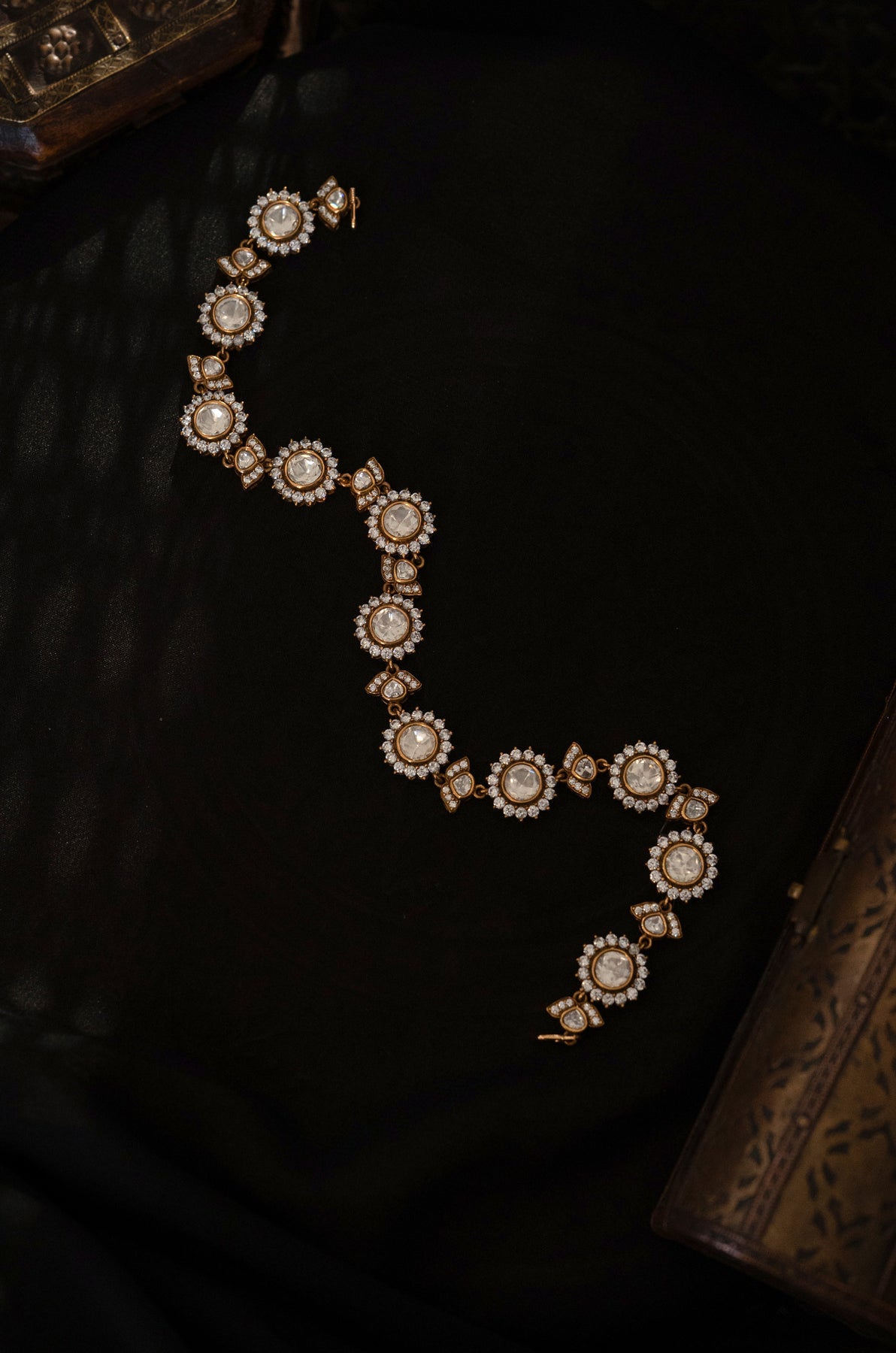 A timeless polki headband, handcrafted with uncut polki set in gold plating, exudes understated elegance. The neat row of polki adds a regal charm, making it the perfect accessory for brides, festive occasions, or anyone looking to add a touch of royalty to their look.