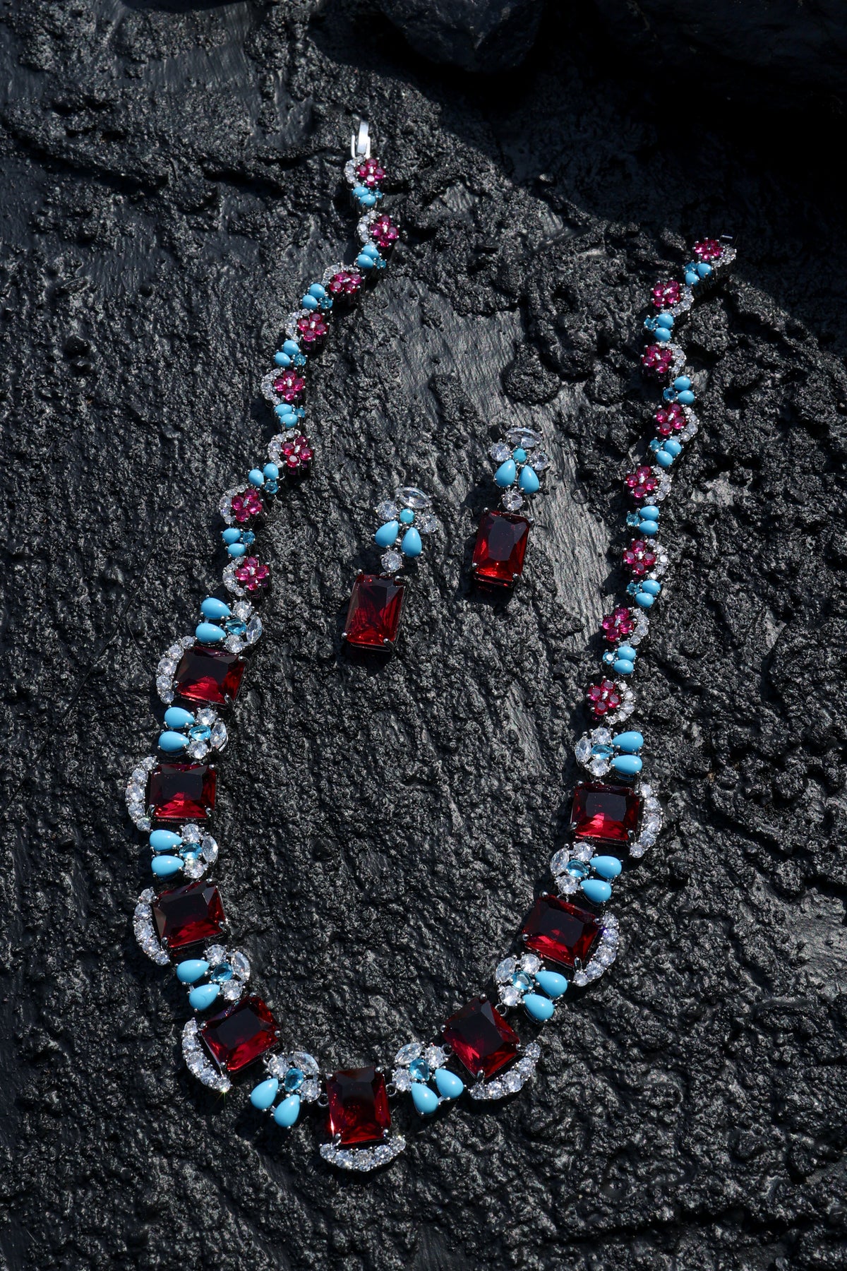 Add a pop of color to your look with this stylish necklace set, featuring an array of vibrant, multicolored crystals. Designed to be both chic and eye-catching, this set is perfect for elevating any outfit, whether for a special occasion or a night out.