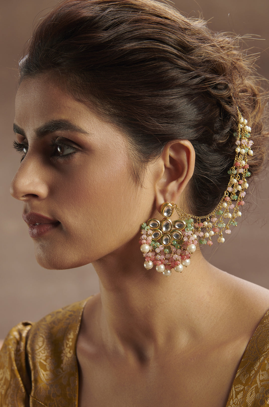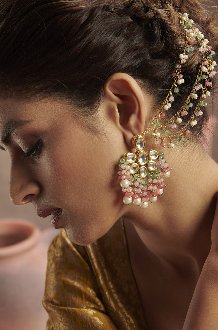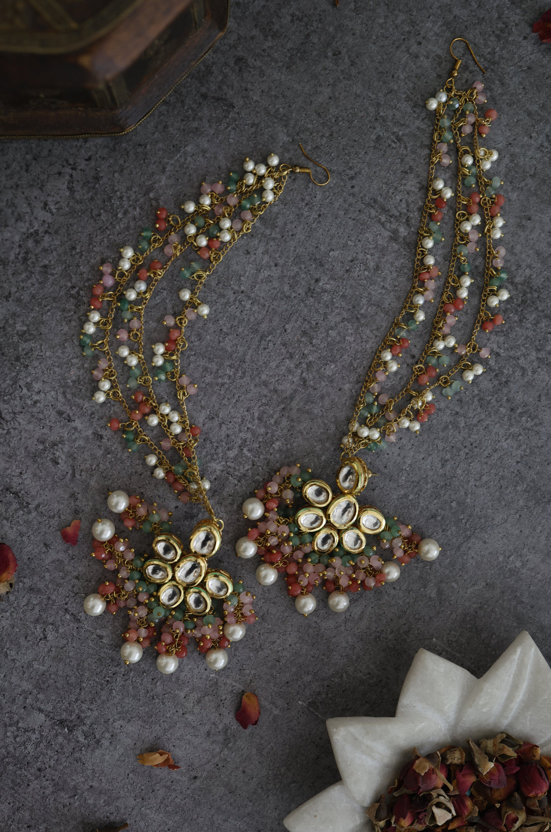 The traditional kundan earrings are handcrafted to celebrate the melodious relationship between modern and traditional jewelry-making techniques. The long hair chain with the trinkets of pearls and natural stones suffuses the design with charm. The earrings belong to the old-world charm that is the most beautiful ear and head accessory to seal the look.