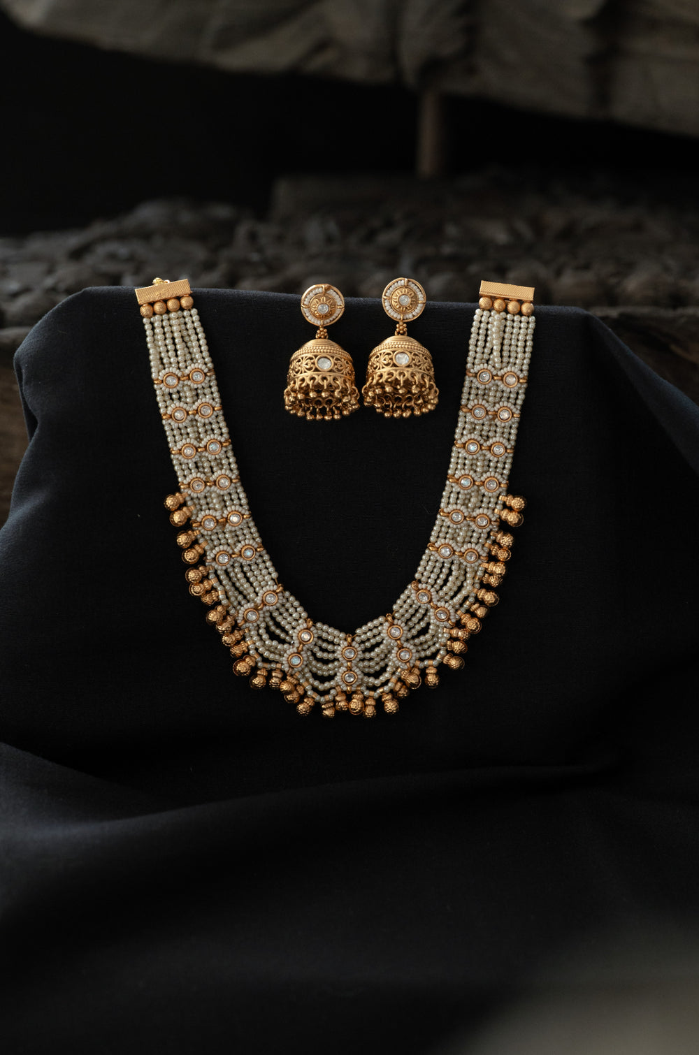 Introducing the Garishma necklace set, where timeless elegance meets spiritual grace. This enchanting piece draws inspiration from the grandeur of South Indian temples, featuring exquisite temple work embellished with lustrous pearls that catch the light beautifully. Each detail reflects authentic Indian heritage craftsmanship passed down through generations. The necklace arrives as a complete set with coordinating earrings, making it effortless to embrace traditional beauty.