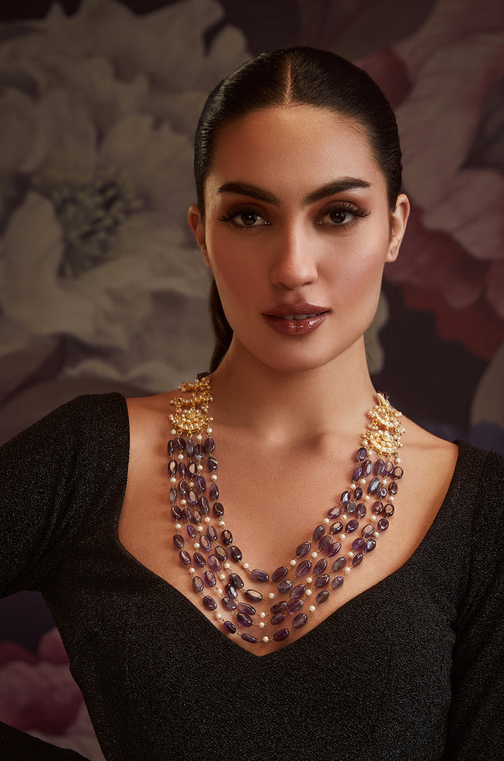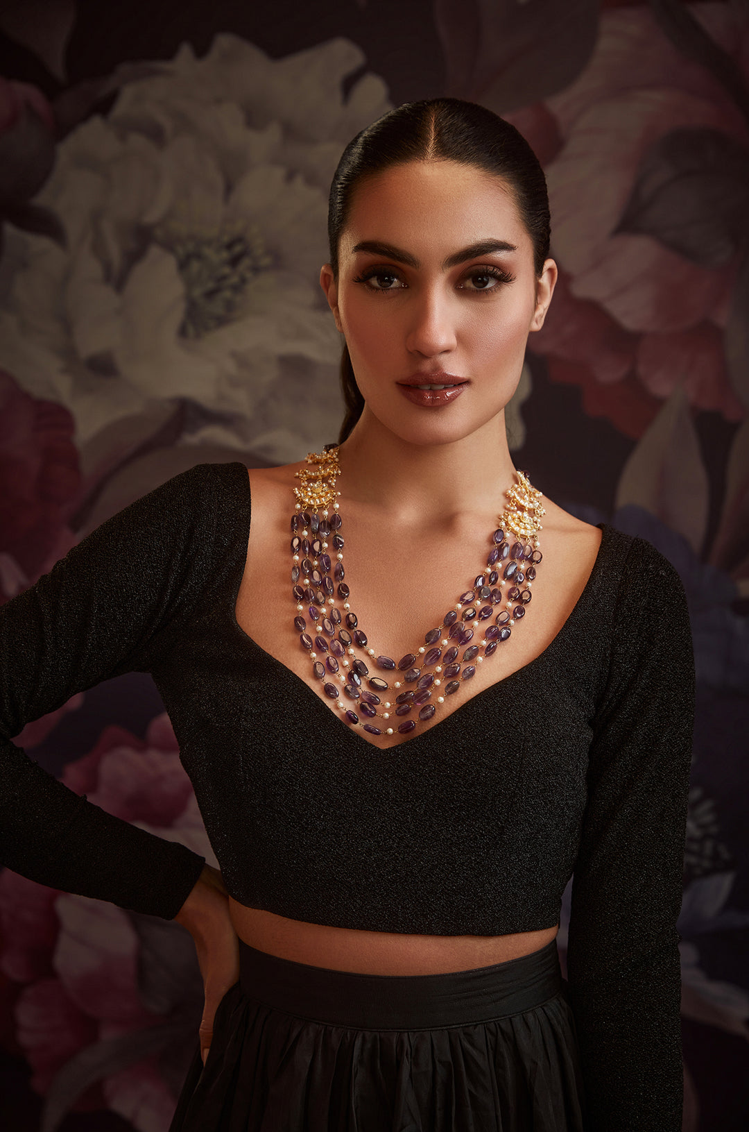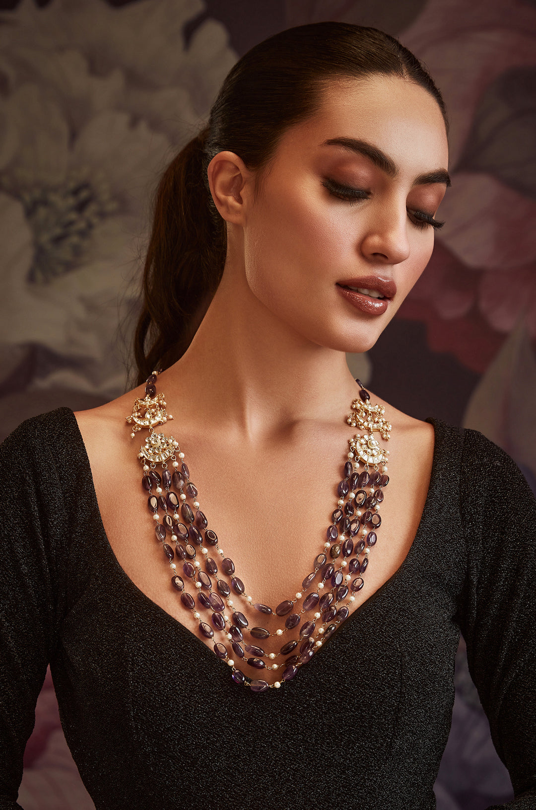The Girika necklace showcases aesthetic amalgamation of various units. This one-of-a-kind piece features layers of semi-precious amethyst stones and shell pearls. Several units of chaand and floral motifs, embedded with polkis, are decked up beautifully amidst the purple tone of necklace and add to the luxury of the handcrafted piece.