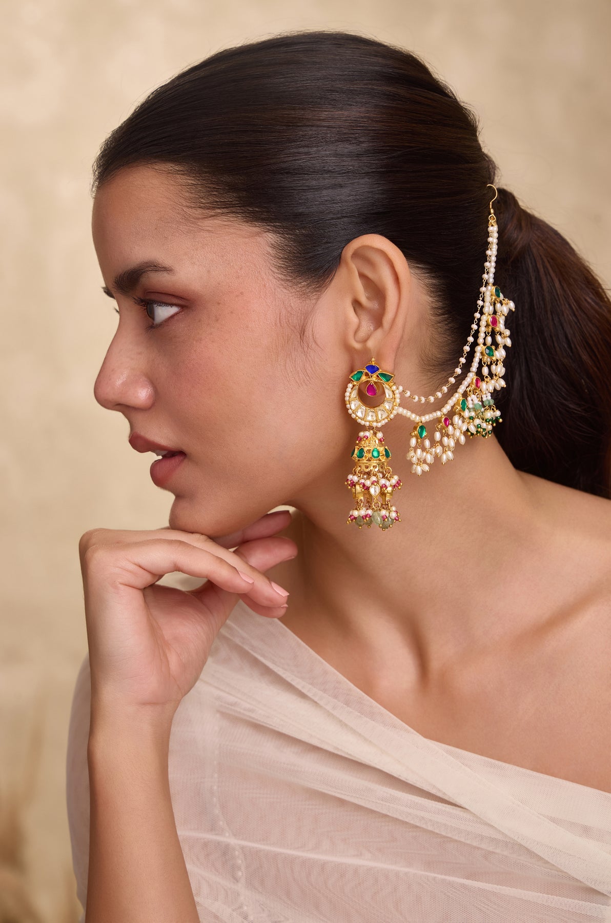 Elevate your elegance with the Haajira earrings, featuring exquisite kundan accents and a lavish cascade of pearls. Adorned with soothing mint fluorite and delicate pink hydro stones, these earrings are complemented by a regal kaan chain that adds a timeless traditional charm. Perfect for sophisticated occasions, they blend classic artistry with refined beauty.