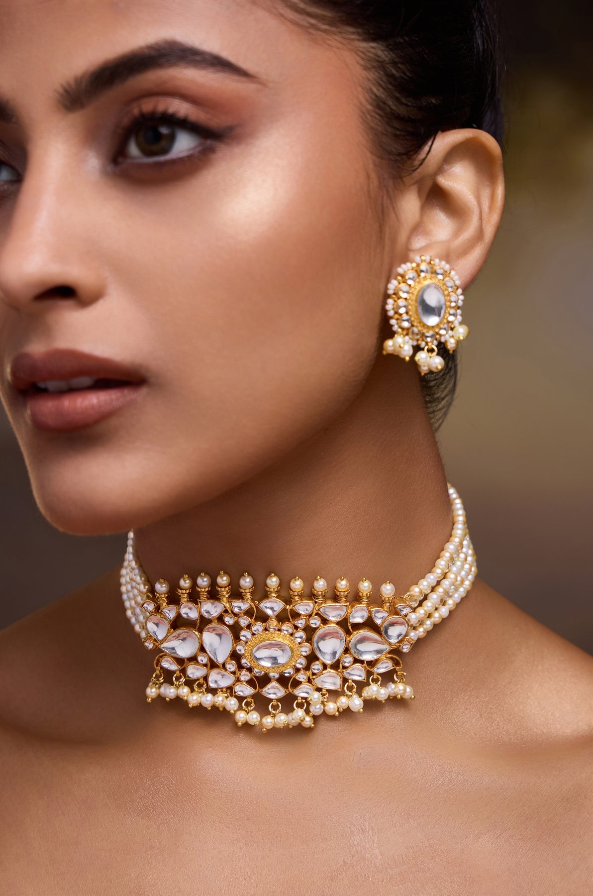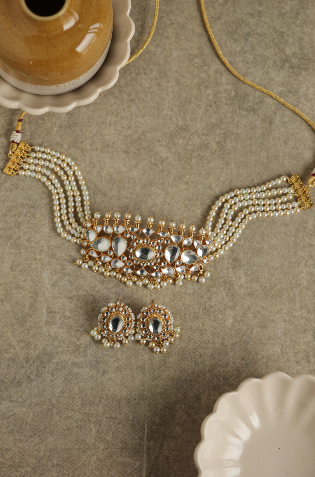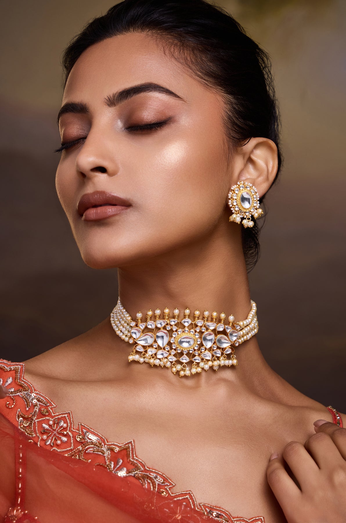 This exquisite Inayat choker set pays tribute to enduring elegance, reminiscent of regal times past. Its centerpiece shines with uncut, mirror-polished stones, each set in detailed goldwork that reflects the grandeur of royal treasures. Soft strands of radiant pearls gently encircle the neck, offering a beautiful balance of refinement and splendor. Complemented by matching earrings that echo its luxurious design, this set is crafted for the contemporary woman inspired by vintage charm. Ideal for weddings or special occasions, it is a piece that leaves a lasting impression.