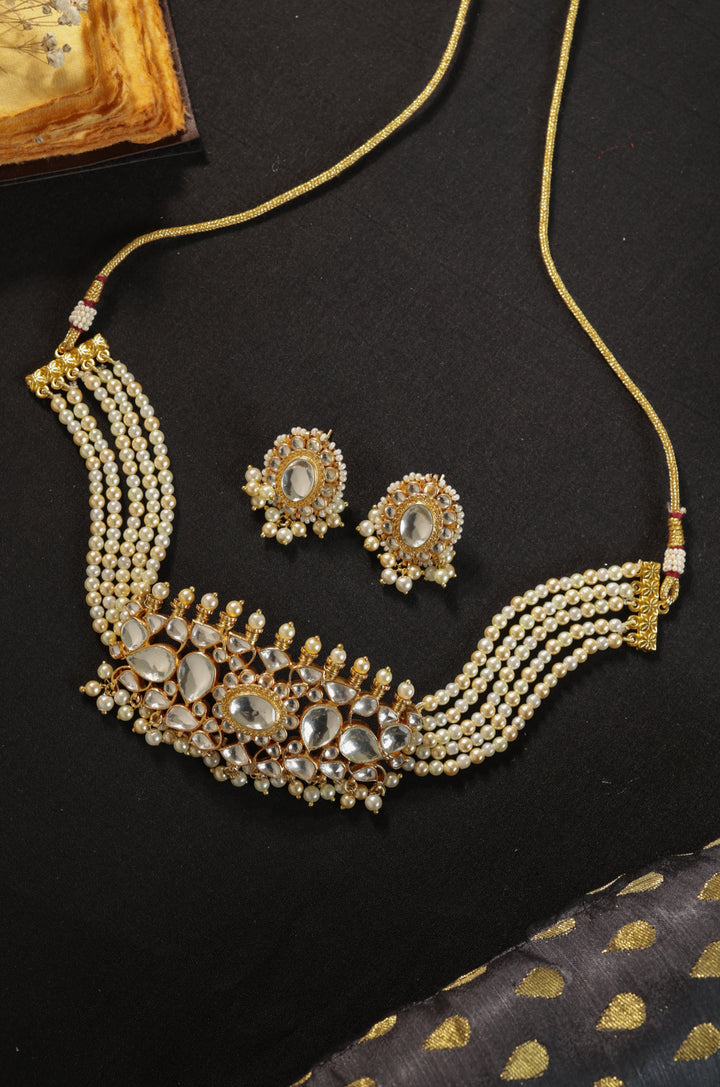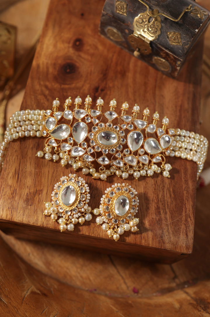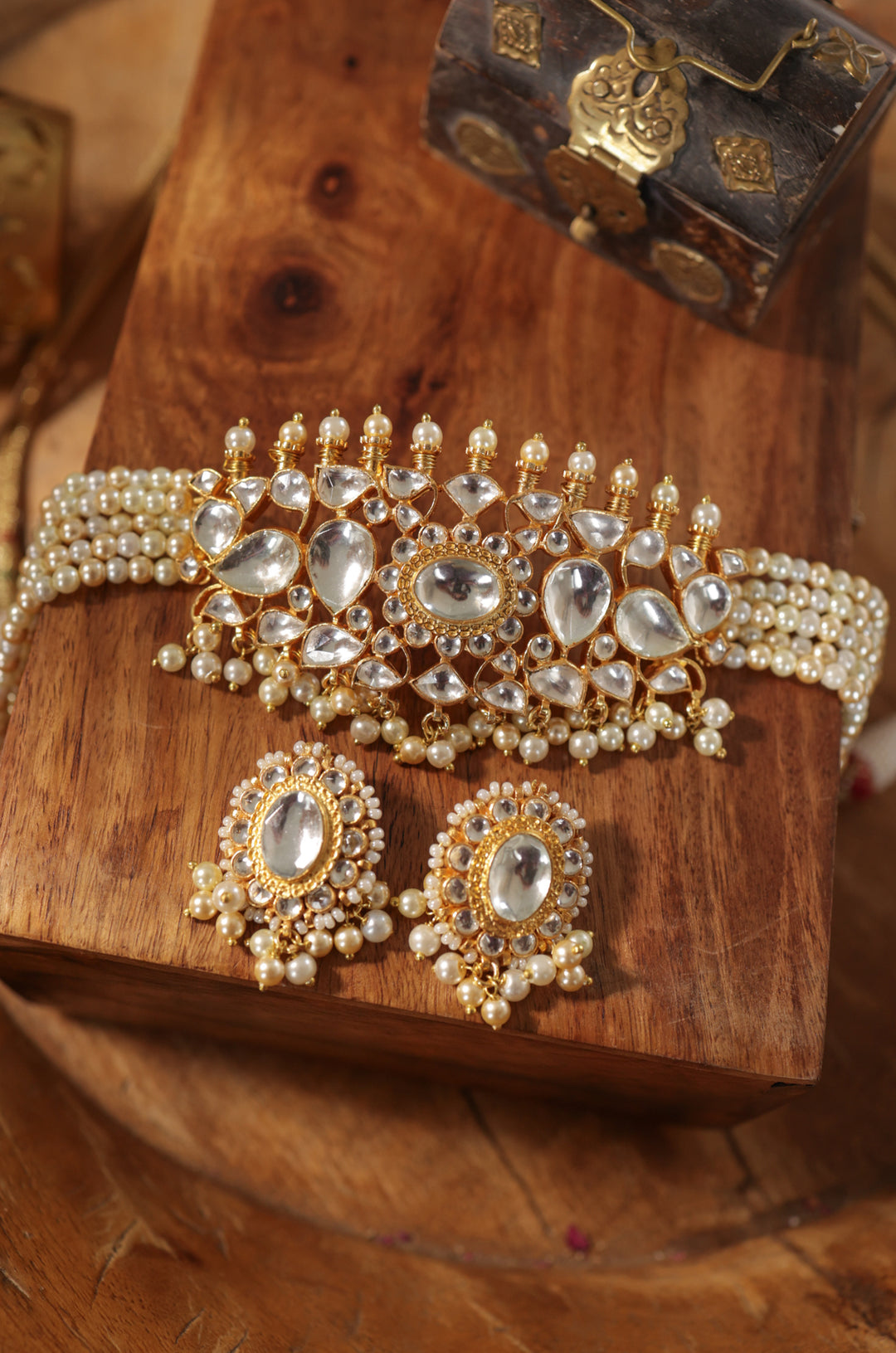 This exquisite Inayat choker set pays tribute to enduring elegance, reminiscent of regal times past. Its centerpiece shines with uncut, mirror-polished stones, each set in detailed goldwork that reflects the grandeur of royal treasures. Soft strands of radiant pearls gently encircle the neck, offering a beautiful balance of refinement and splendor. Complemented by matching earrings that echo its luxurious design, this set is crafted for the contemporary woman inspired by vintage charm. Ideal for weddings or special occasions, it is a piece that leaves a lasting impression.