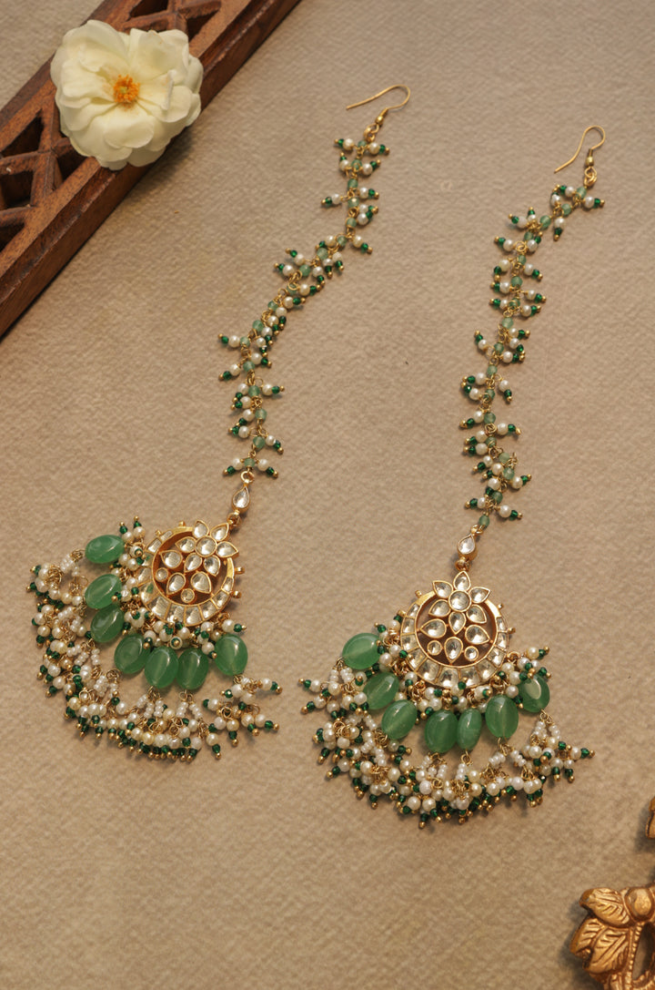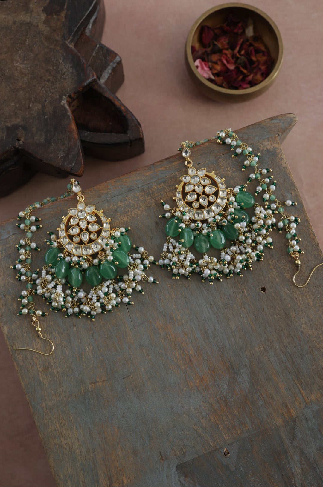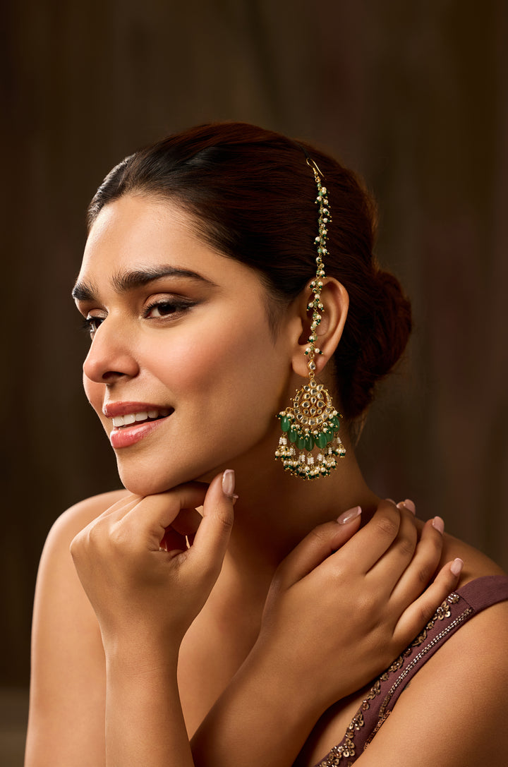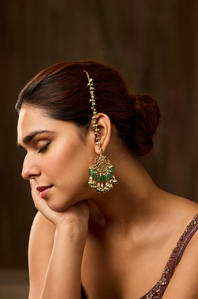 The Indira earrings combine classic design with natural beauty. Kundan stones shimmer in the floral centerpiece, complemented by the soft green hues of natural stones and the delicate glow of pearls. The cascading design and pearl-studded chain create a sense of refined elegance. These earrings are perfect for adding a touch of subtle glamour.