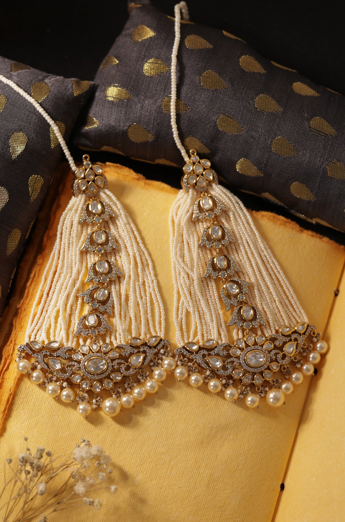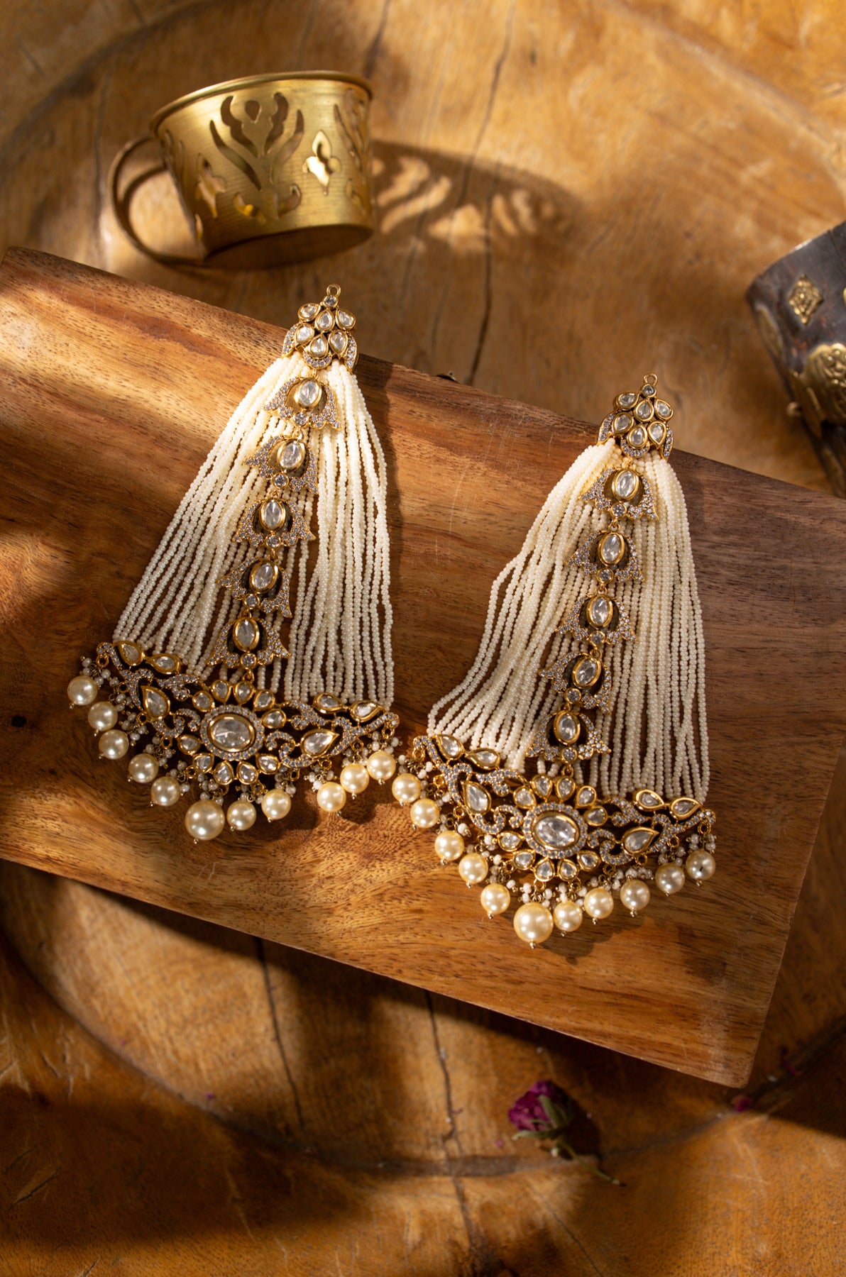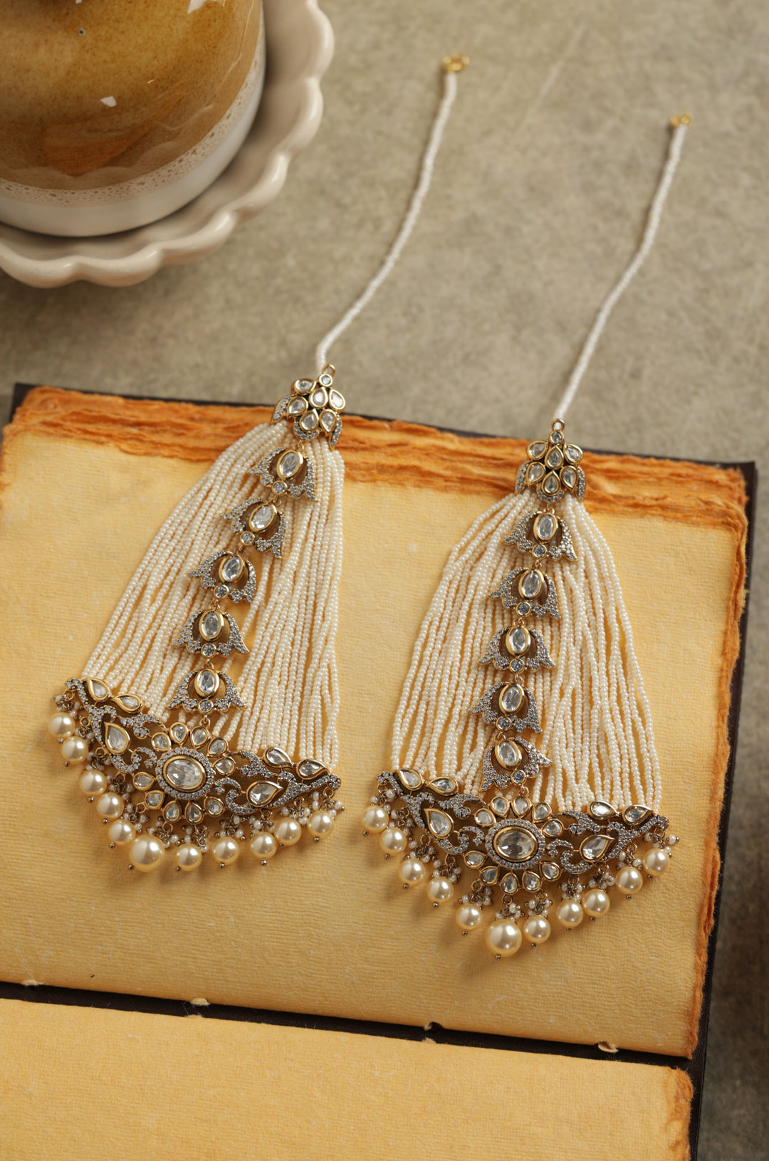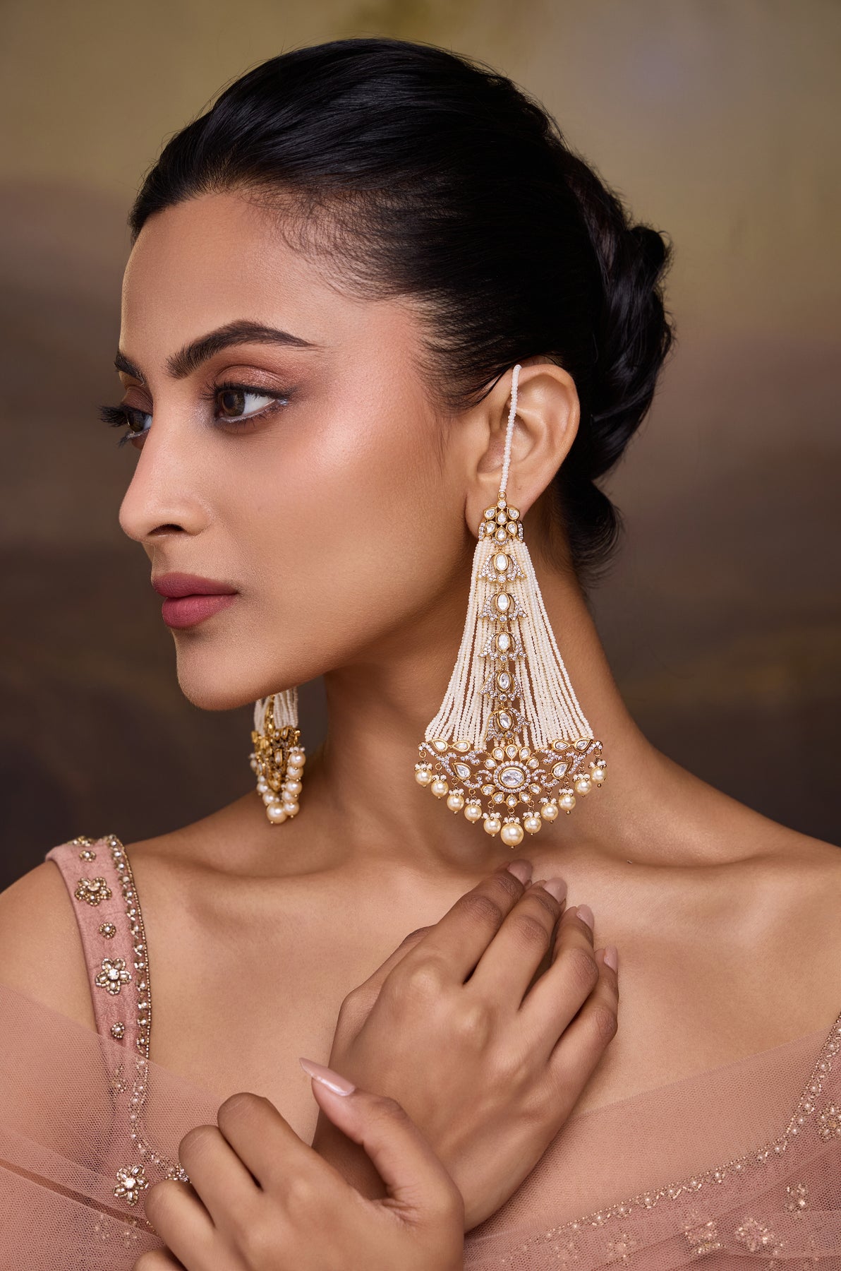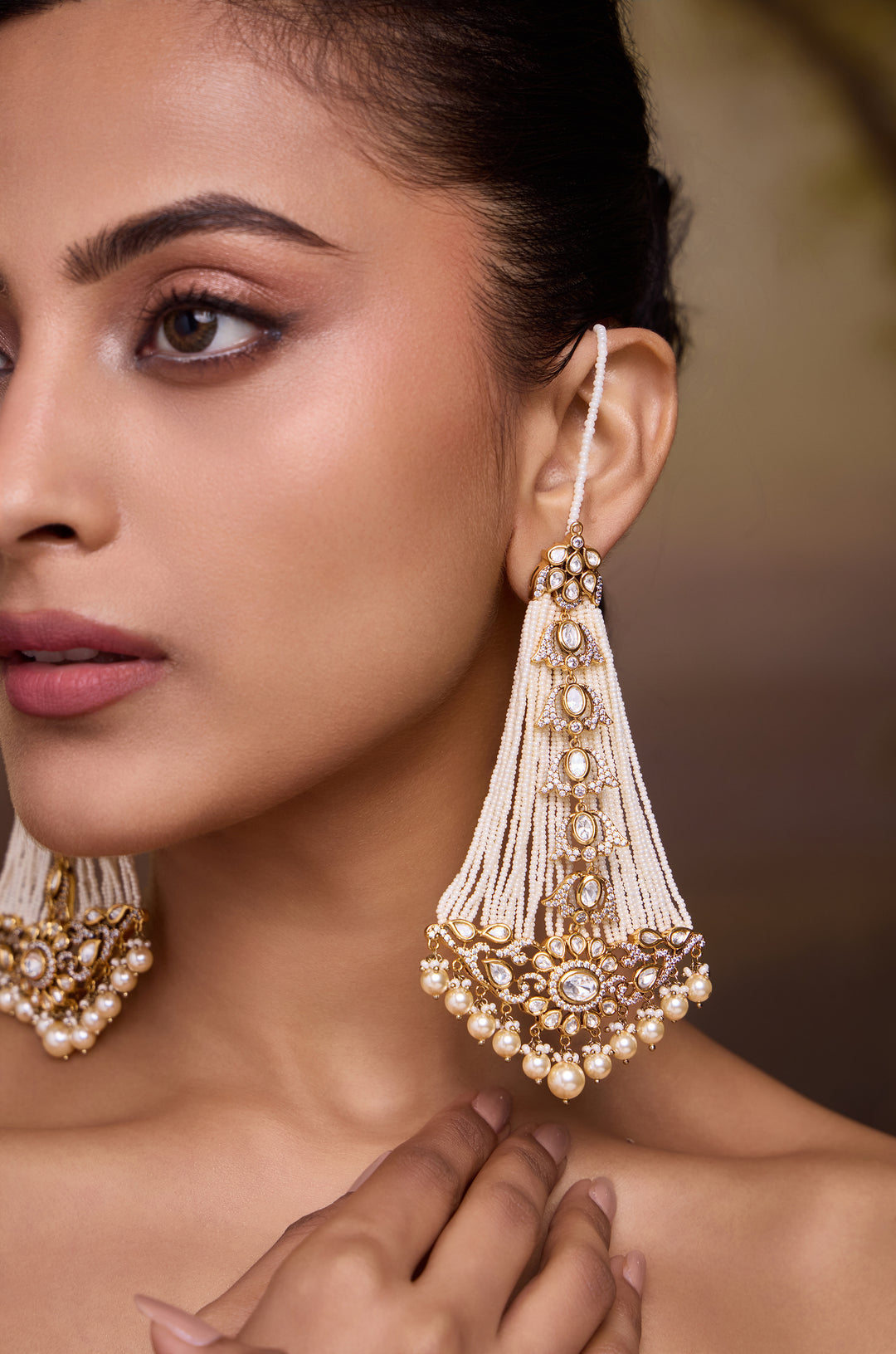 An ode to timeless elegance, these handcrafted Ishya earrings feature cascading strands of fine seed pearls, gracefully converging into a stunning display of traditional polki. The ornate lower panel is adorned with floral and paisley-inspired motifs, encrusted with polki and delicate pearl drops that sway with every step. Rich in heritage and regal in presence, these earrings are perfect for bridal ensembles or any occasion that calls for grace with grandeur.