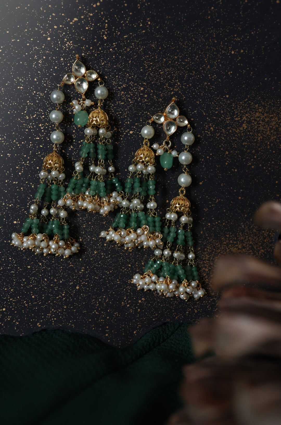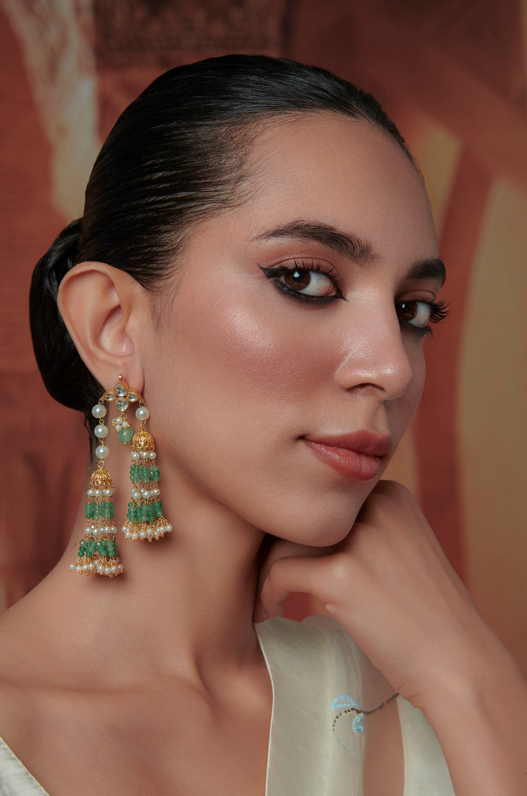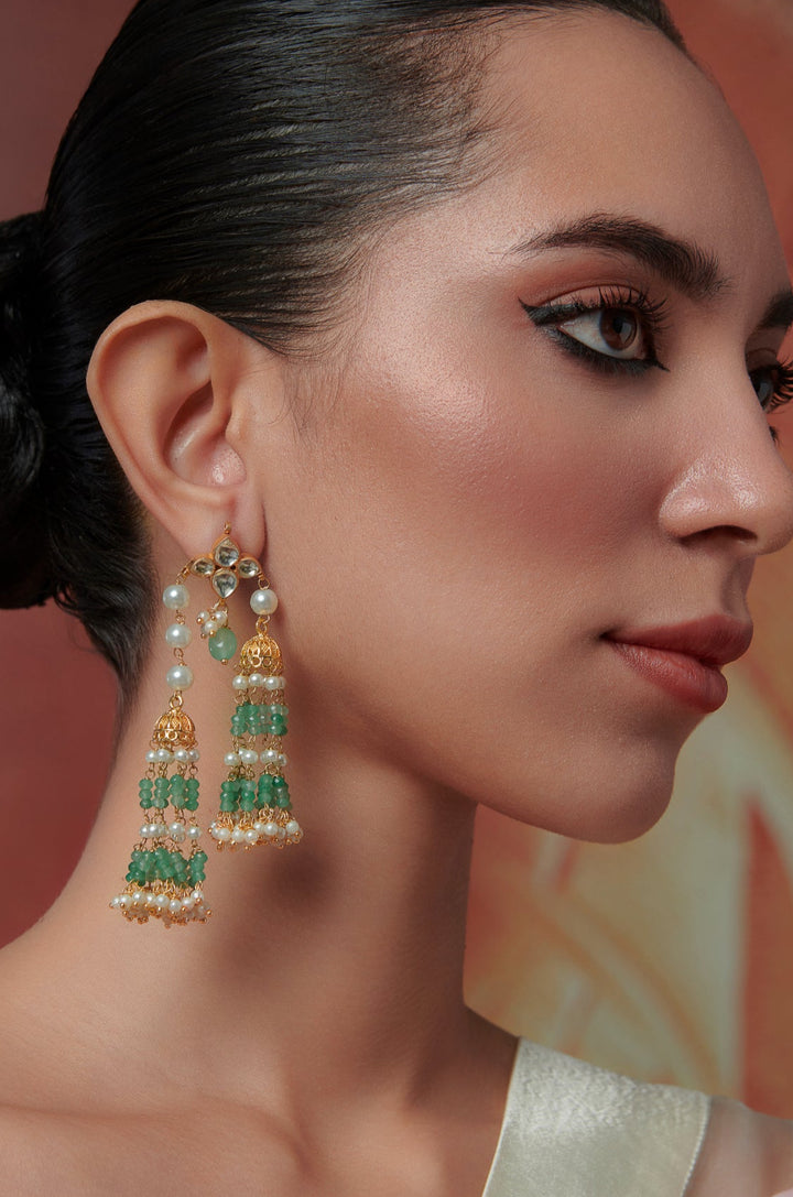 Kai Mint Jhumka Earrings are a lavish blend of classic and trendsetting style. With Kundan gems adorning the top and stunning jhumkas awash with pearls and a delicate mint onyx, these earrings boast a majestic aura. Strut like a queen with these unique jhumkas!