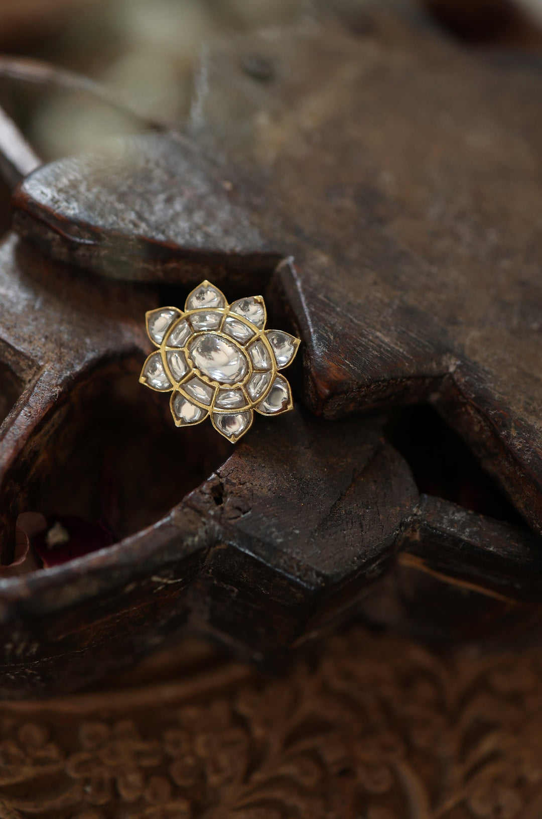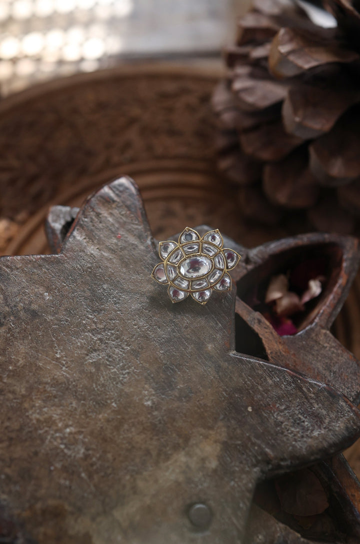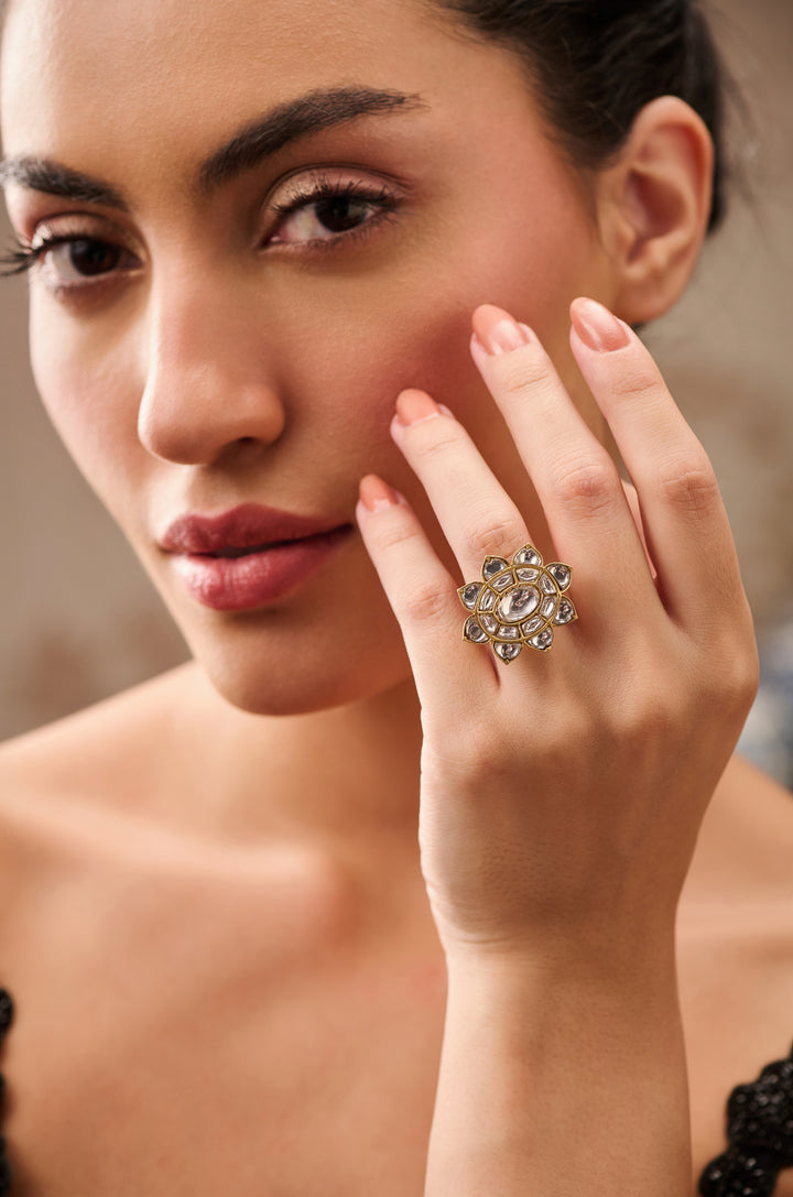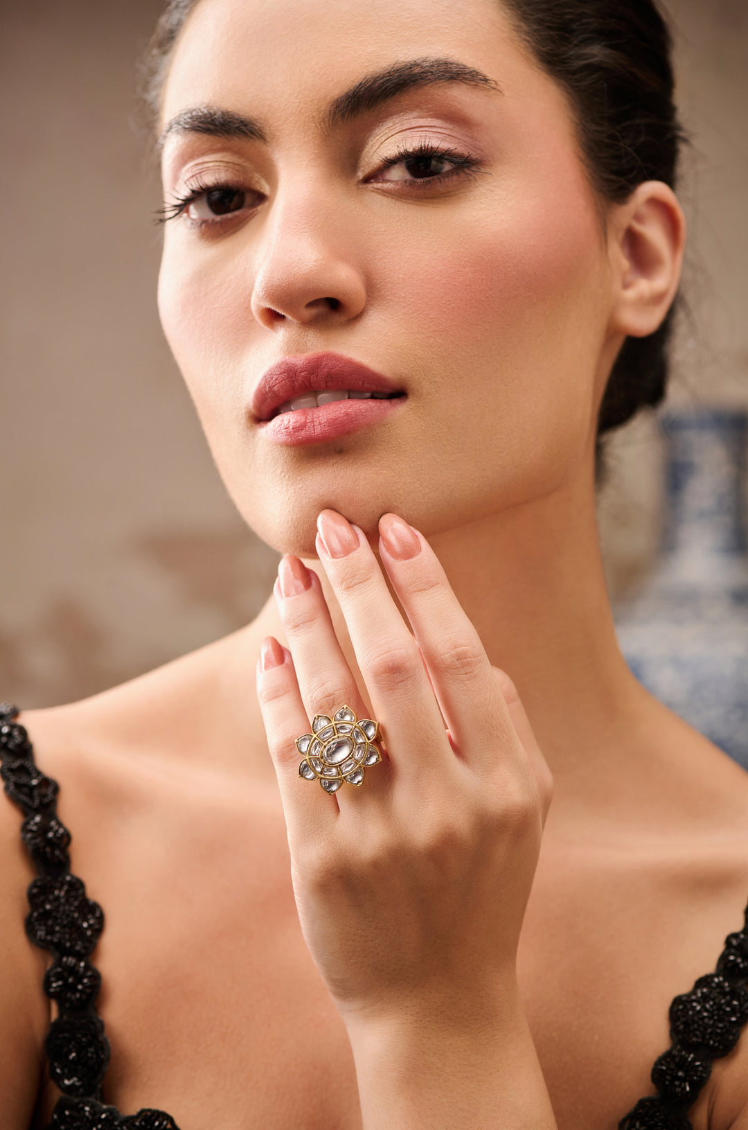 Experience sophistication and contemporary style with the Khushi ring. Featuring sparkling kundan, this design exudes elegance. The refreshing pattern adds a modern touch, making this ring a timeless representation of individuality and fashion. Handcrafted from fine silver, this ring is more than just an accessory it captures the essence of the present moment.