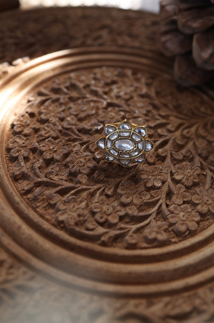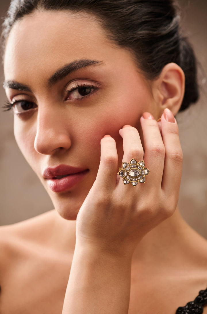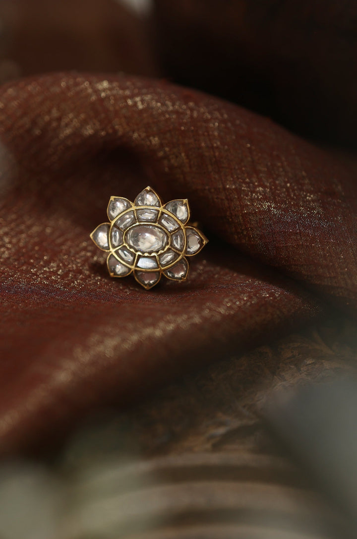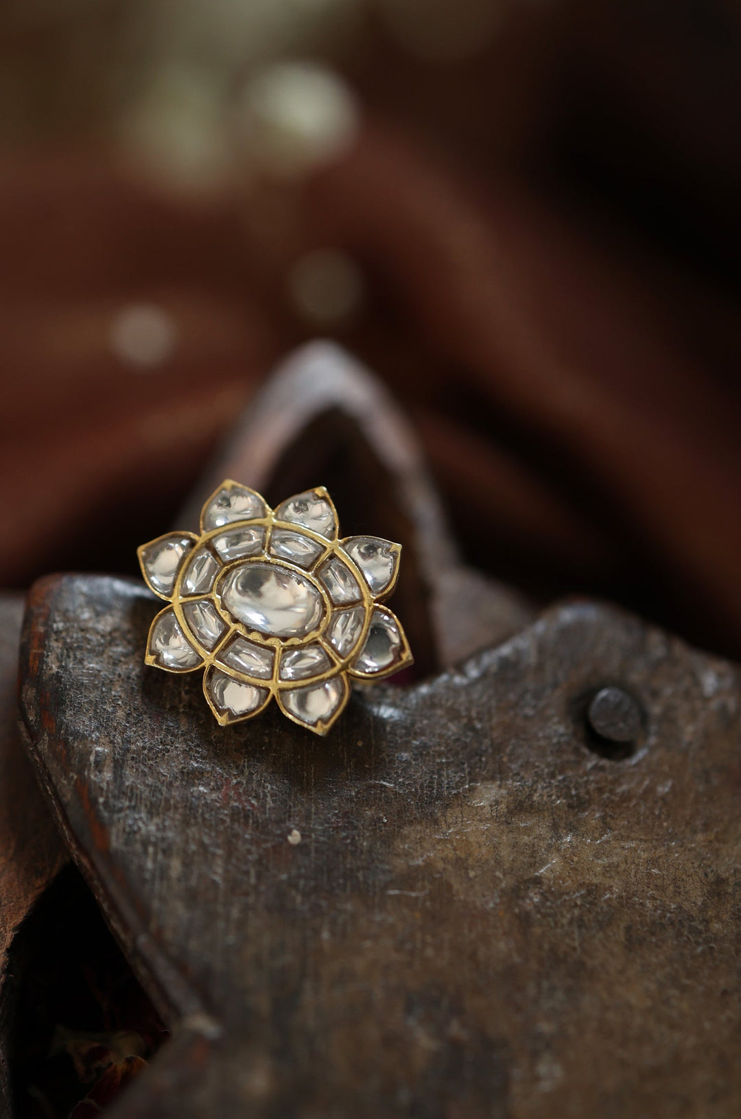 Experience sophistication and contemporary style with the Khushi ring. Featuring sparkling kundan, this design exudes elegance. The refreshing pattern adds a modern touch, making this ring a timeless representation of individuality and fashion. Handcrafted from fine silver, this ring is more than just an accessory it captures the essence of the present moment.