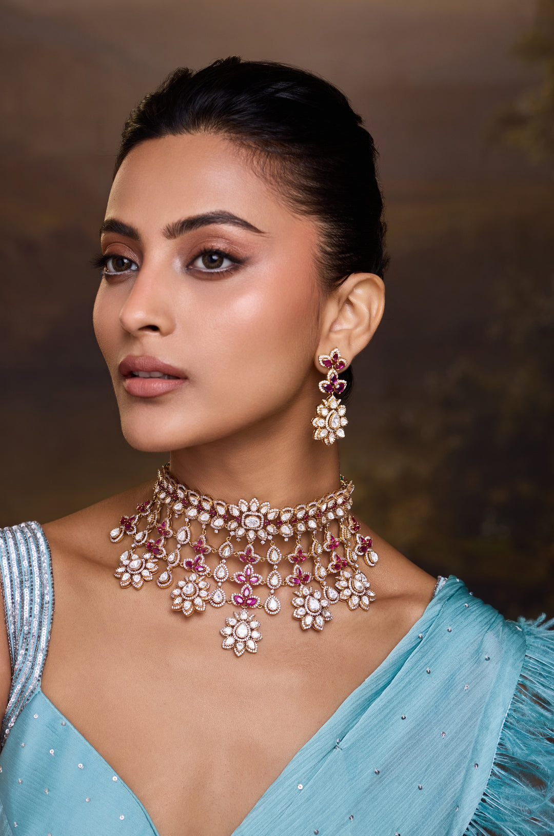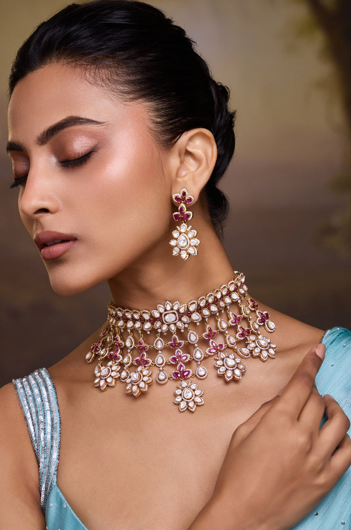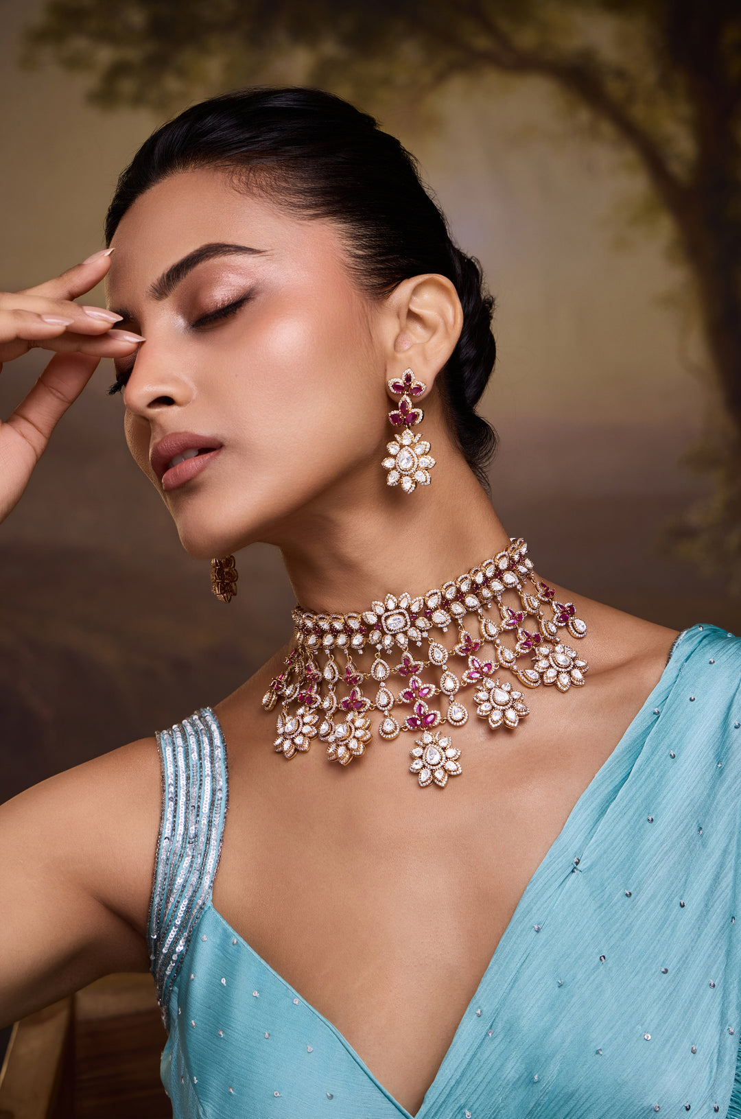 Enhance your jewelry ensemble with the Ishwari necklace set, adorned with finely crafted polkis that highlight exceptional craftsmanship. Accented by graceful pink garnet stones, this set radiates a subtle and enchanting elegance. Ideal for infusing your style with enduring refinement. Includes coordinating earrings.