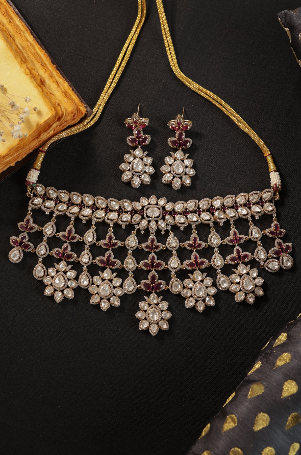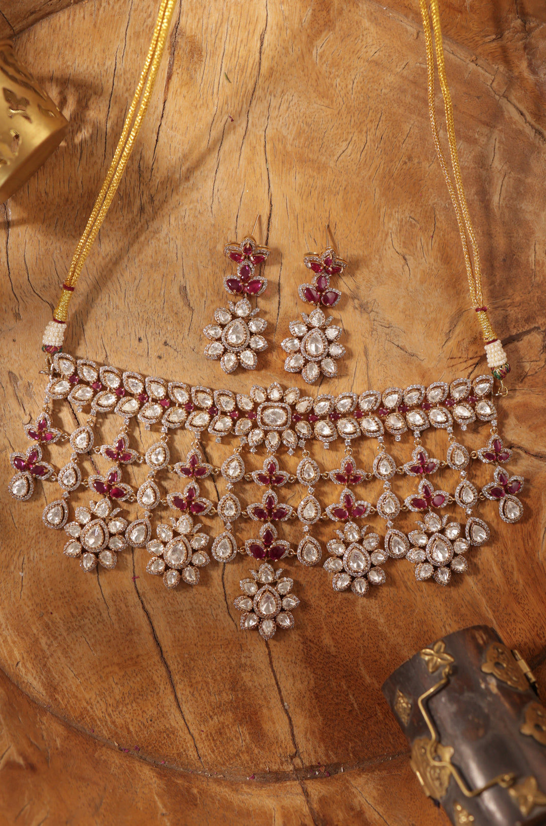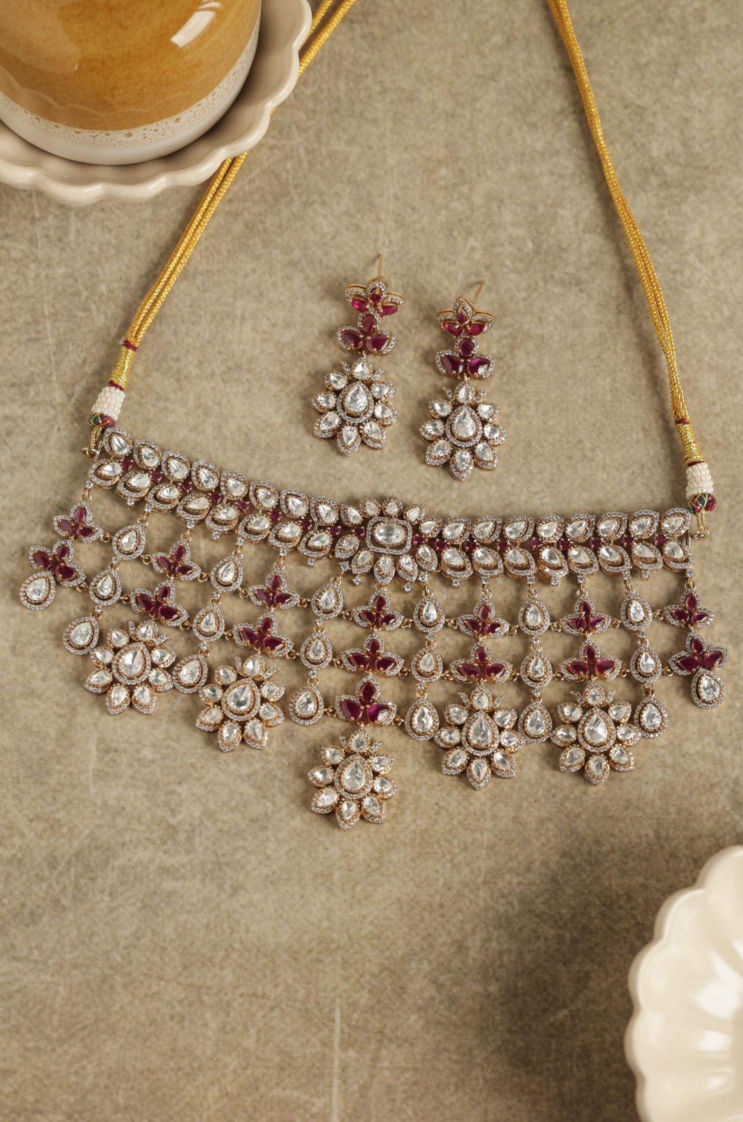 Enhance your jewelry ensemble with the Ishwari necklace set, adorned with finely crafted polkis that highlight exceptional craftsmanship. Accented by graceful pink garnet stones, this set radiates a subtle and enchanting elegance. Ideal for infusing your style with enduring refinement. Includes coordinating earrings.