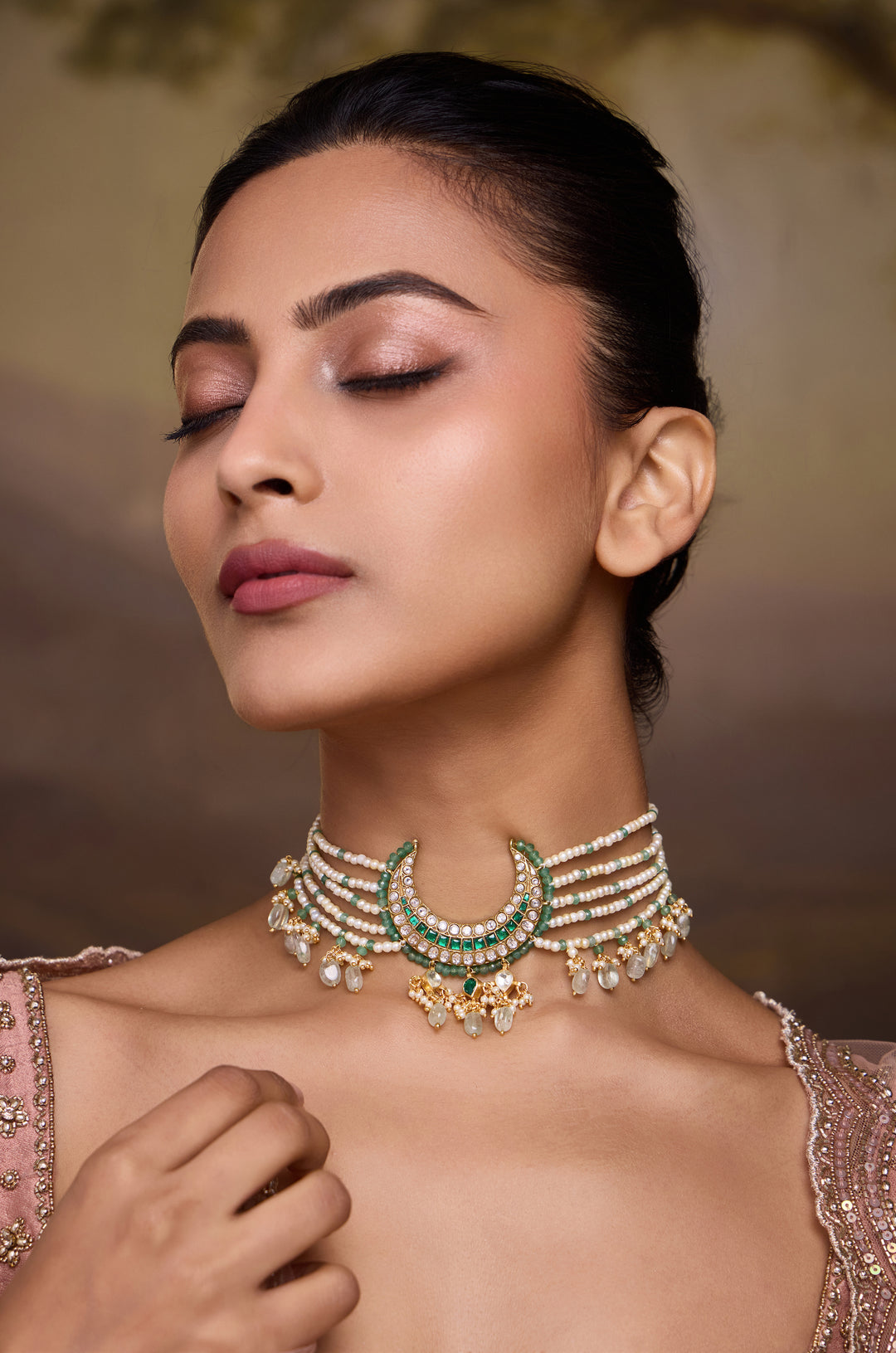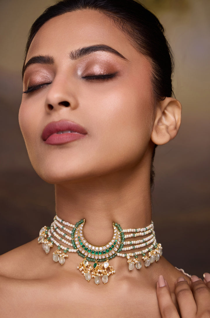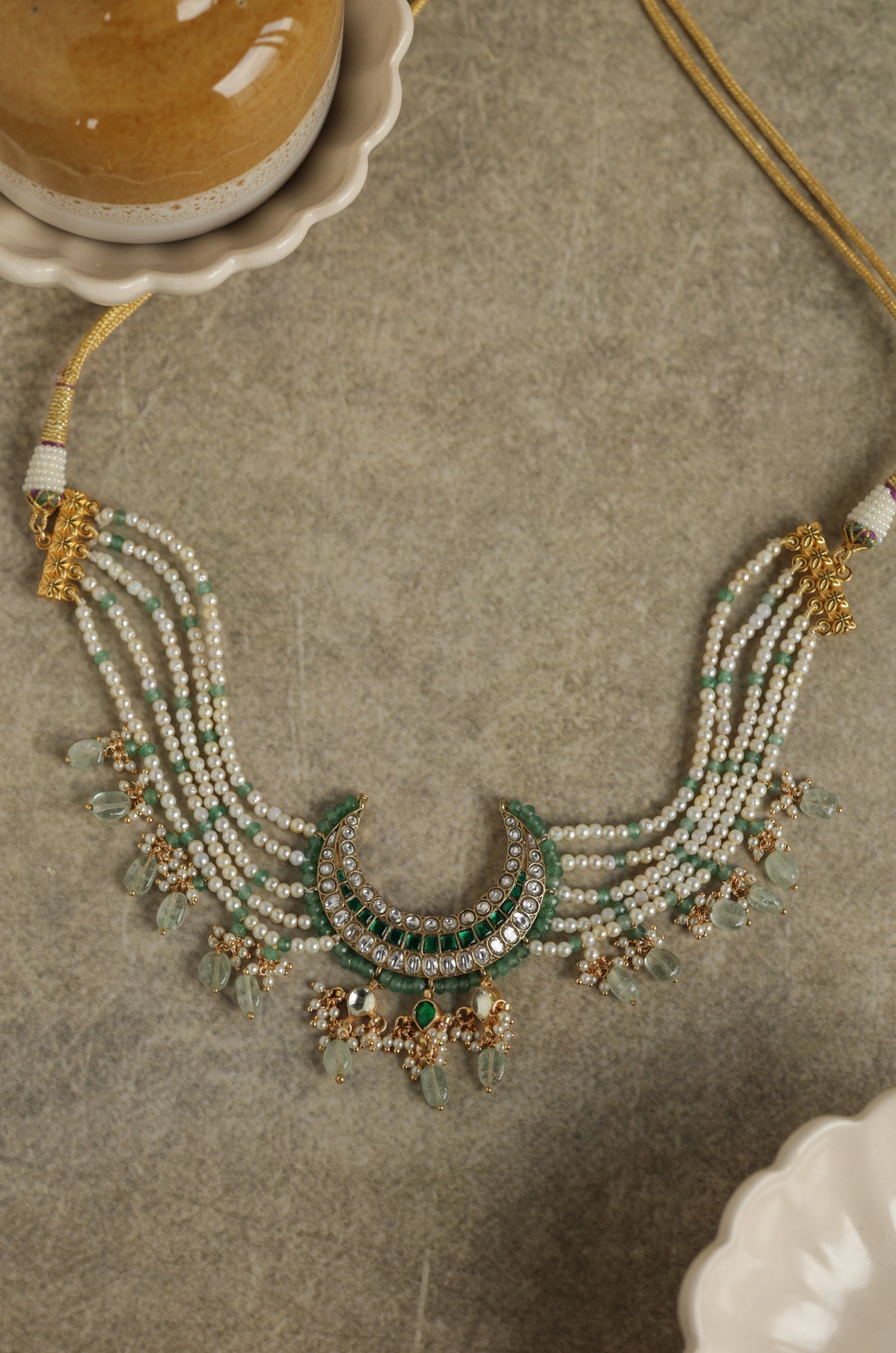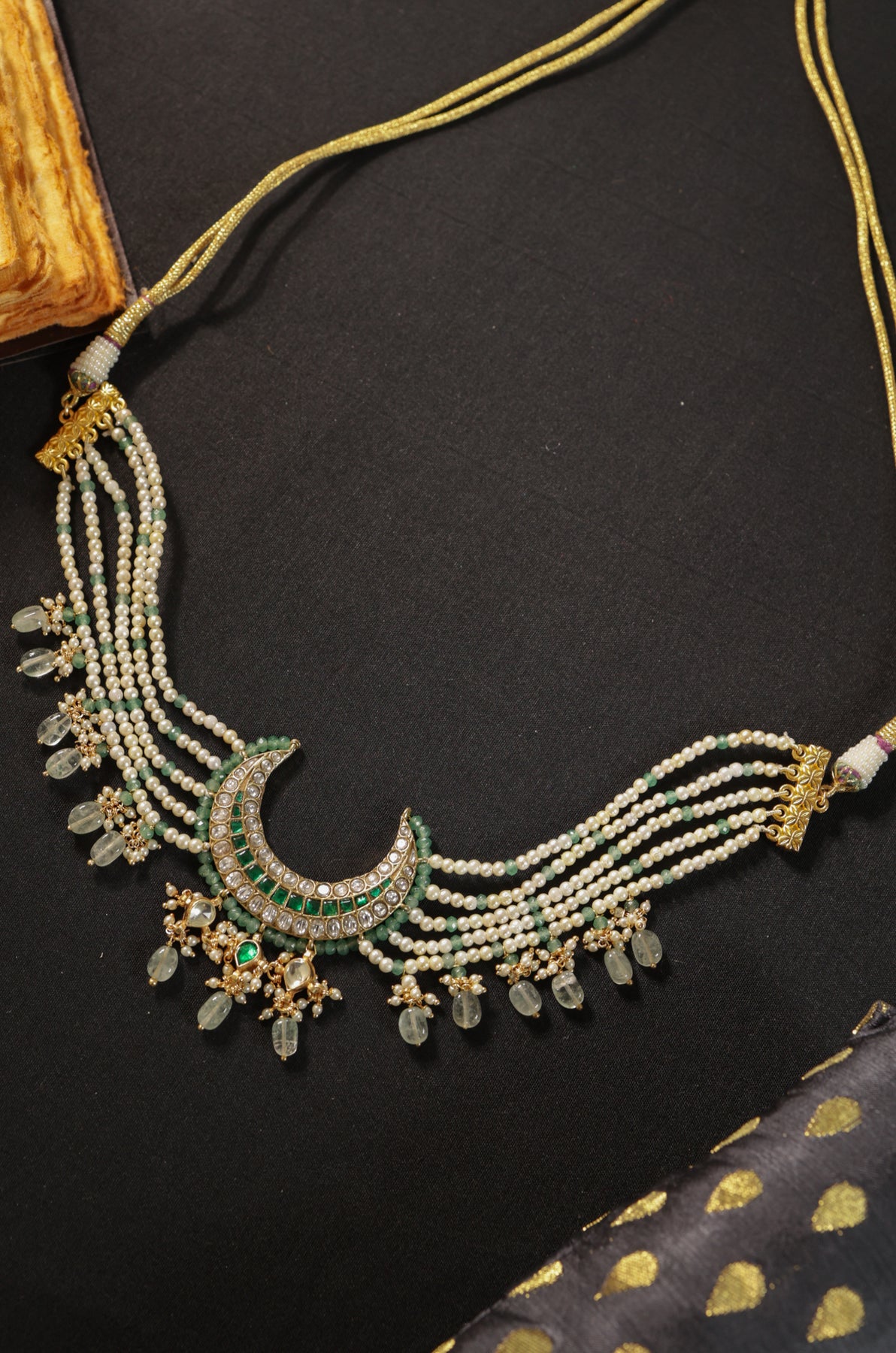 The Malaka necklace features a crescent motif with sparkling kundan stones and mint accents. Pearls and mint beads create a layered look, enhanced by gold-toned floral details and delicate drops that move gracefully. This elegant piece combines classic charm with refined style.