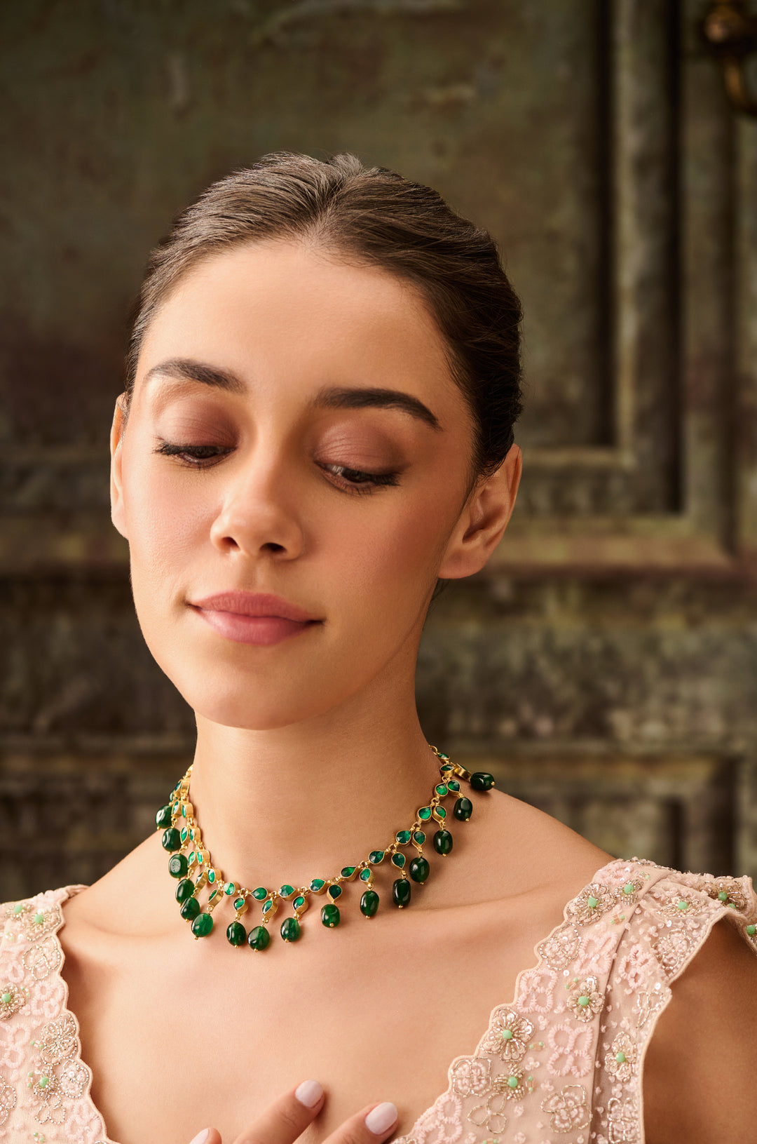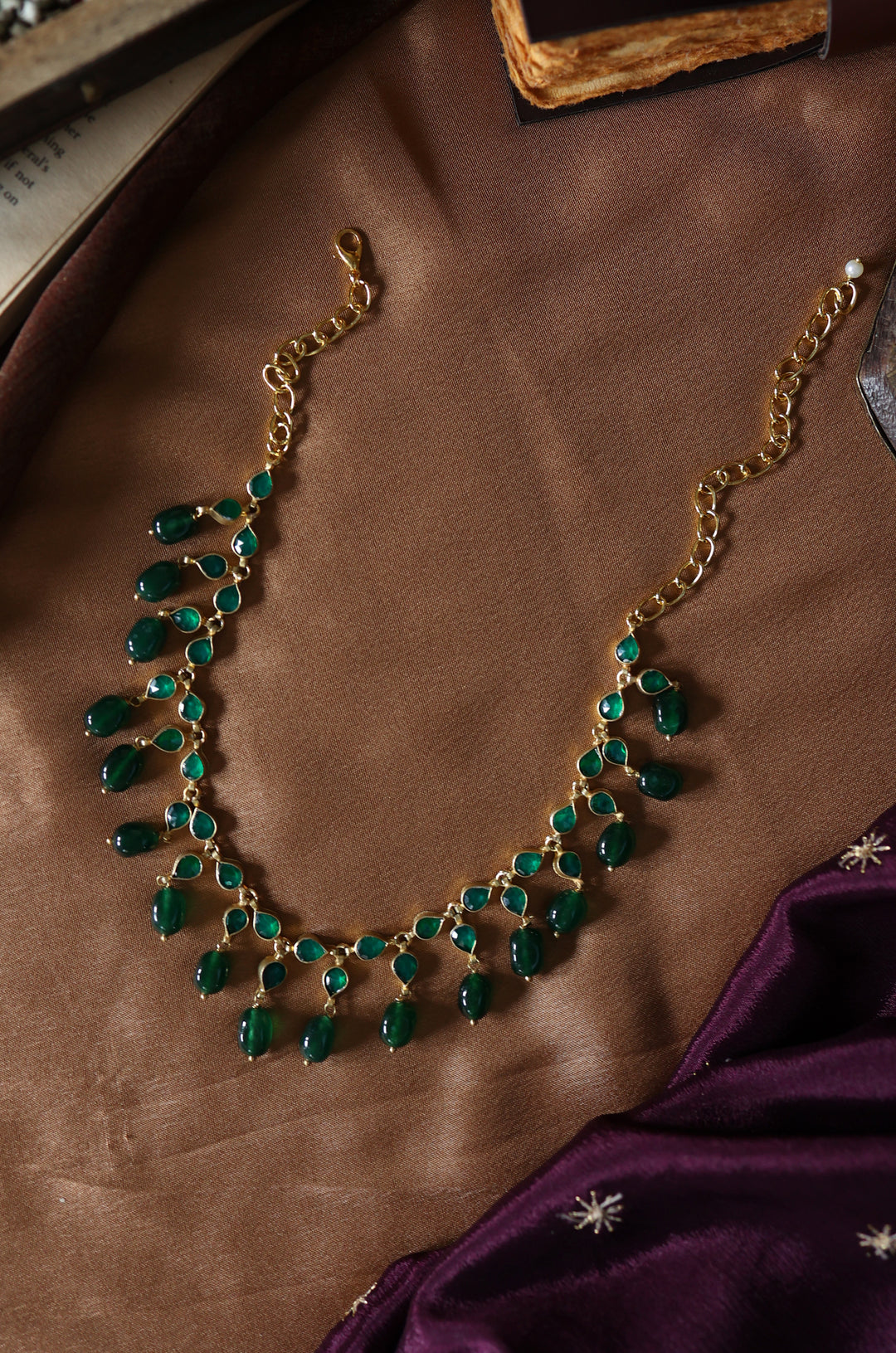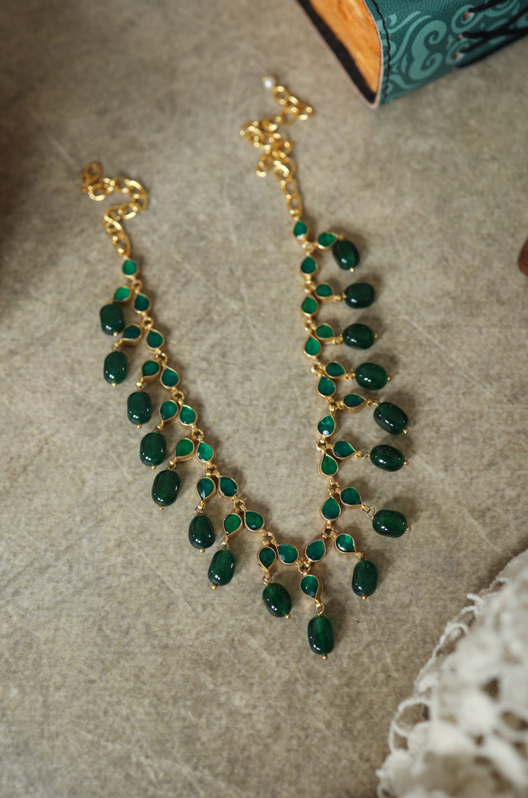 Make a statement with our modern masterpiece, featuring green kundan units expertly strewn together to create a show-stopping contemporary necklace. Highlighted with vibrant jade green stones, this sleek and sophisticated piece boasts a unique blend of traditional craftsmanship and modern style. Perfect for those who crave a fresh take on elegance, this necklace is sure to turn heads