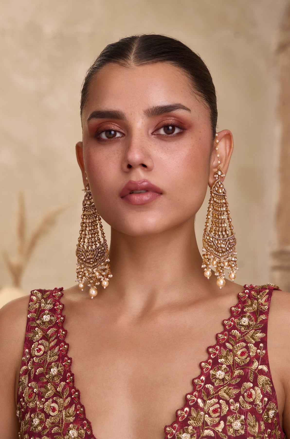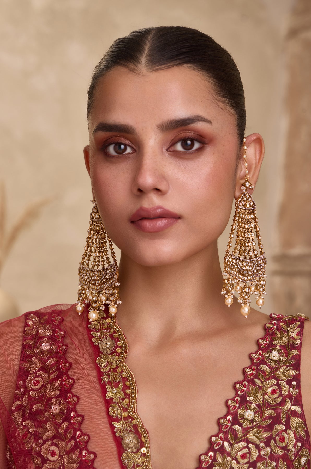 Elevate your ensemble with the Meera earrings, featuring intricate polki craftsmanship in a timeless passa style. These elegant earrings blend traditional artistry with refined charm, perfect for special occasions or to lend a touch of sophistication to your look. Their exquisite detailing and radiant finish ensure a poised and elegant statement.