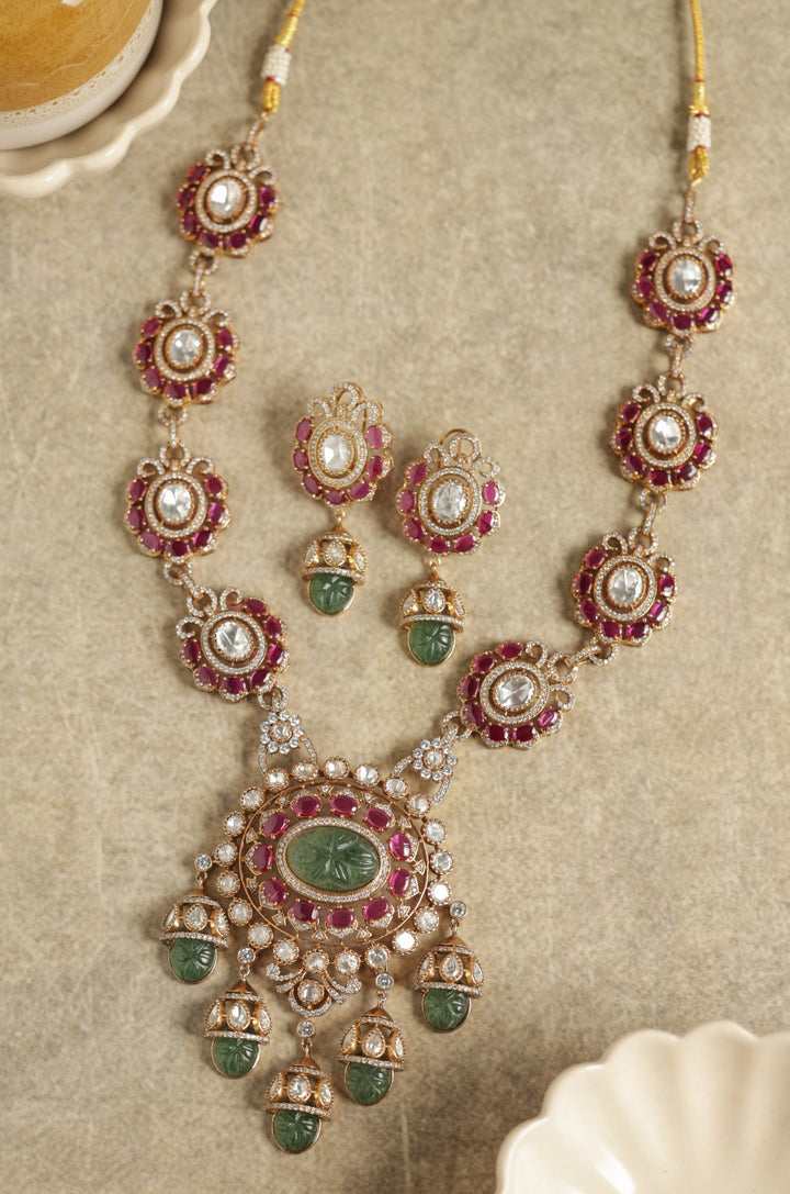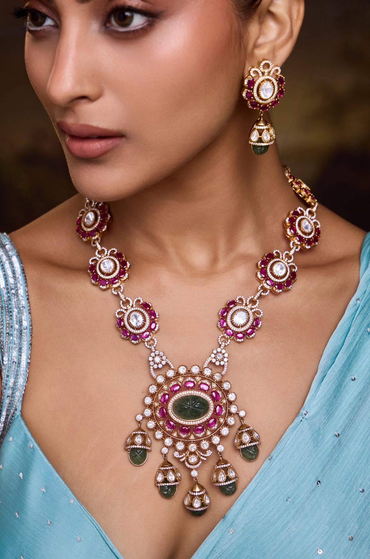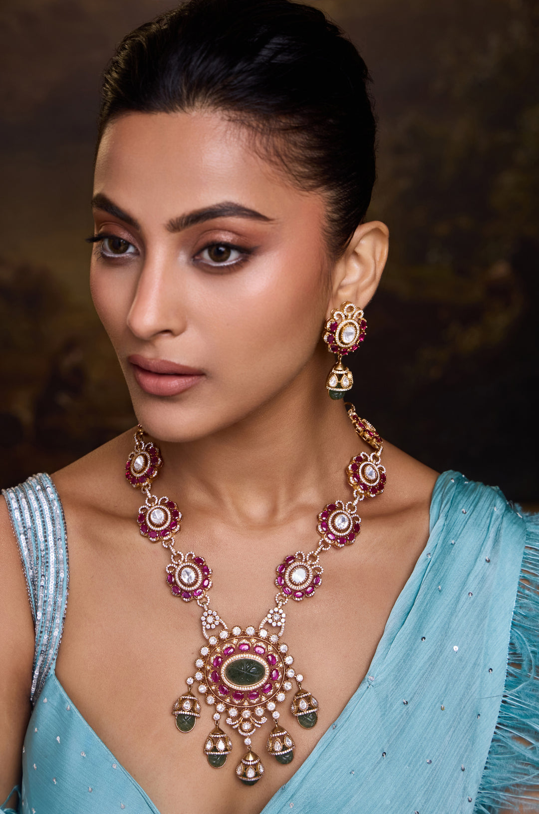 This exquisite necklace set features a harmonious blend of pink garnet stones, sparkling polkis, and intricately carved fluorite mint drops, exuding an air of royal elegance. Symmetrical medallion designs flow elegantly along the neckline, culminating in a striking, large pendant reminiscent of regal portraits. The matching earrings mirror this grandeur, adorned with delicate mint drops that shimmer like morning dew in a mystical forest.