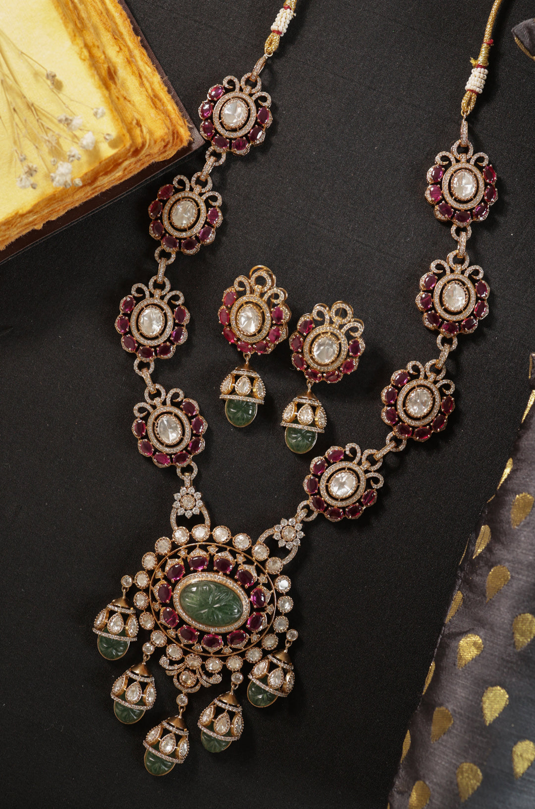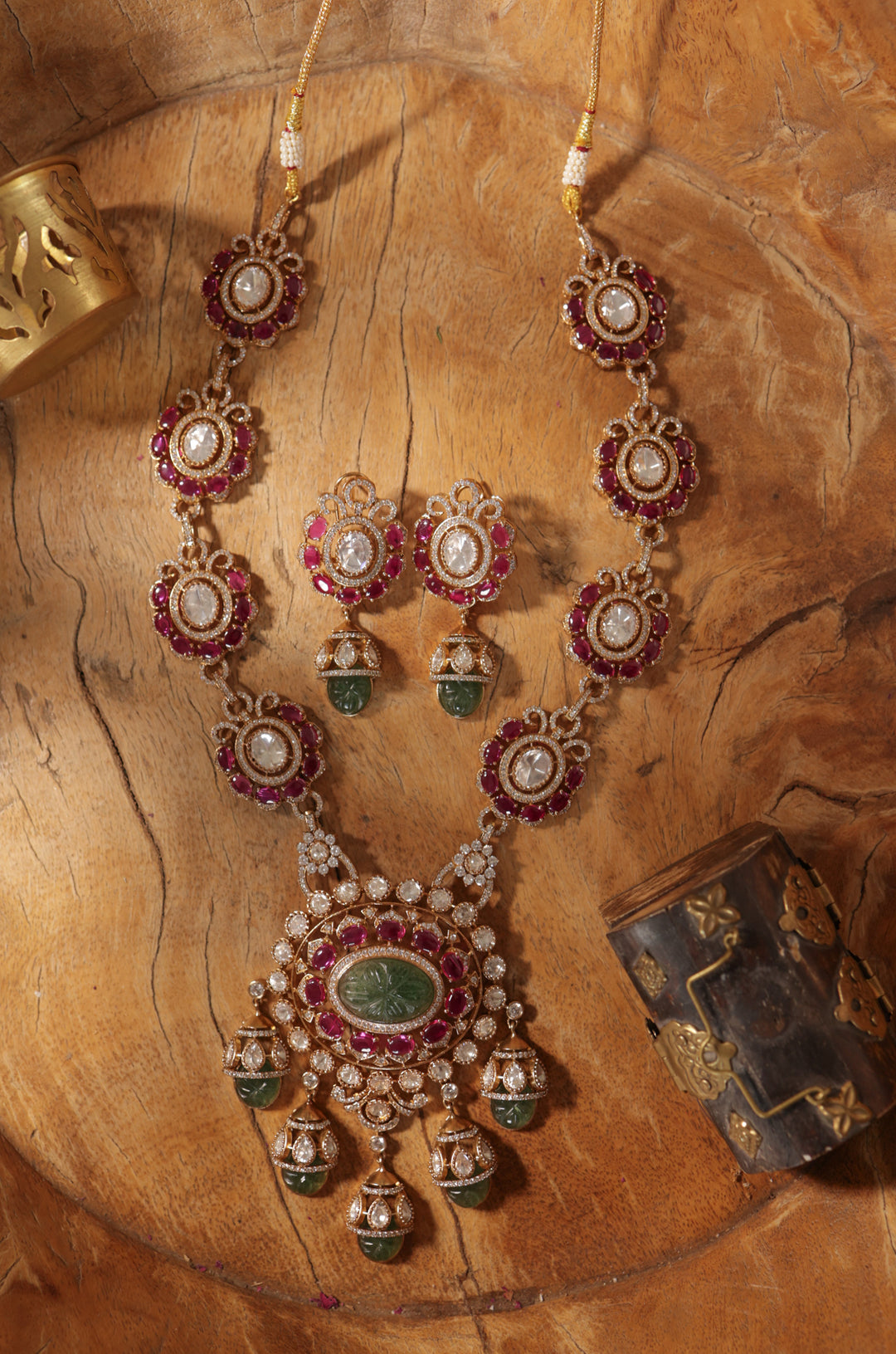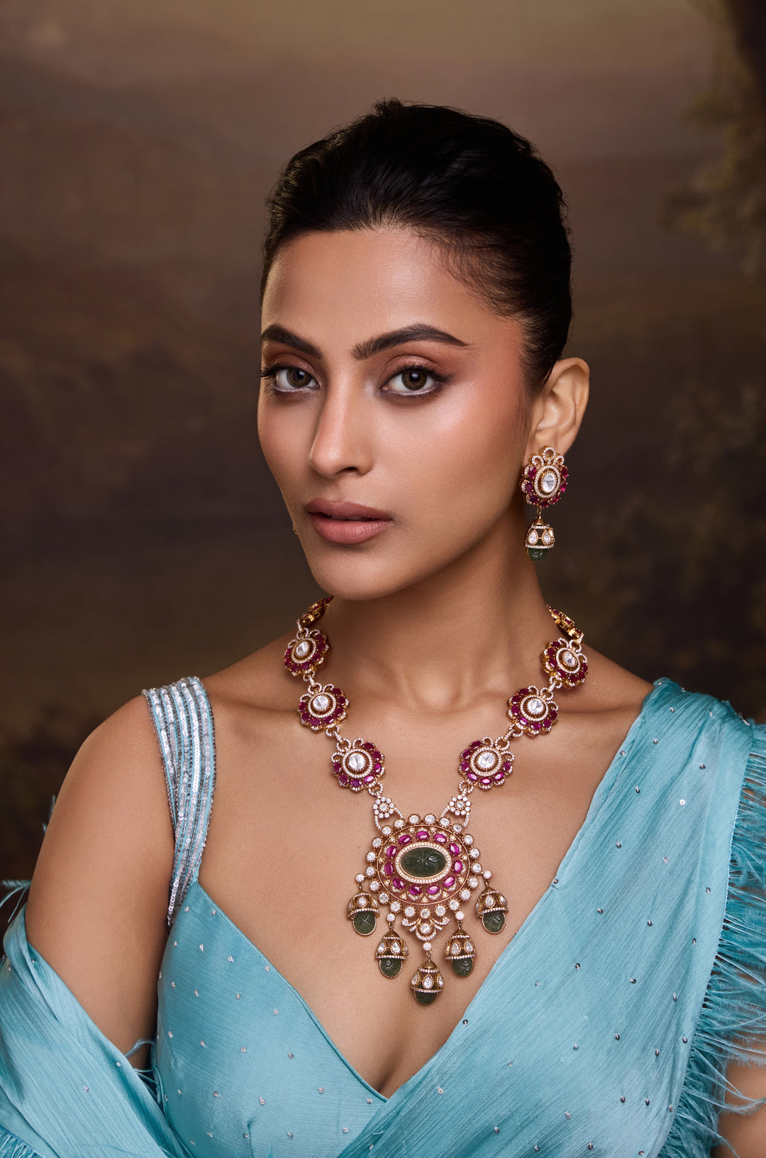 This exquisite necklace set features a harmonious blend of pink garnet stones, sparkling polkis, and intricately carved fluorite mint drops, exuding an air of royal elegance. Symmetrical medallion designs flow elegantly along the neckline, culminating in a striking, large pendant reminiscent of regal portraits. The matching earrings mirror this grandeur, adorned with delicate mint drops that shimmer like morning dew in a mystical forest.