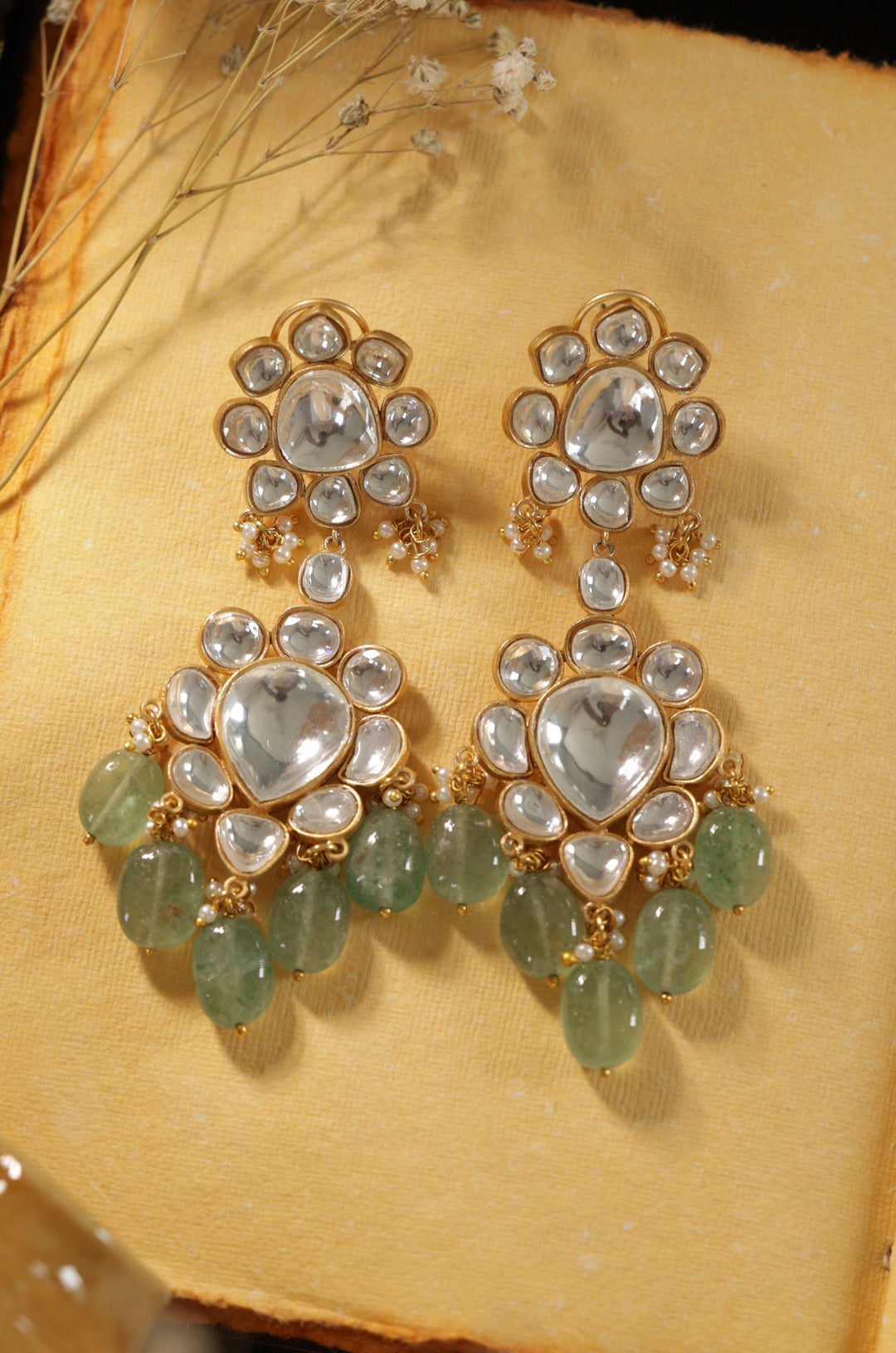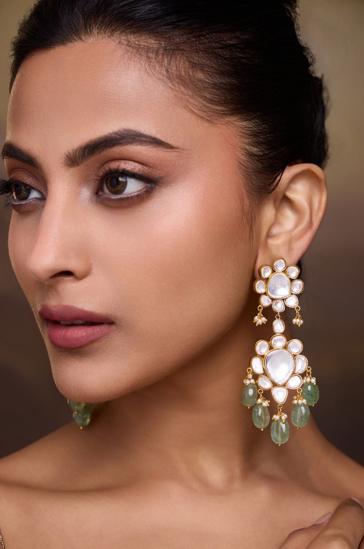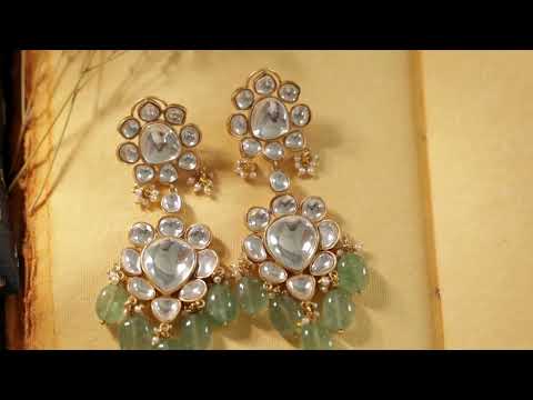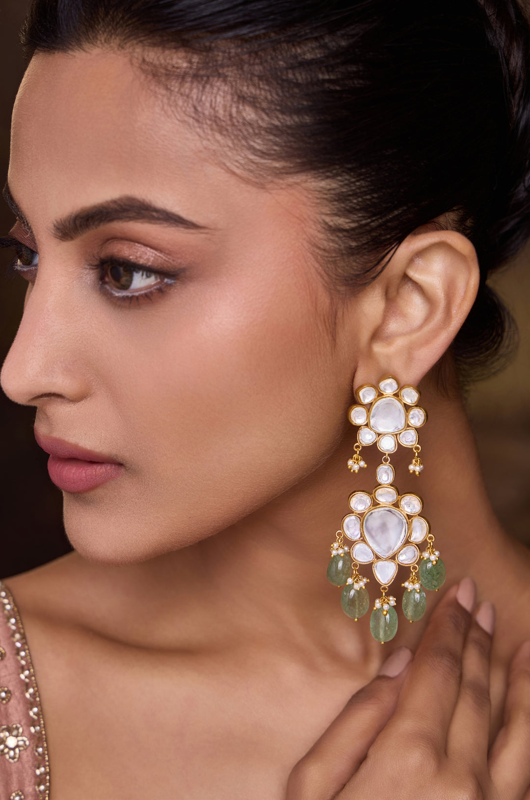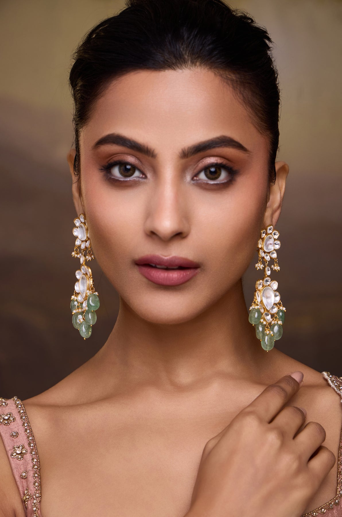 Elevate your elegance with the Pritha earrings, featuring a contemporary floral design intricately encrusted with traditional polki stones. Highlighted by the subtle glow of fluorite stones, these earrings blend classic craftsmanship with modern sophistication, perfect for adding a refined touch to any ensemble.