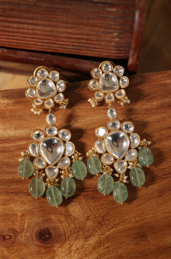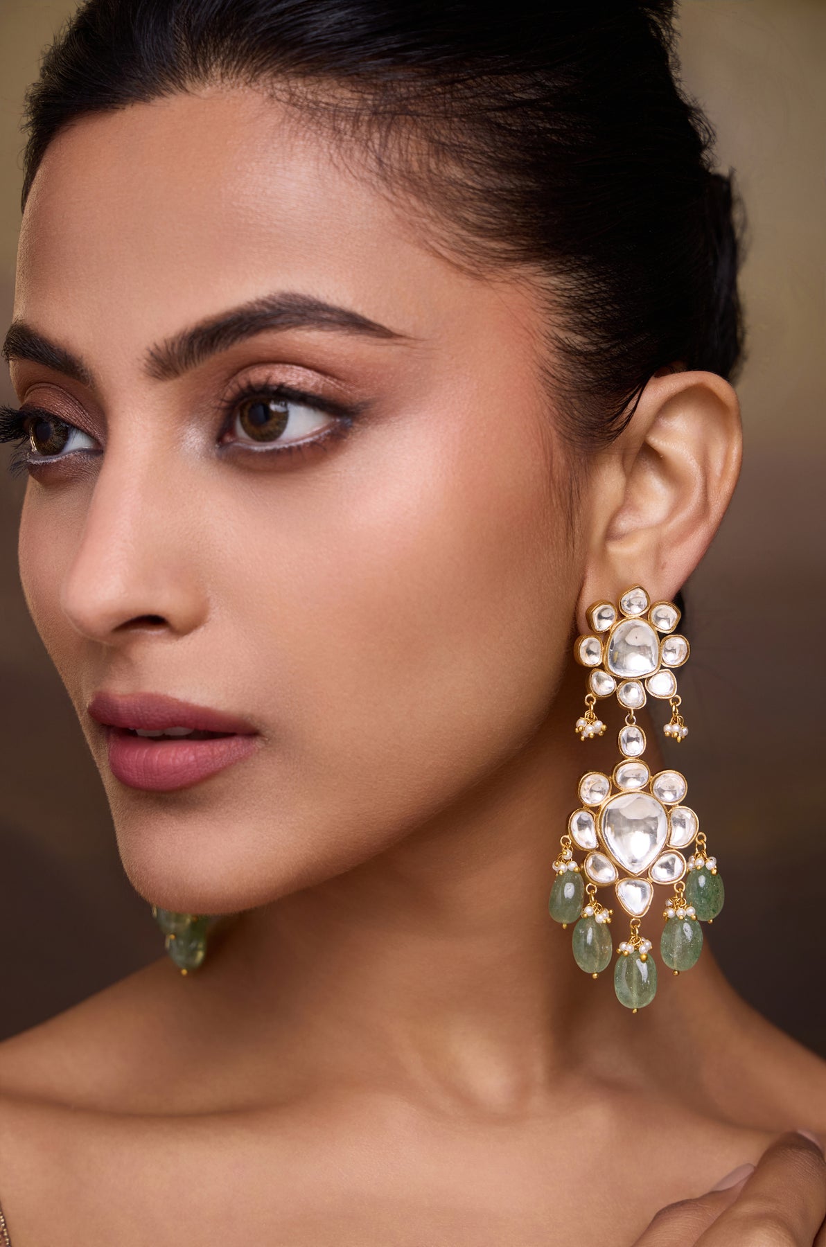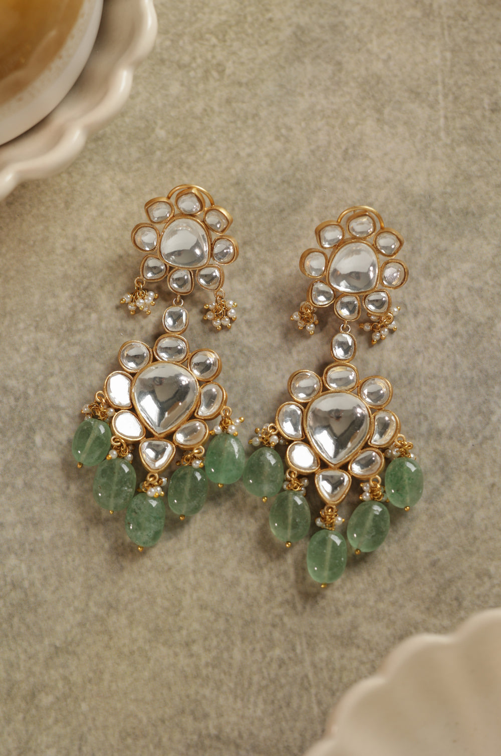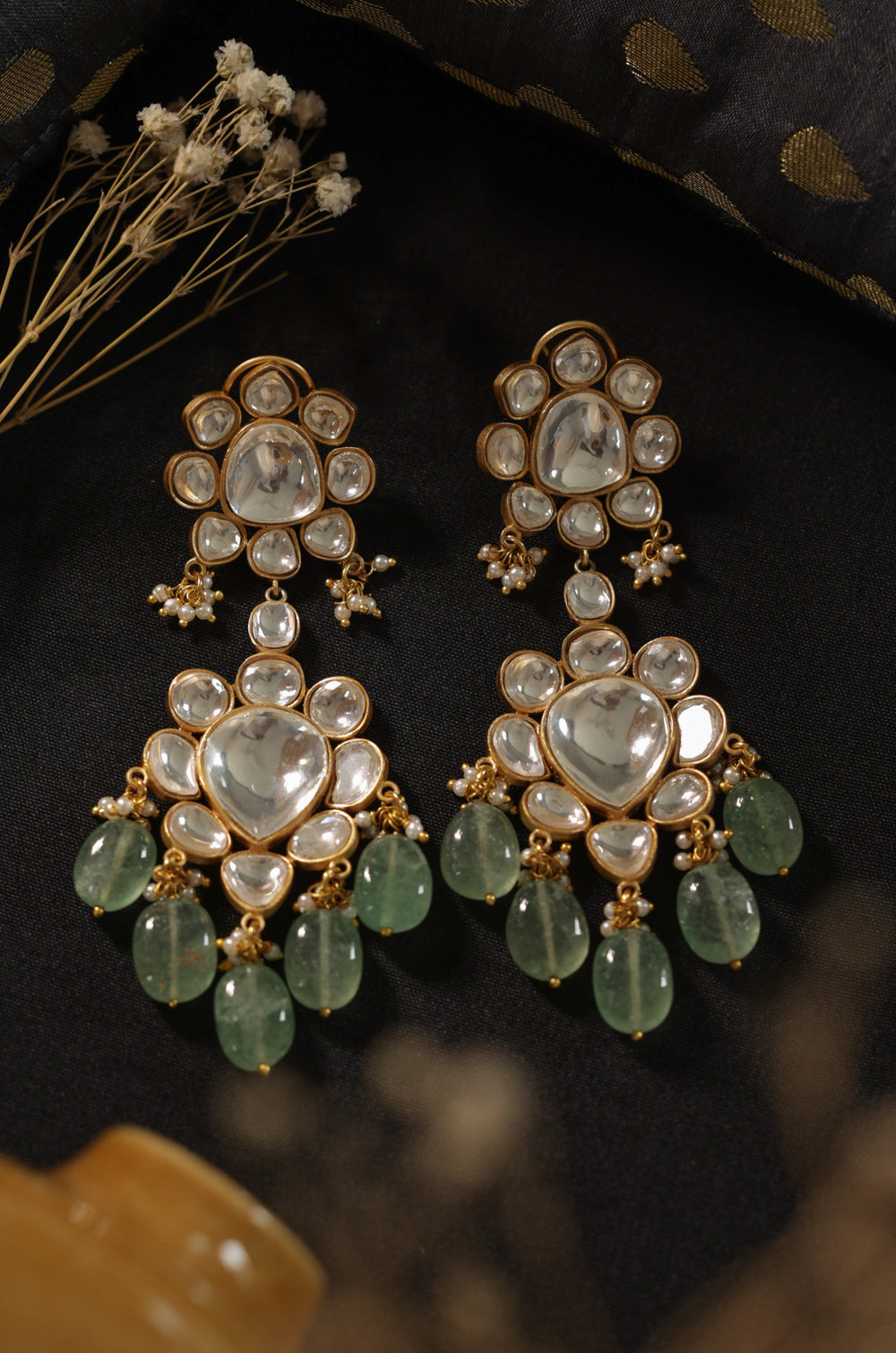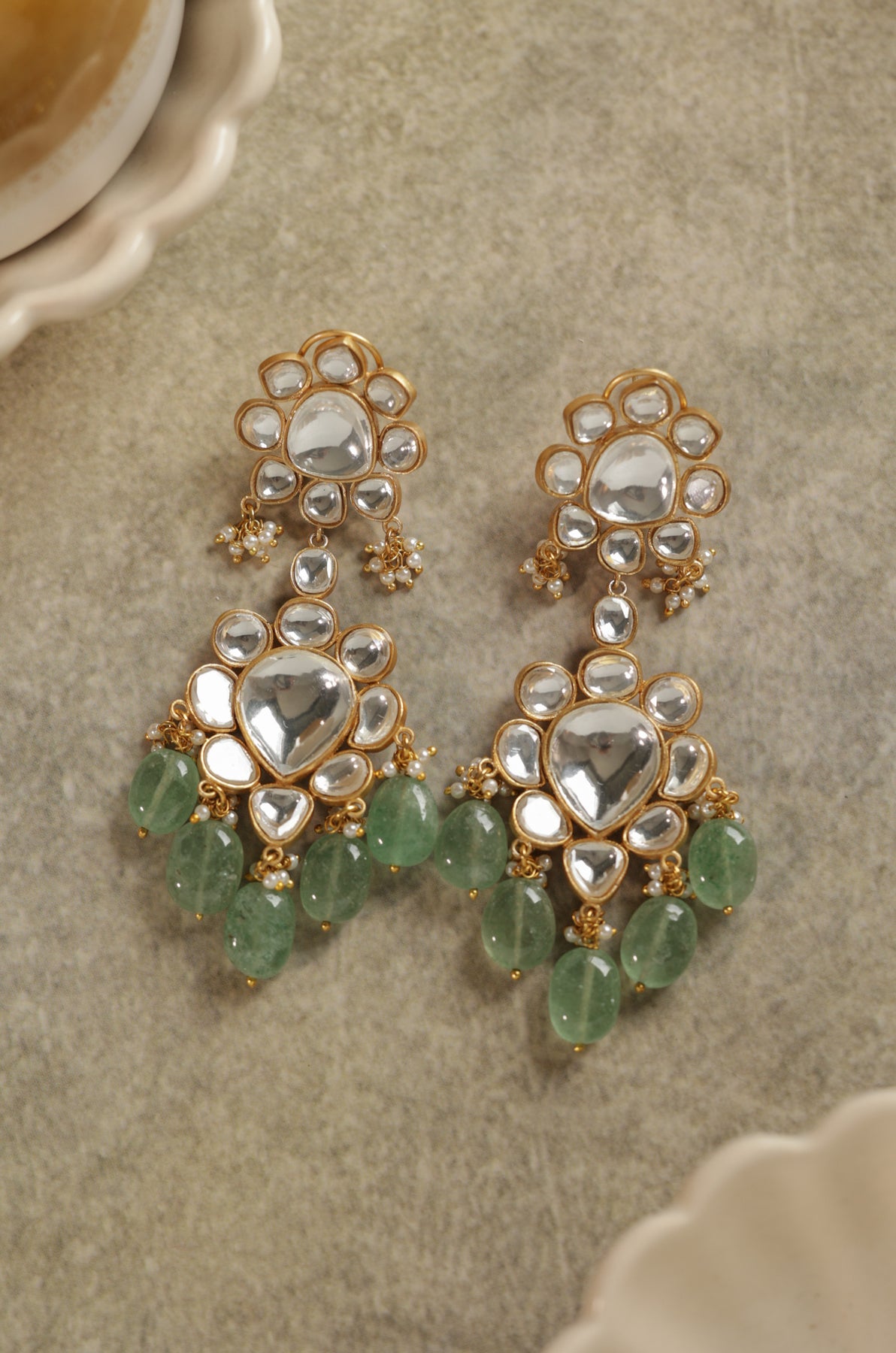 Elevate your elegance with the Pritha earrings, featuring a contemporary floral design intricately encrusted with traditional polki stones. Highlighted by the subtle glow of fluorite stones, these earrings blend classic craftsmanship with modern sophistication, perfect for adding a refined touch to any ensemble.