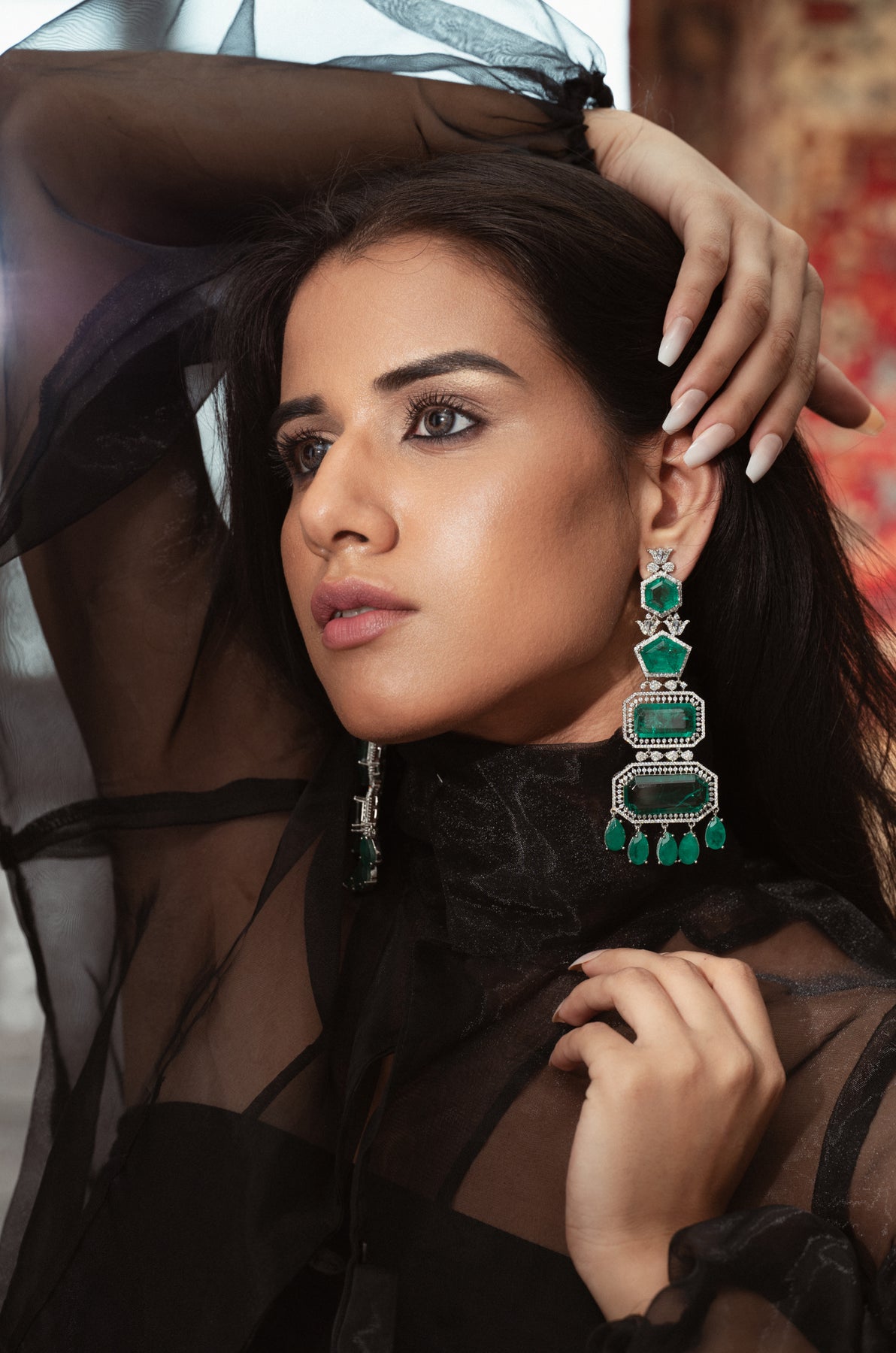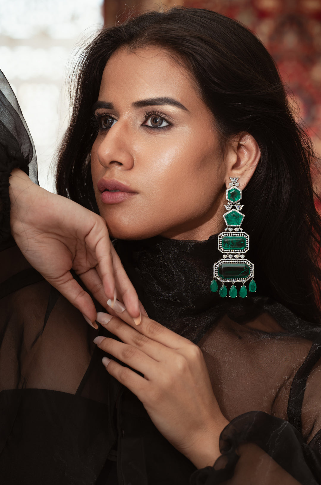 Enhance your outfit with our Oaklynn earrings. These statement earrings are encrusted with sparkling cubic zirconia and adorned with beautiful green crystals, adding a touch of elegance to any look. Perfect for formal events or adding a pop of color to your everyday style.