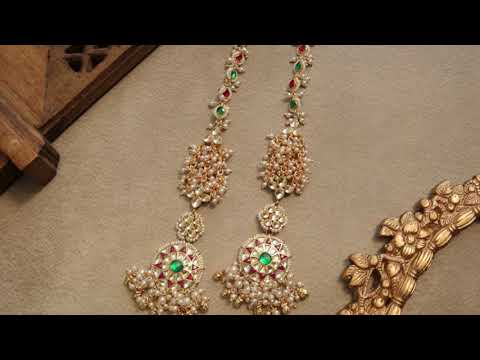 The Prisha earrings are a captivating blend of tradition and artistry. Delicate floral motifs, meticulously crafted with Kundan stones, gracefully adorn the ear. A cascade of lustrous pearls adds a touch of classic elegance. The showstopper is the intricate ear chain, featuring vibrant pink and green teardrop Kundans that catch the light with every movement. At the base, delicate pearl hangings sway gently, accompanied by the enchanting chime of ghungroos, creating a mesmerizing symphony with every step you take.