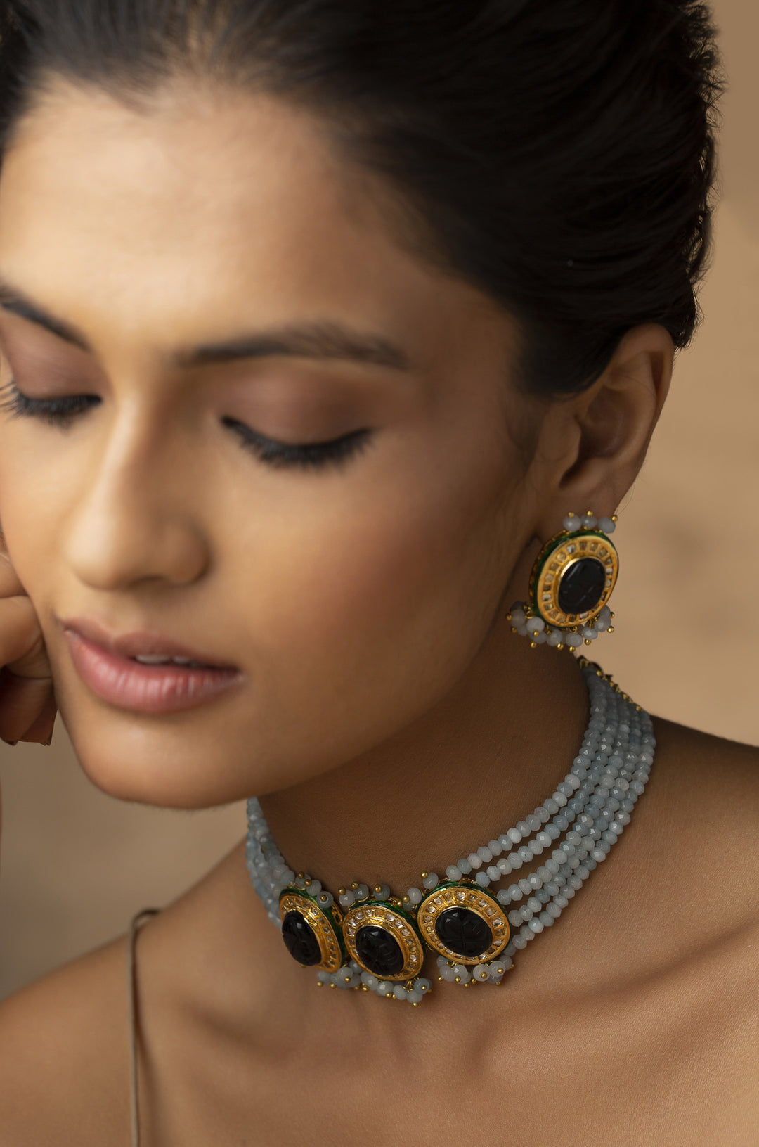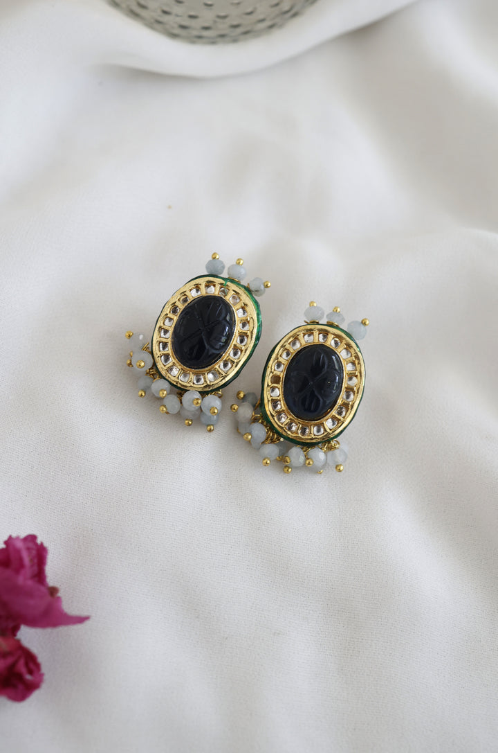 The Purvi necklace set is the epitome of opulence and charm. Nature-inspired kundan necklace set is an epode to the rich culture of India. The drooling turquoise stones hanging below the necklace are embedded with hand-carved blue stones to bring together the blend of authentic traditions.