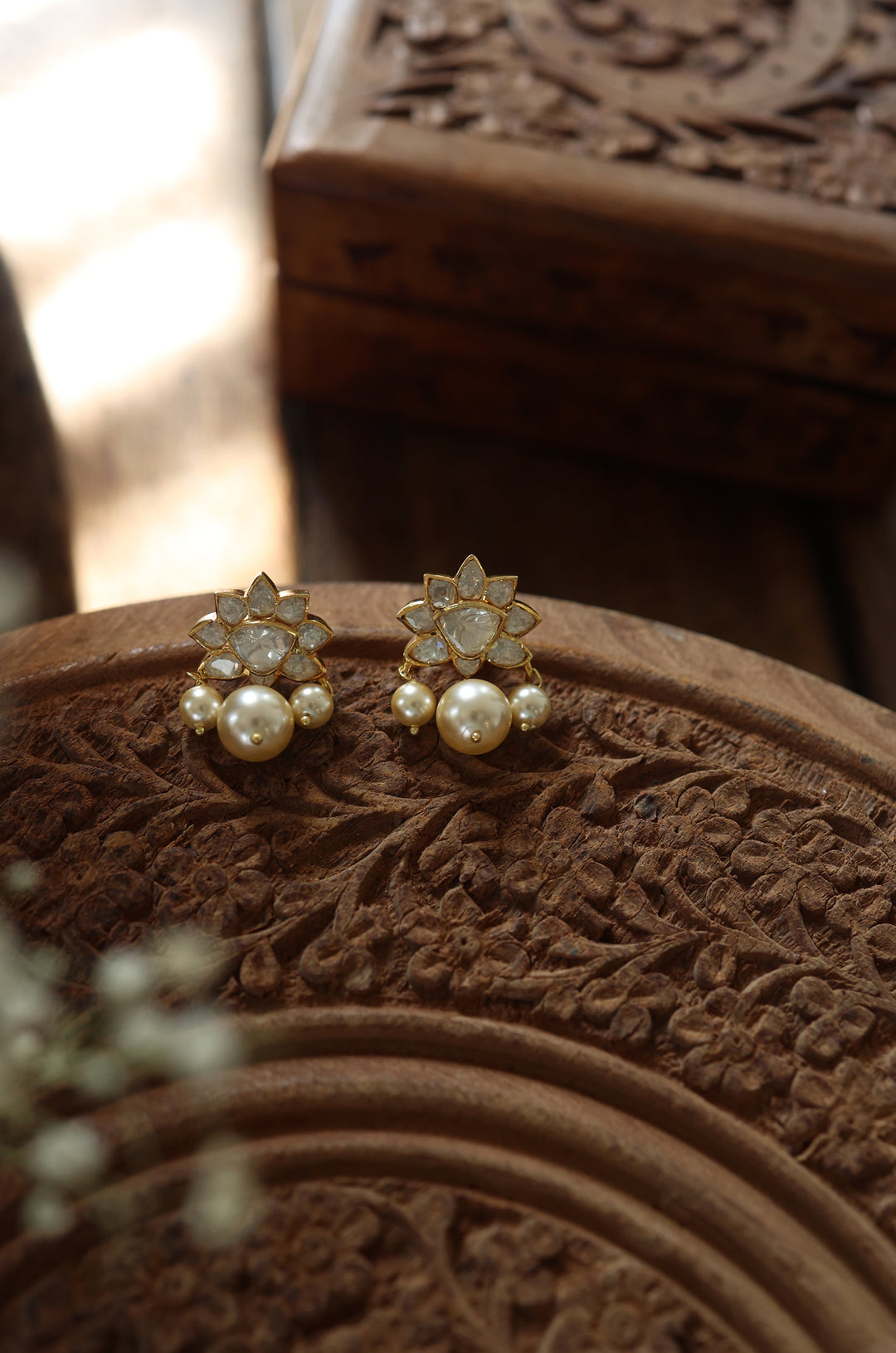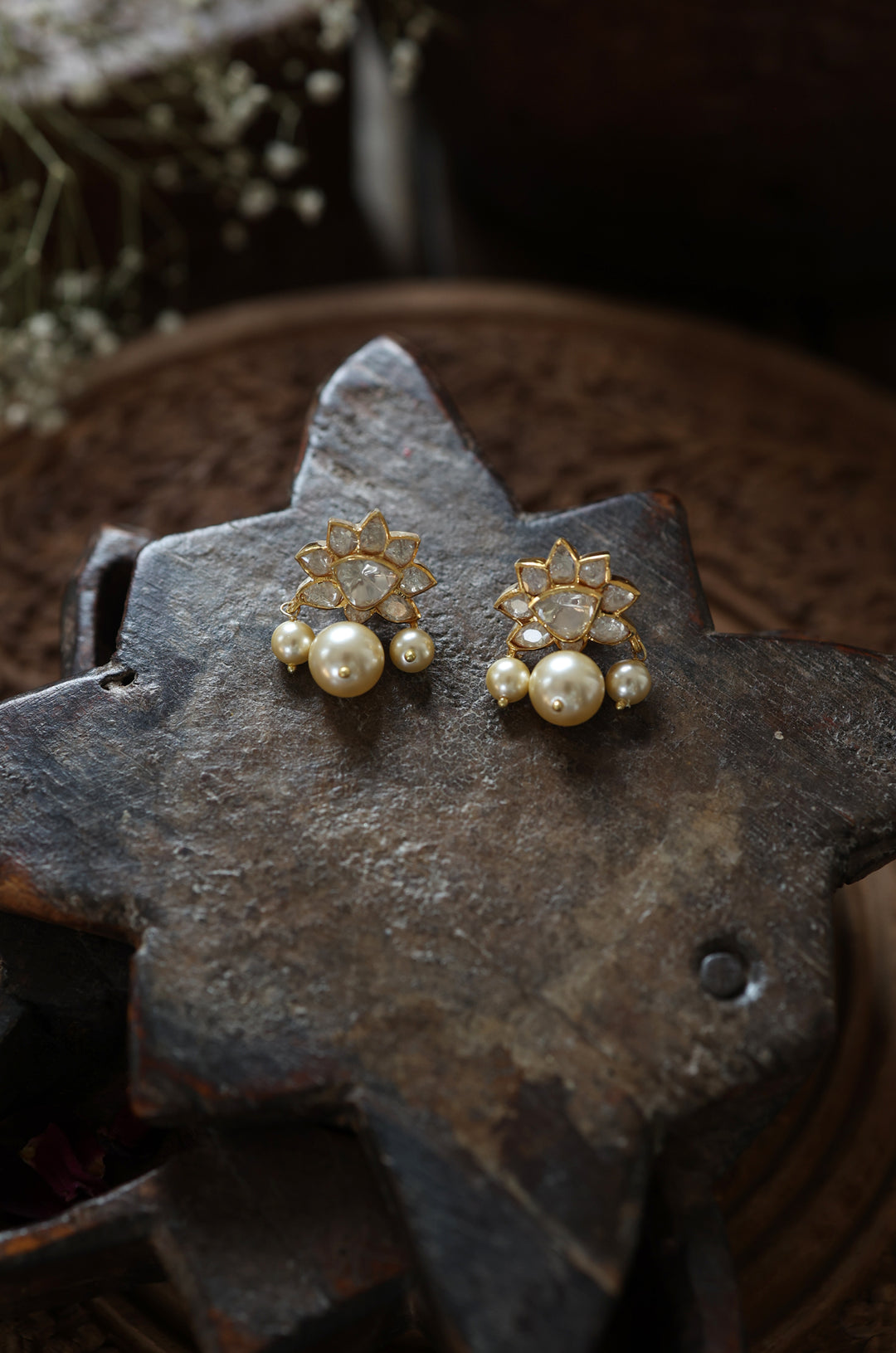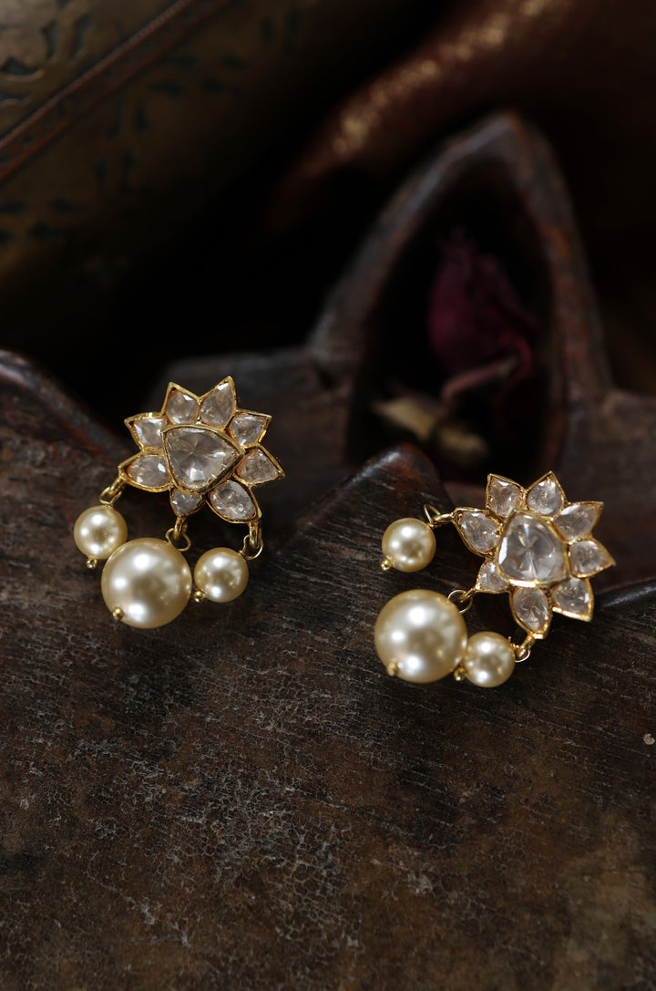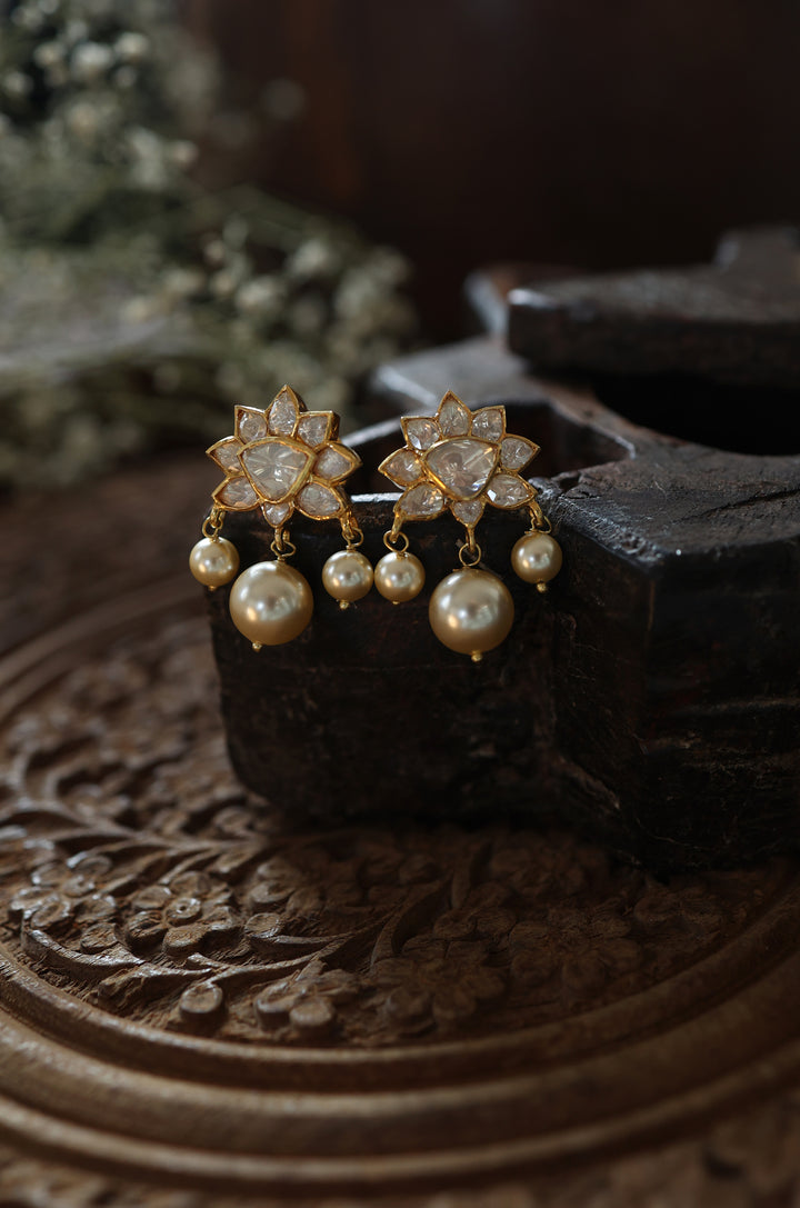 Experience timeless elegance with the Qaram earrings. Crafted with pure silver and adorned with sparkling moissanite polkis, these earrings exude a serene and sophisticated aura. The delicate flower motif and dangling pearls add a touch of graceful enchantment to your look. Perfect for those who appreciate beauty and timeless treasures.