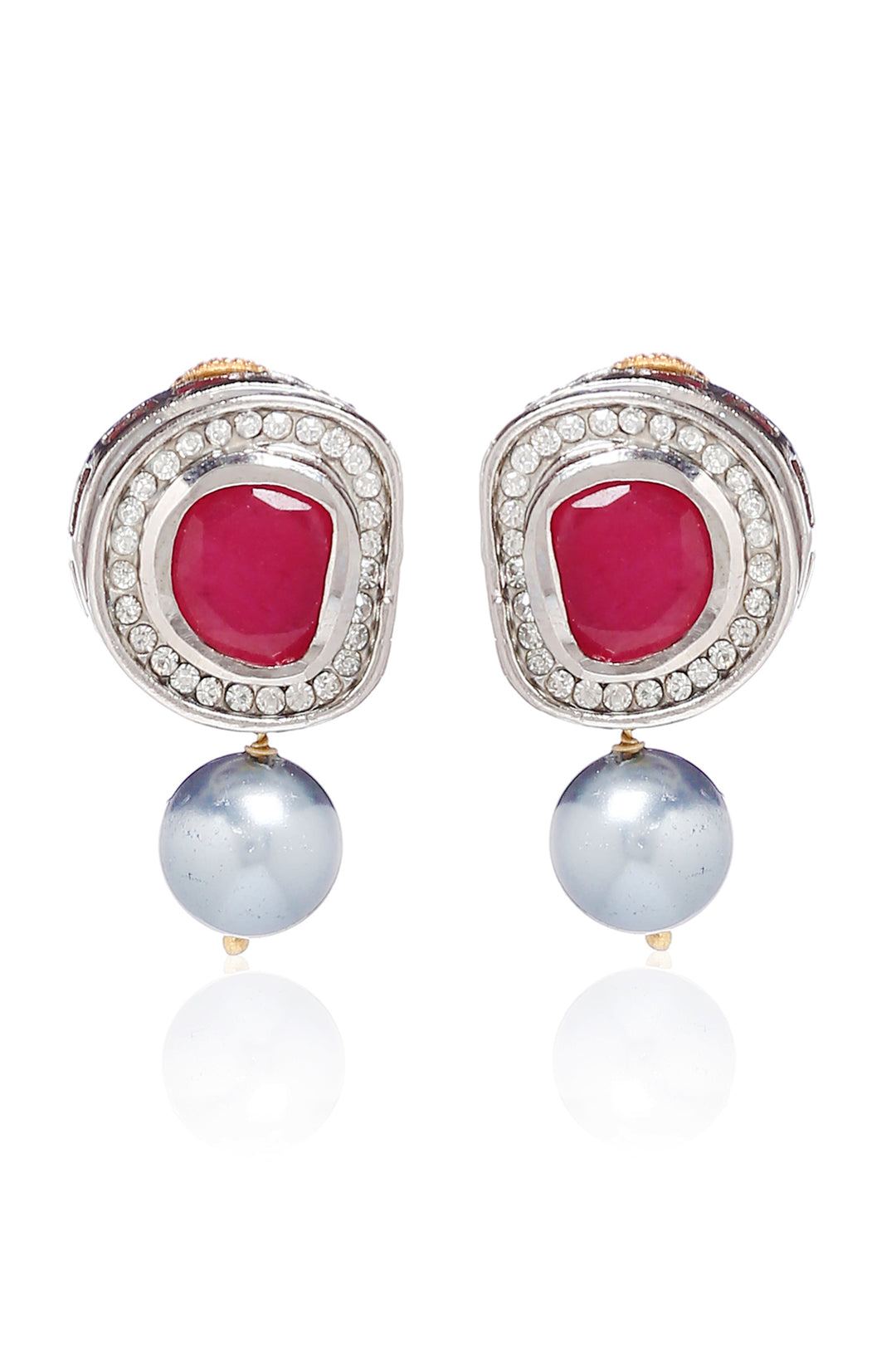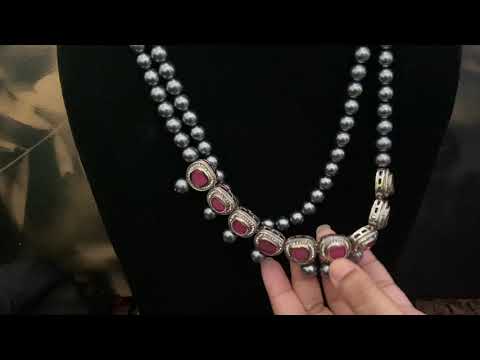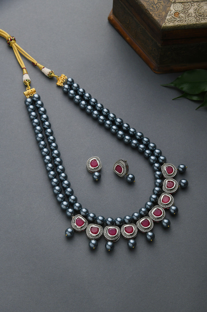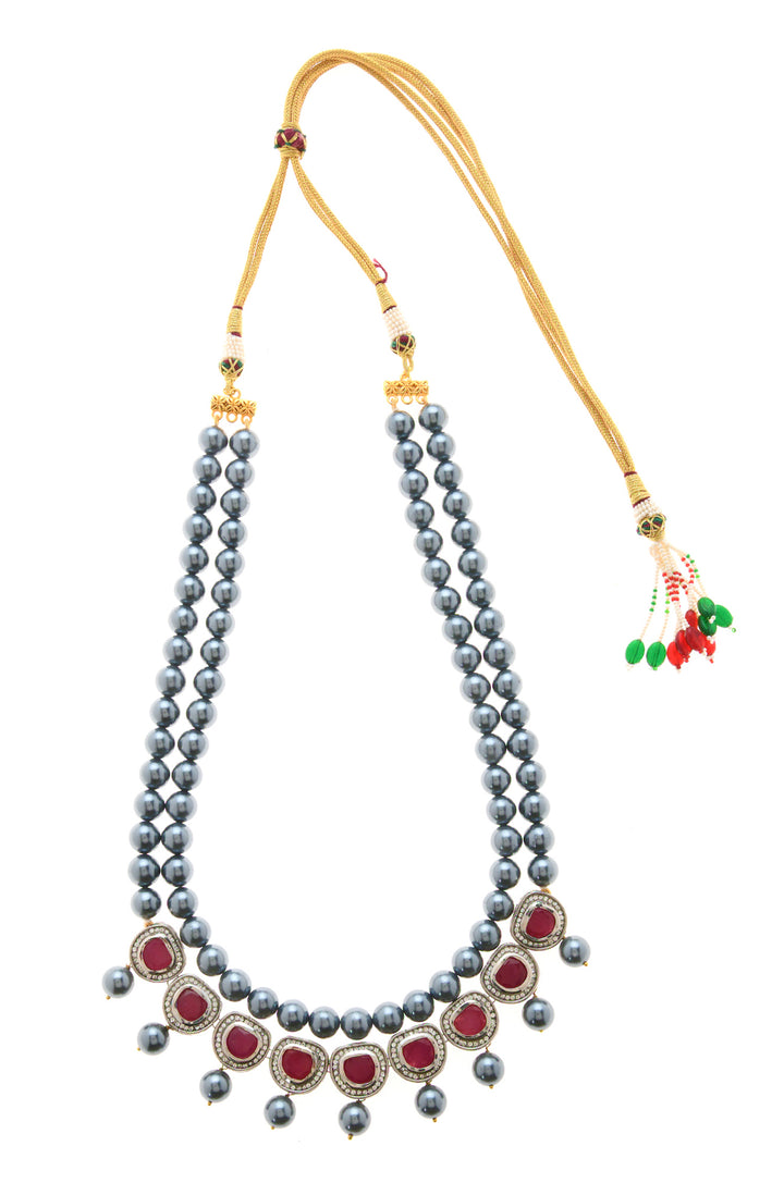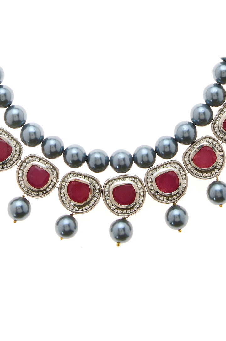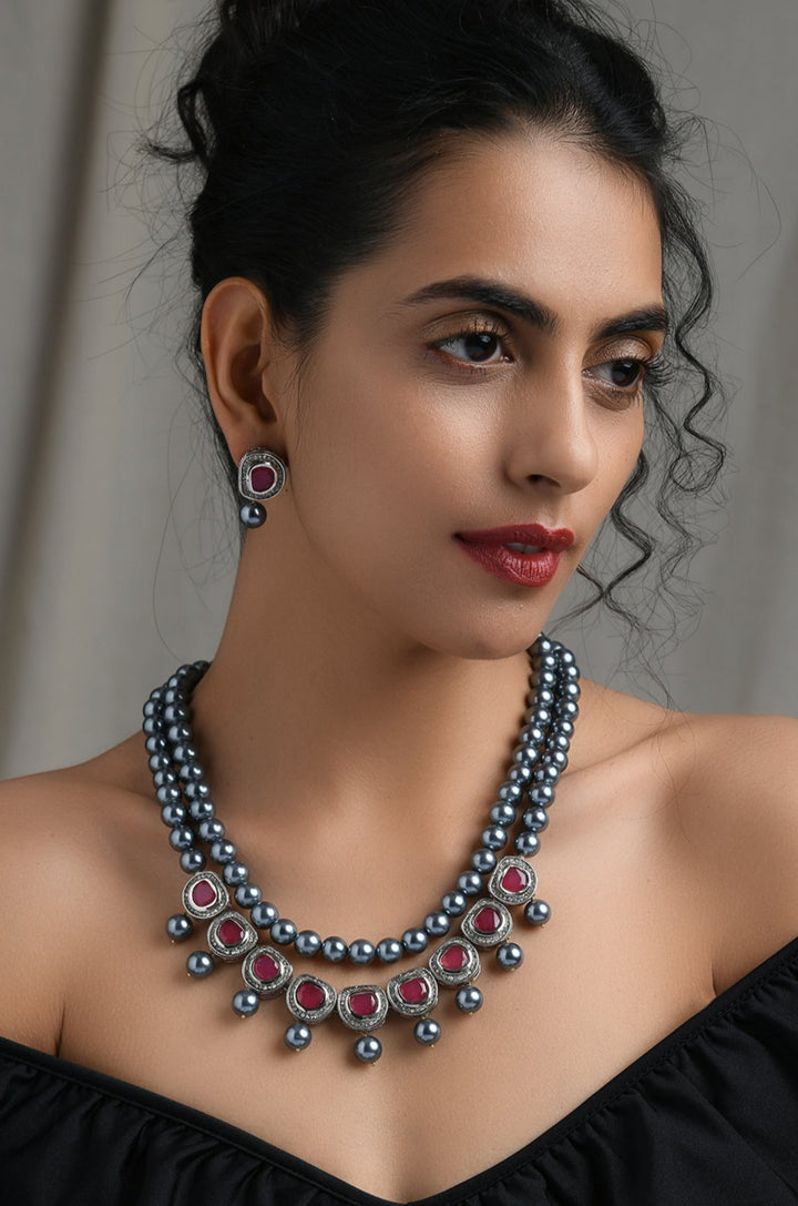 The Ria necklace set showcases a contemporary design with a bold color scheme and abundant shimmer. The pearl pattern is adorned with red polki and cubic zirconia, exuding elegance and sophistication..