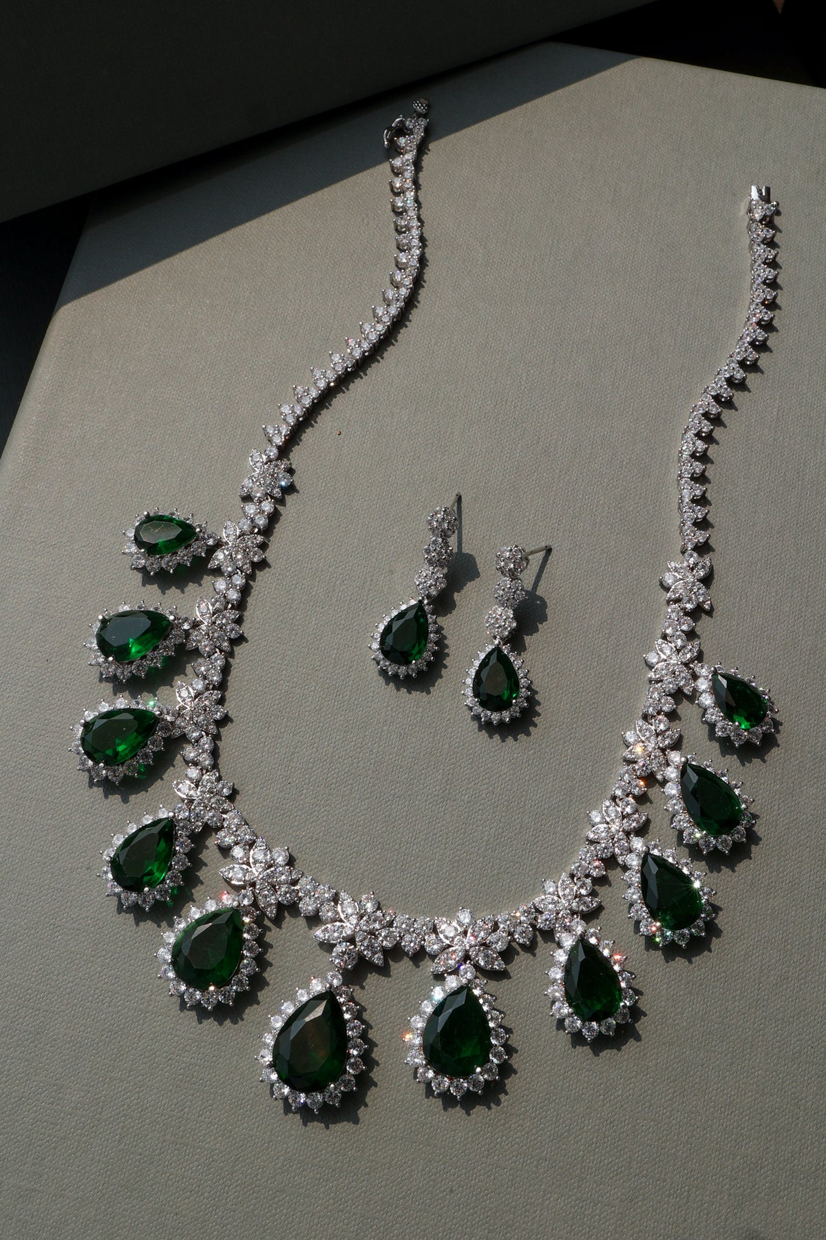 Featuring zircons for a touch of glamour and teardrop-shaped green crystals, this set is designed to add a sophisticated sparkle to any outfit. The matching earrings perfectly complement the necklace, ensuring a cohesive and elegant look.