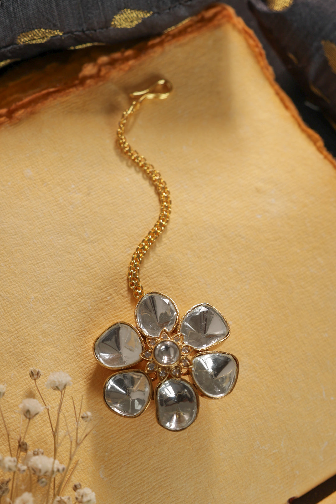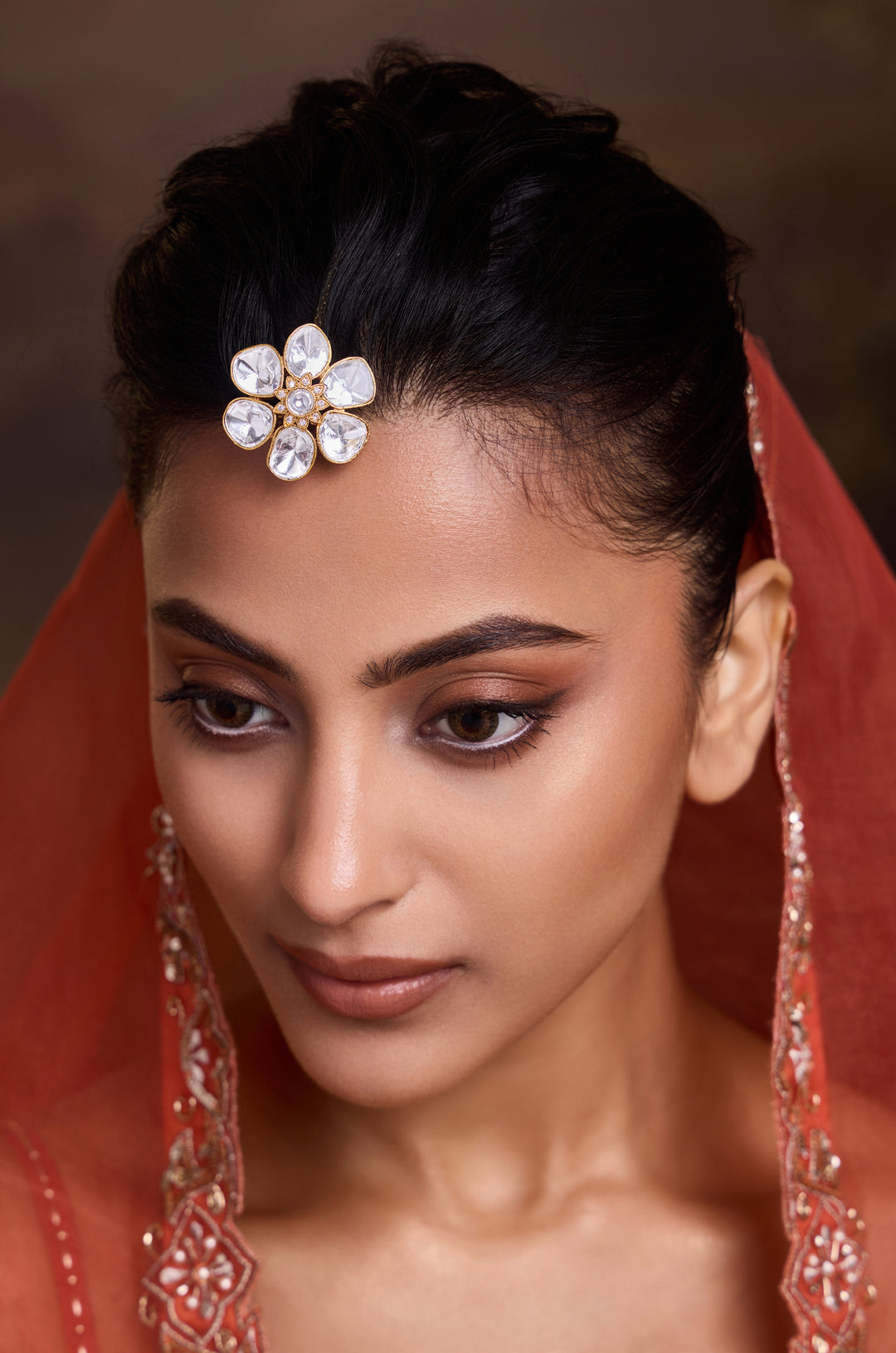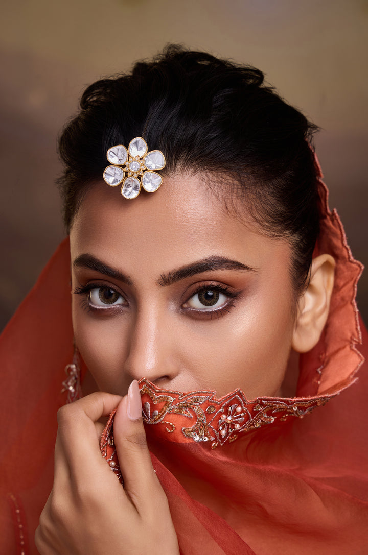 Delicate and regal, Saanjh maangtikka is a radiant expression of traditional beauty. Designed in a graceful floral shape, it features finely cut polki stones set in a gold base that catches the light with every movement. Perfect for bridal wear or festive occasions, this maangtikka brings a touch of elegance and charm to your ensemble, effortlessly highlighting your forehead with its timeless allure.