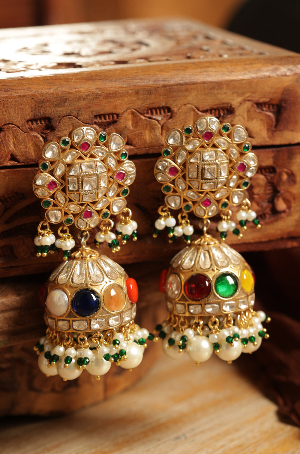 The Saanvi earrings are a timeless treasure, crafted from fine silver and embellished with exquisite navrattan stones. Their traditional design reflects rich heritage, making them an heirloom-worthy accessory that adds refined elegance to any special occasion.