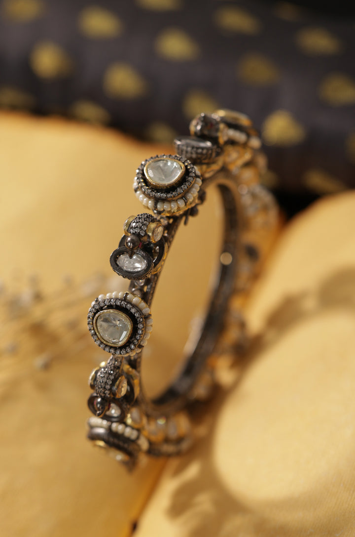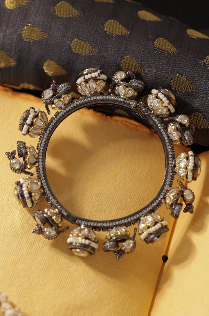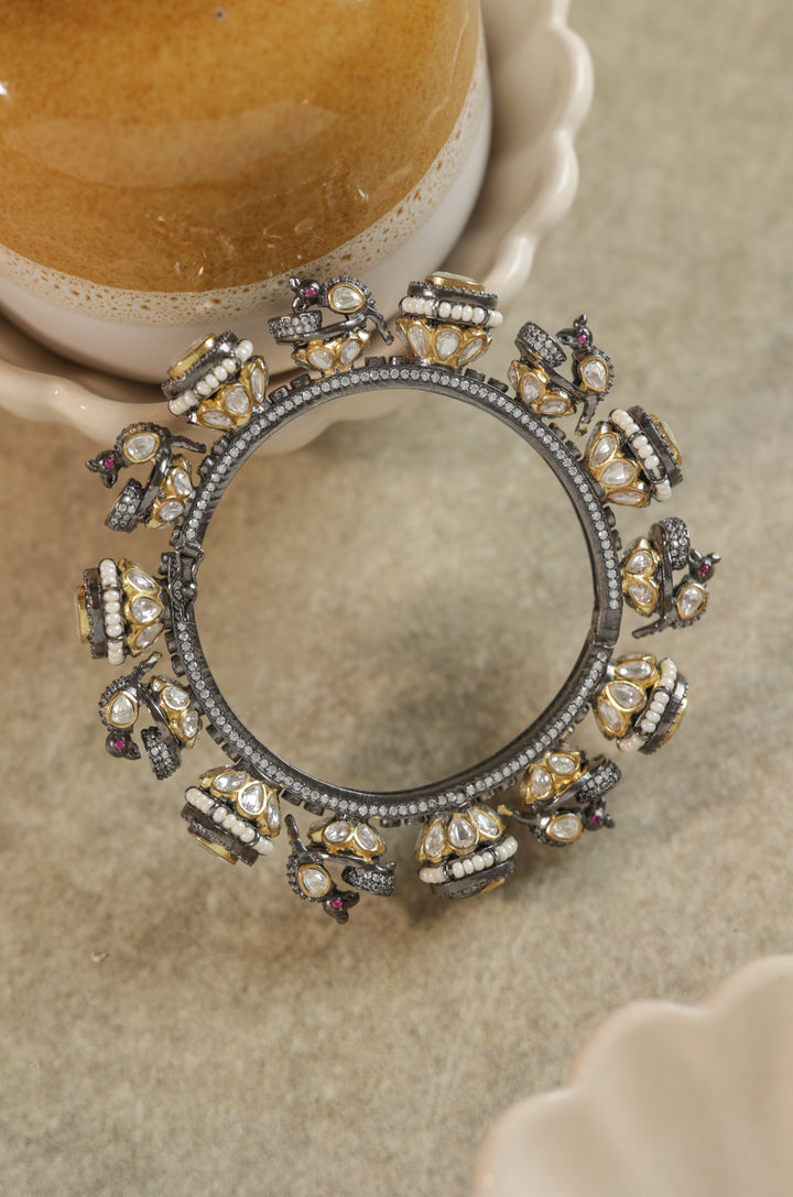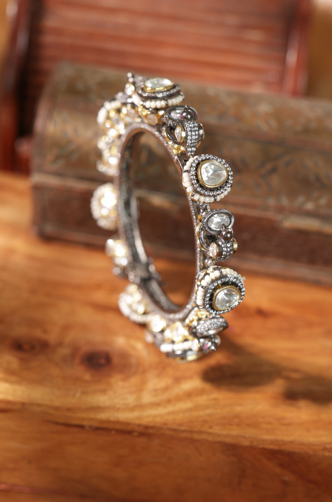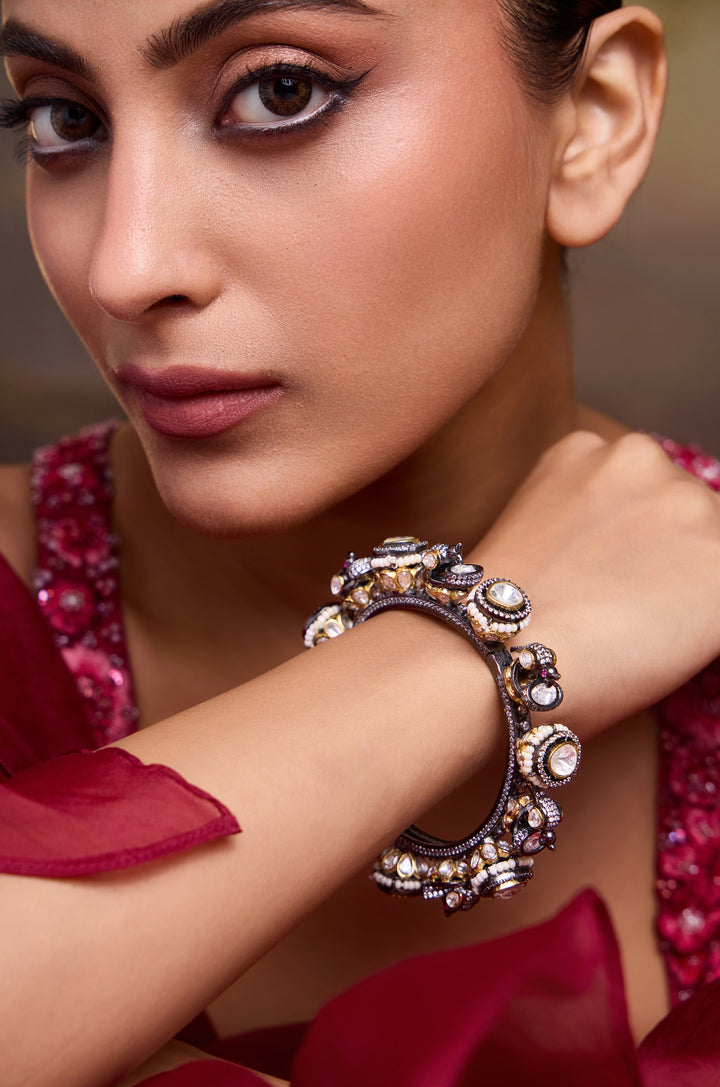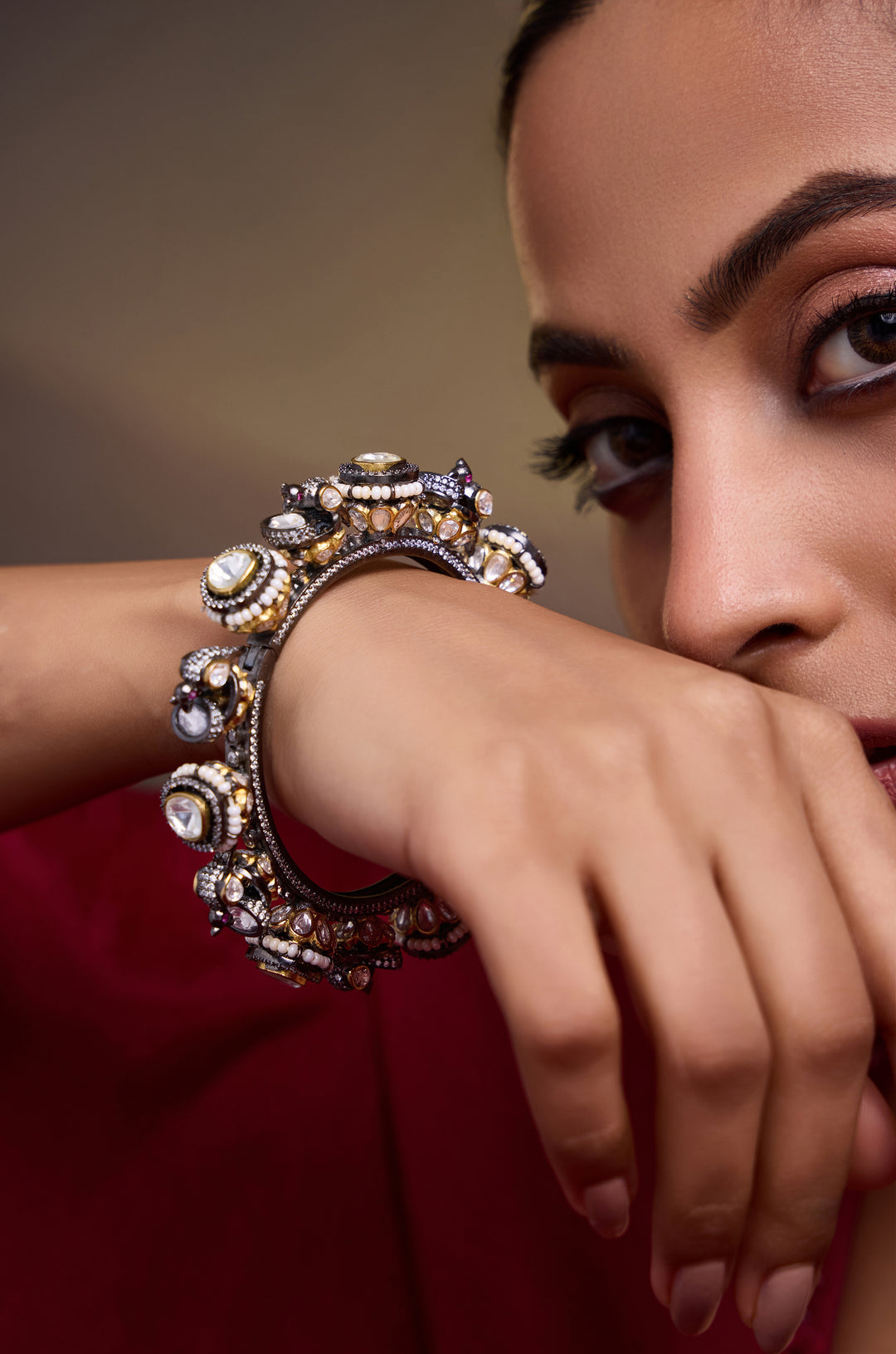 This exquisite pacheli bangle, designed for the contemporary maharani, beautifully merges tradition with enduring elegance. Adorned with sparkling polki stones and detailed with delicate cubic zirconia, each dome-shaped charm moves with refined grace, reflecting the artistry of classic craftsmanship. Ideal for layering or wearing alone, this piece doesn’t merely suggest royalty, it proclaims it.