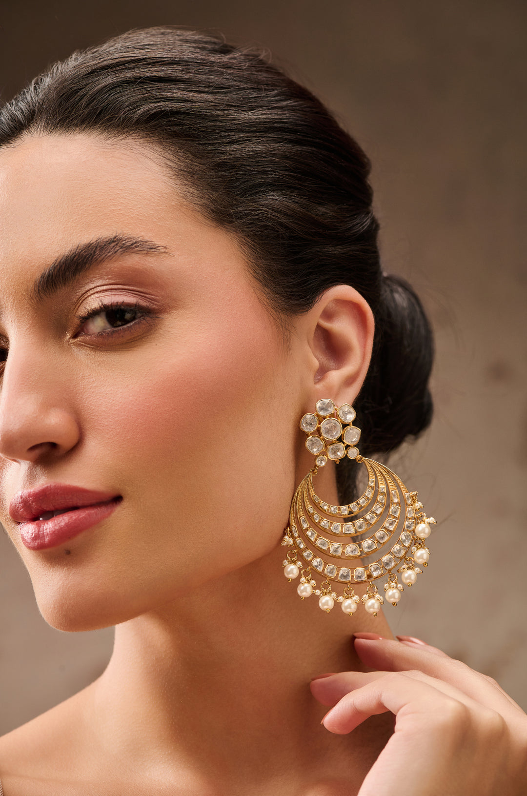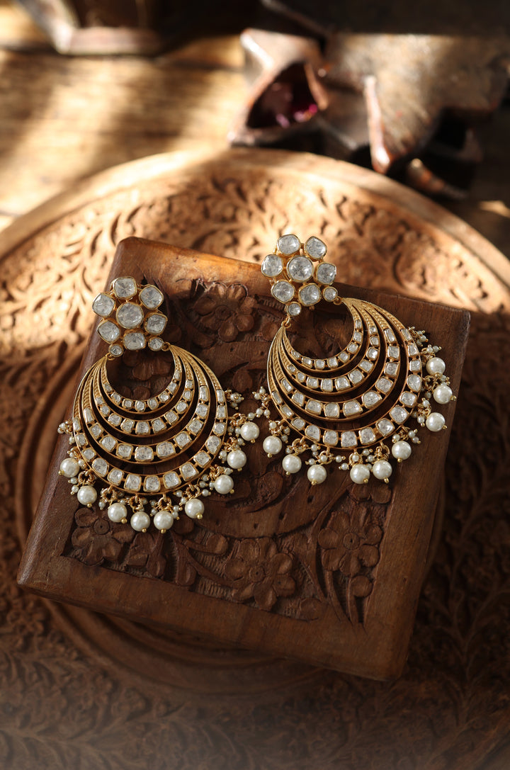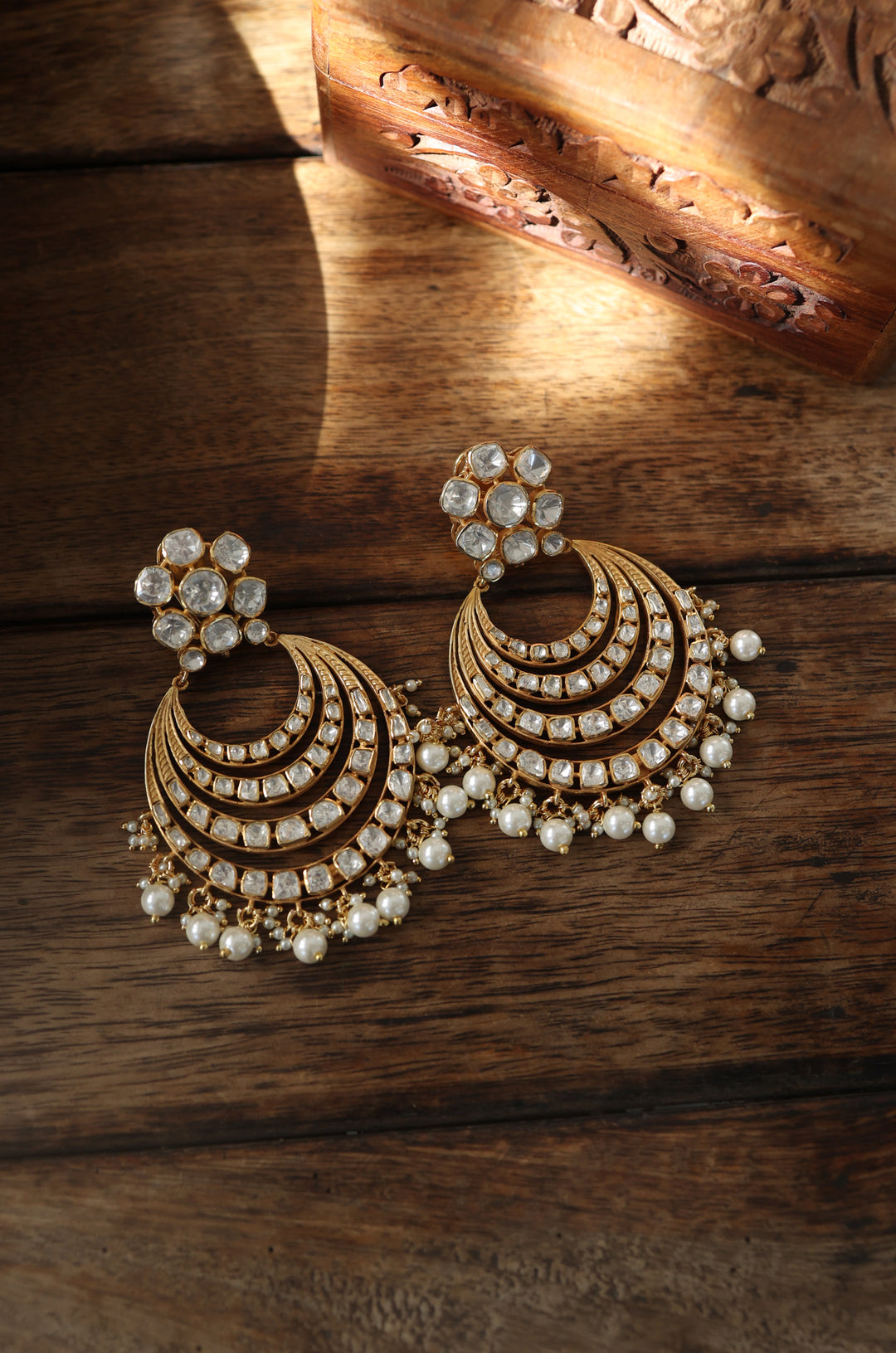 Experience the ethereal grace of Chandbali design earrings crafted from pure silver with the timeless elegance of the crescent moon. Each delicate curve is adorned with pearls, reminiscent of moonlit droplets, adding a touch of ancient mystique to the modern sophistication of this mesmerizing design. These earrings are more than just accessories; they are graceful whispers that draw admiring glances with every sway.