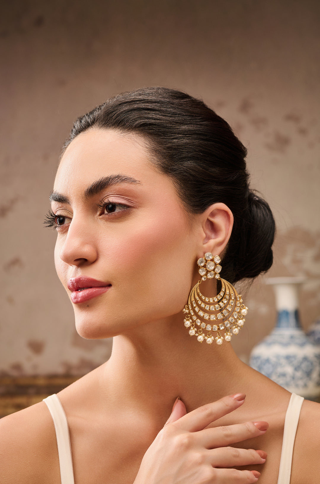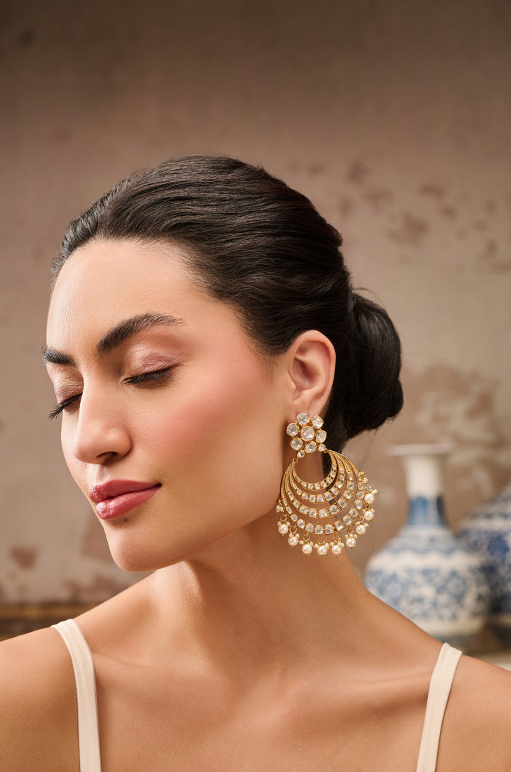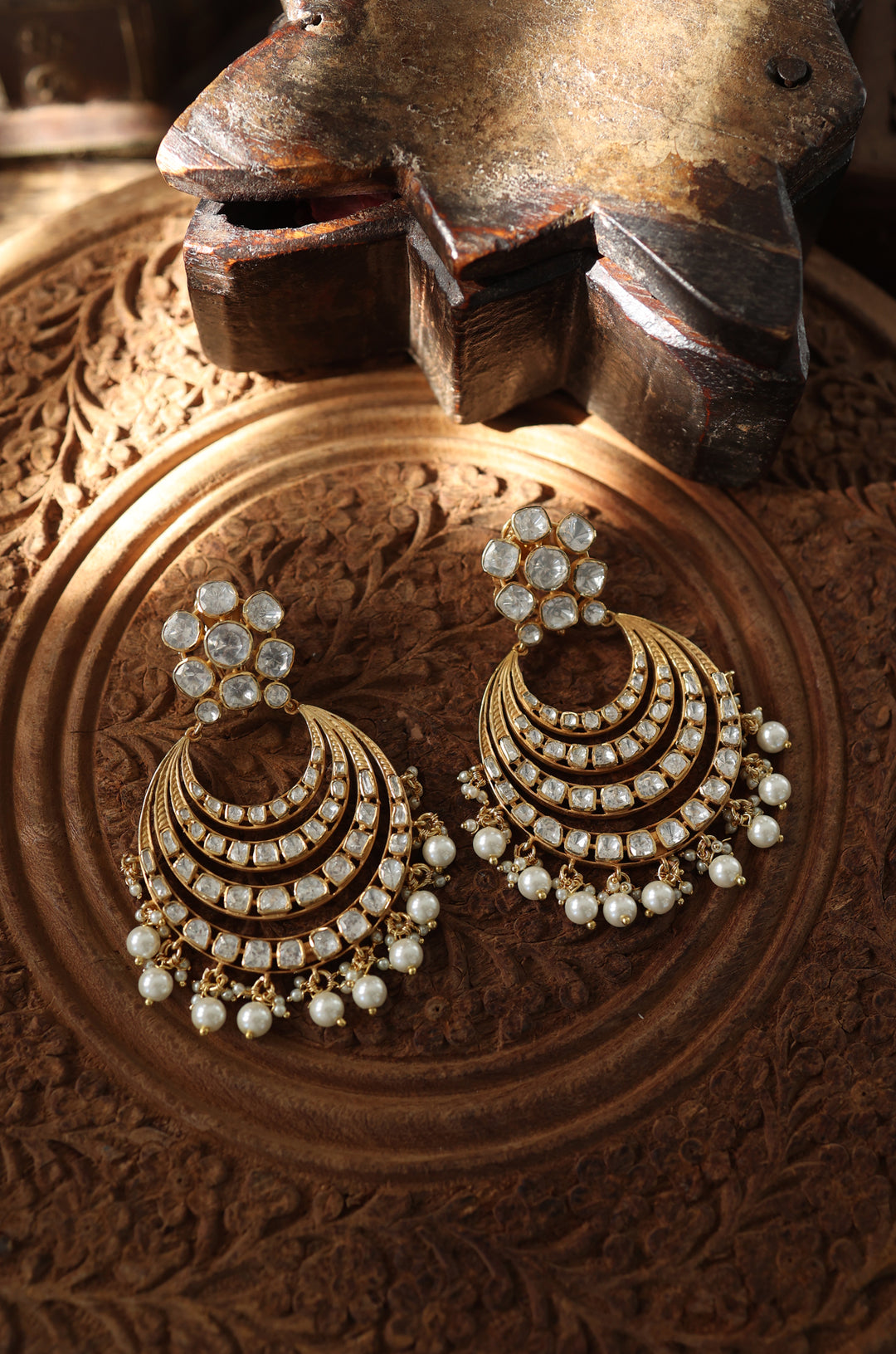 Experience the ethereal grace of Chandbali design earrings crafted from pure silver with the timeless elegance of the crescent moon. Each delicate curve is adorned with pearls, reminiscent of moonlit droplets, adding a touch of ancient mystique to the modern sophistication of this mesmerizing design. These earrings are more than just accessories; they are graceful whispers that draw admiring glances with every sway.
