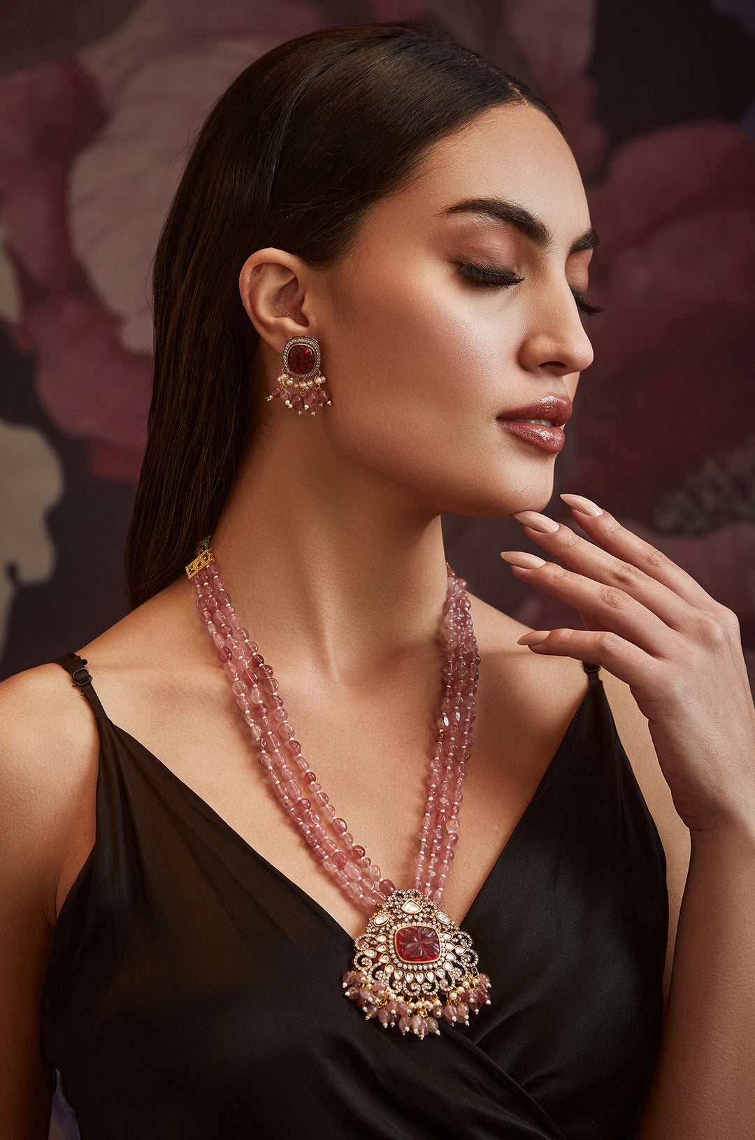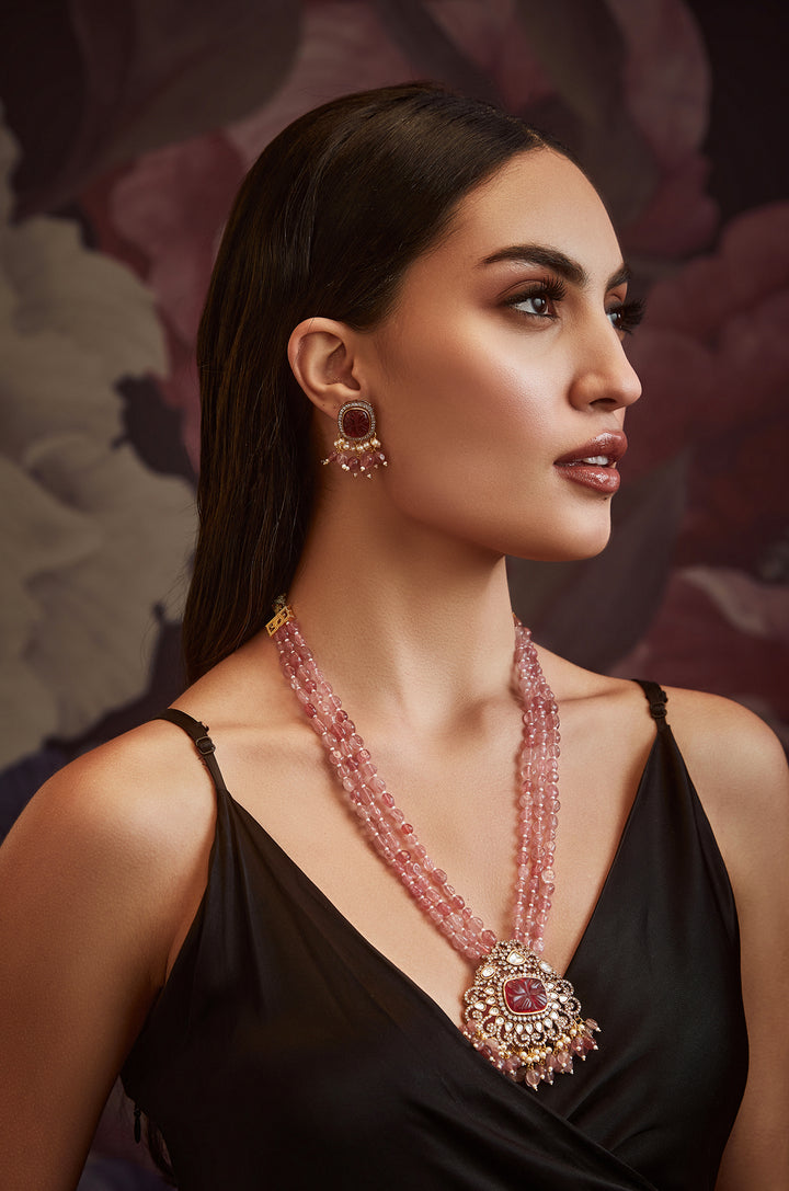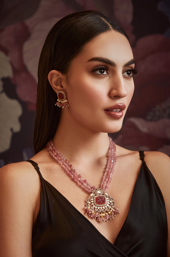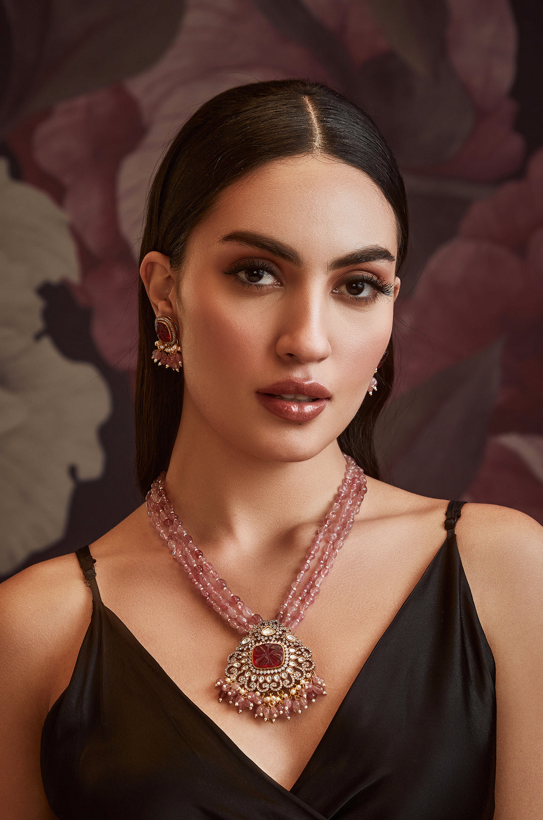 Handcrafted in dual tone of silver and gold, the 'Sia' necklace set is embedded in Victorian polkis and high graded zirconia. The center pendant with a beautiful ruby colored semi-precious stone at its heart, is strung with three lines of pink tourmaline stones, interspersed with cultured pearls and is finished off with tourmaline drops and white seed beads. This long neckpiece also comes with matching earrings and is perfect for a day out or an evening in.