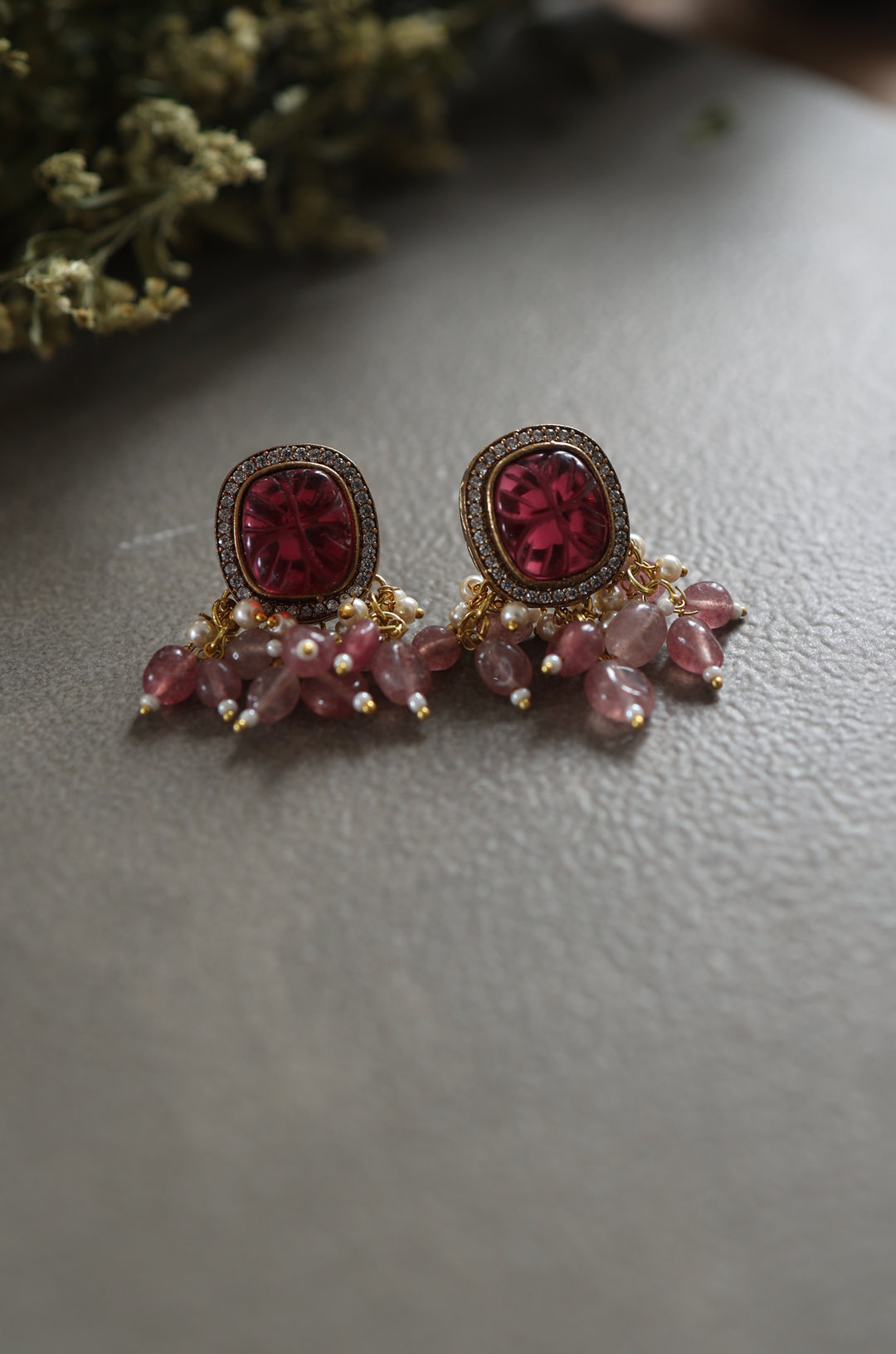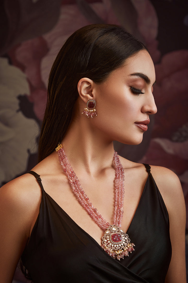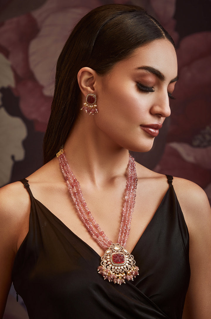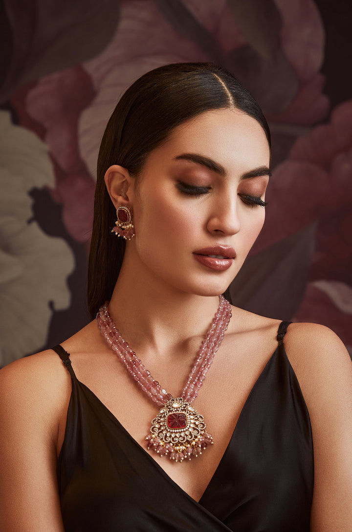 Handcrafted in dual tone of silver and gold, the 'Sia' necklace set is embedded in Victorian polkis and high graded zirconia. The center pendant with a beautiful ruby colored semi-precious stone at its heart, is strung with three lines of pink tourmaline stones, interspersed with cultured pearls and is finished off with tourmaline drops and white seed beads. This long neckpiece also comes with matching earrings and is perfect for a day out or an evening in.