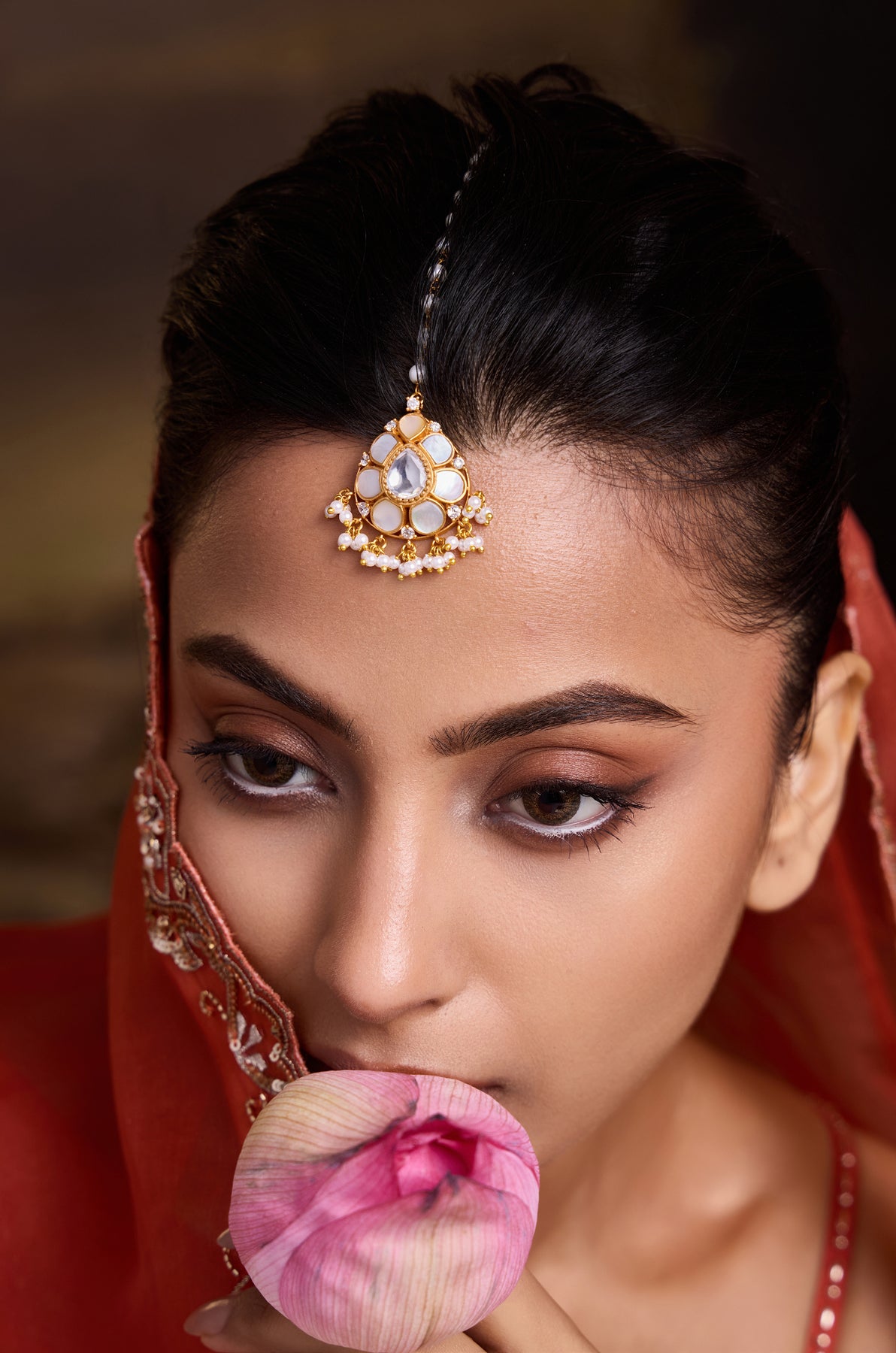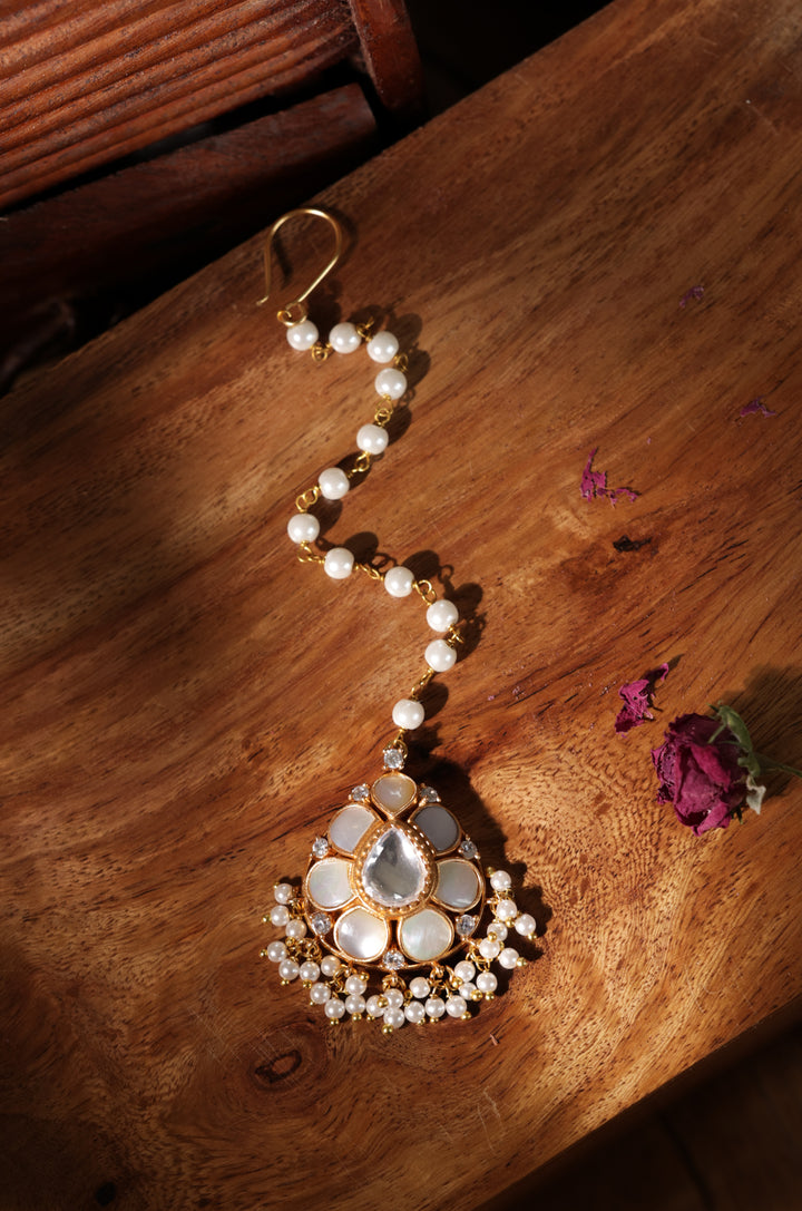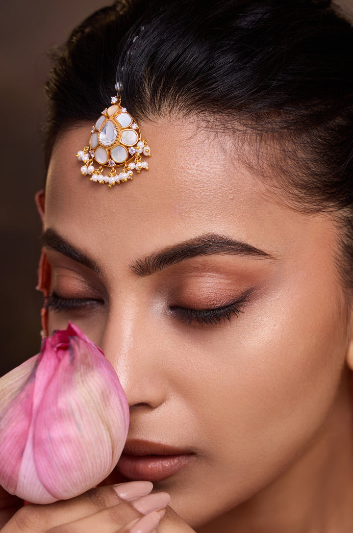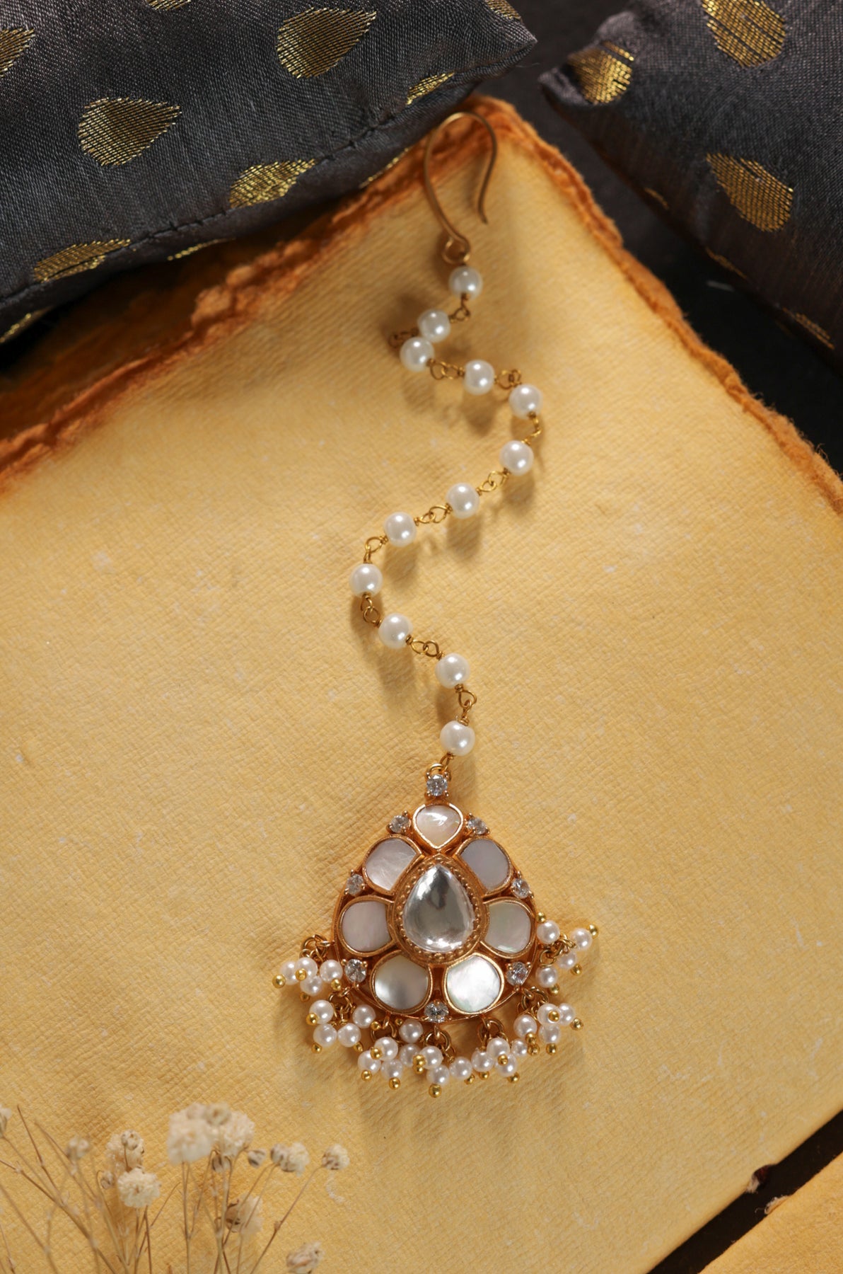 Elevate your traditional look with the Sirsha maangtikka, exquisitely crafted with lustrous mother of pearl and adorned with abundant pearls. This sophisticated piece adds a timeless elegance to any ensemble, perfect for special occasions and cultural celebrations. Its delicate shimmer and classic design make it a graceful accessory that enhances your natural beauty.
