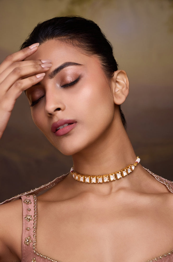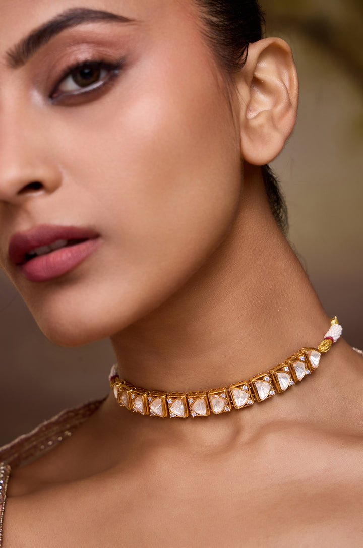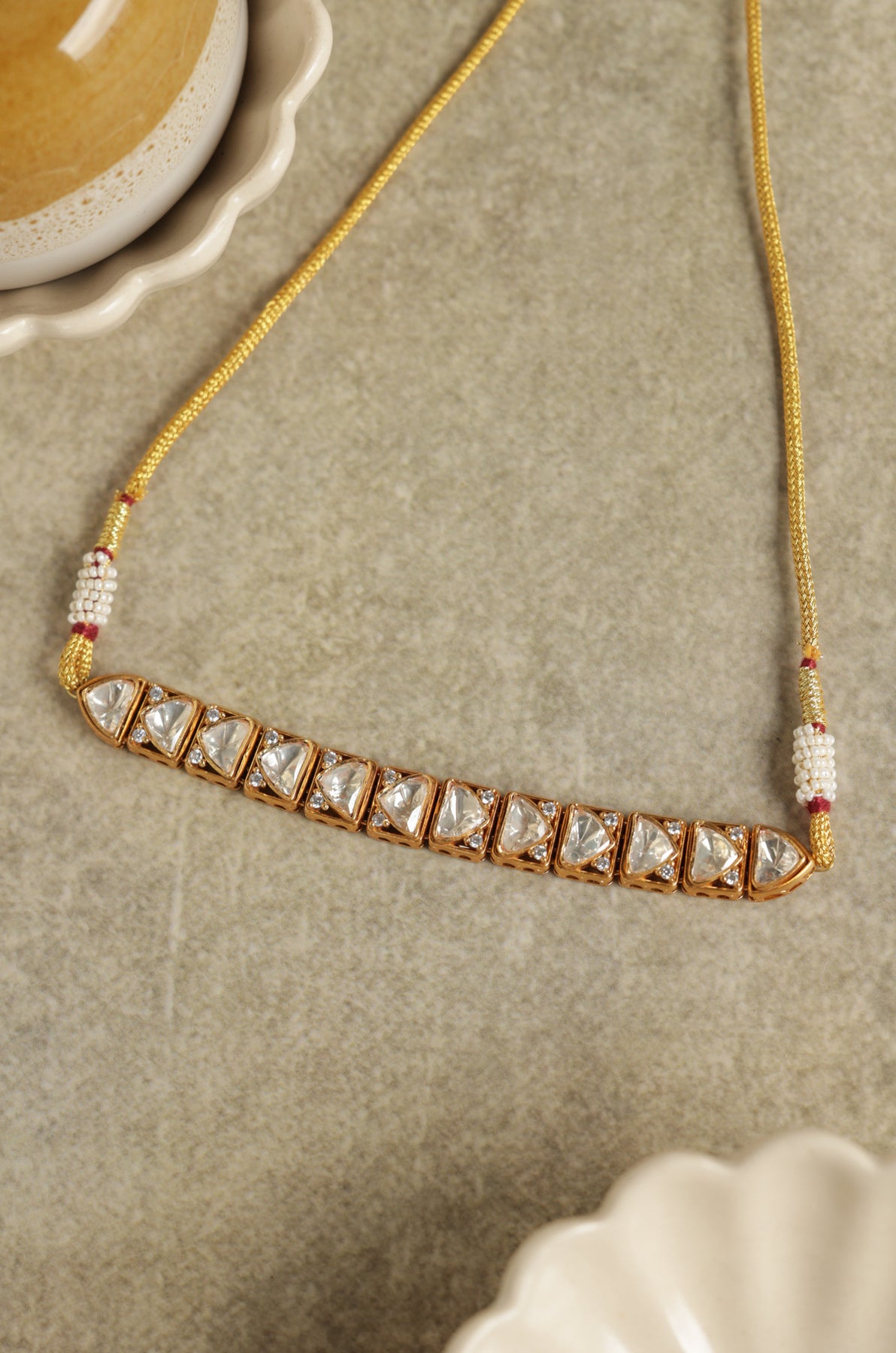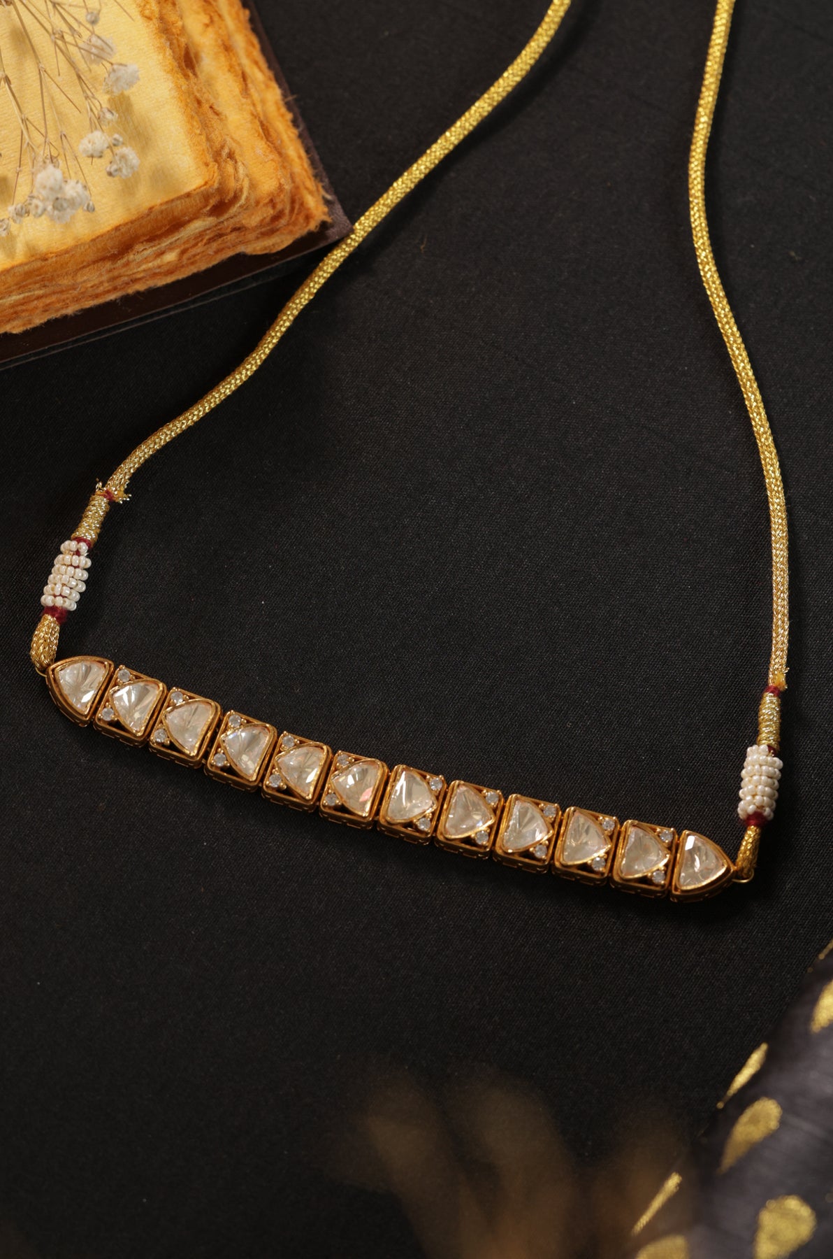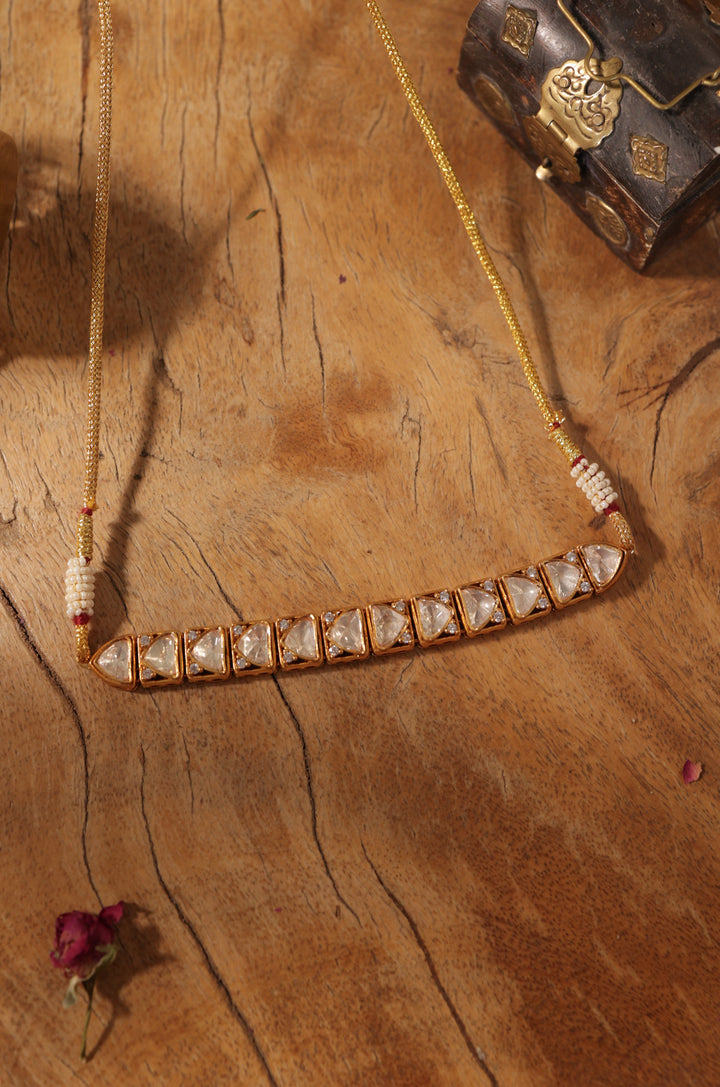Graceful and timeless, the Sitara necklace is an ode to classic elegance. Set in a refined line of high-polish gold-tone frames, each polki glows with unmatched brilliance. The subtle detailing of miniature beads and the soft glimmer of each handcrafted unit make this piece perfect for both heirloom charm and modern minimalism. Whether worn with a saree or a silhouette in ivory, Sitara brings a quiet regal glow to your neckline.