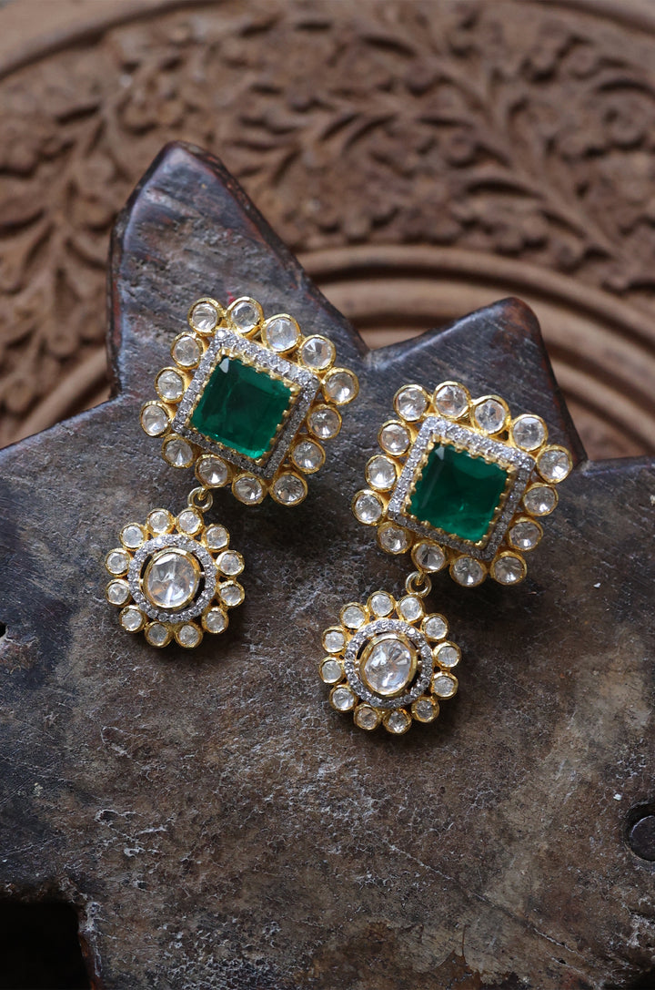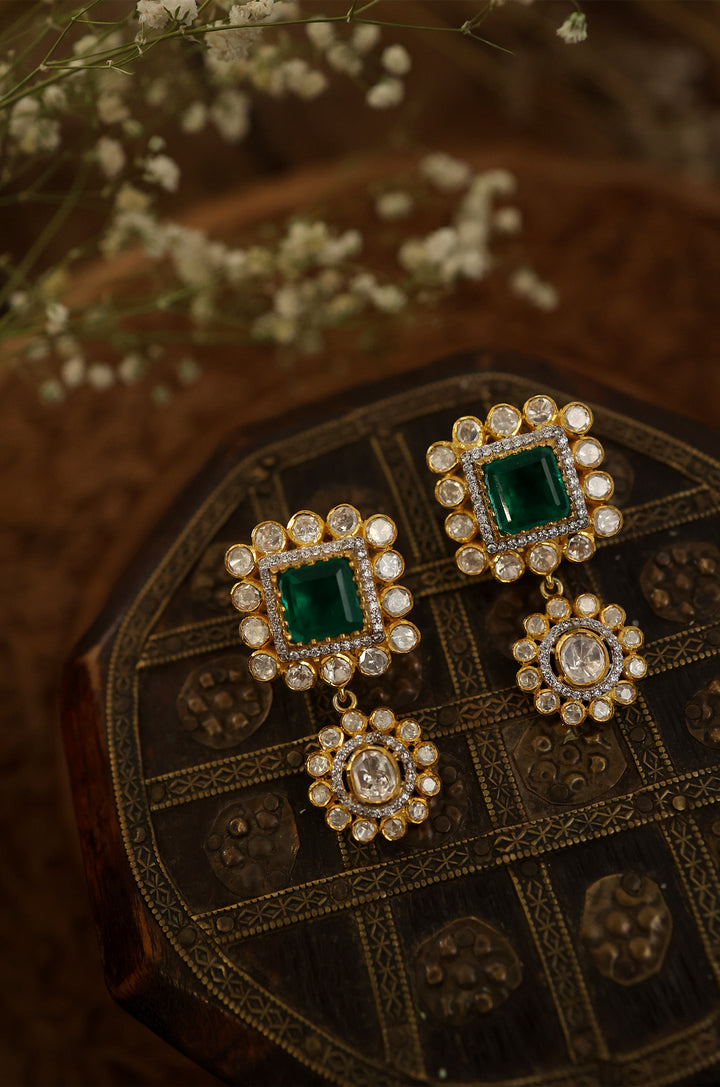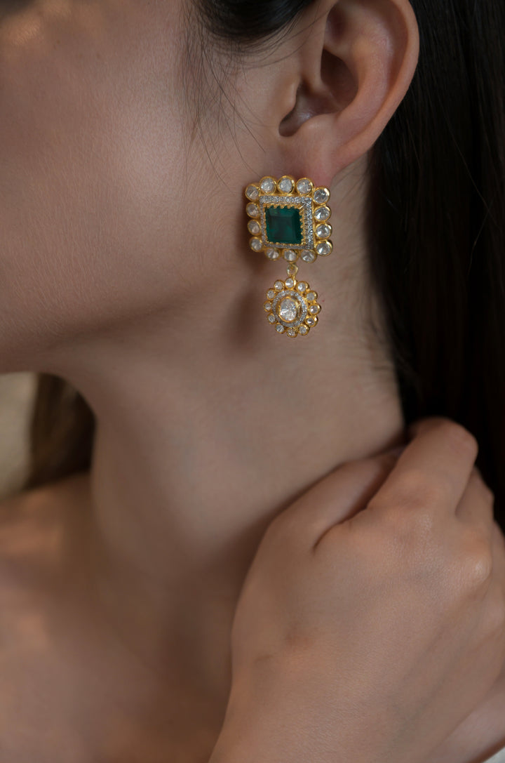 Featuring an opulent floral design, these splendid earrings are a beautiful medley of shades of the past with hues of the present. The design features emerald green stone at the center and is finished off an opulent amalgam of intricately set polkis with the richness of color and soulful embodiment of vibrant Indian handcrafting techniques.