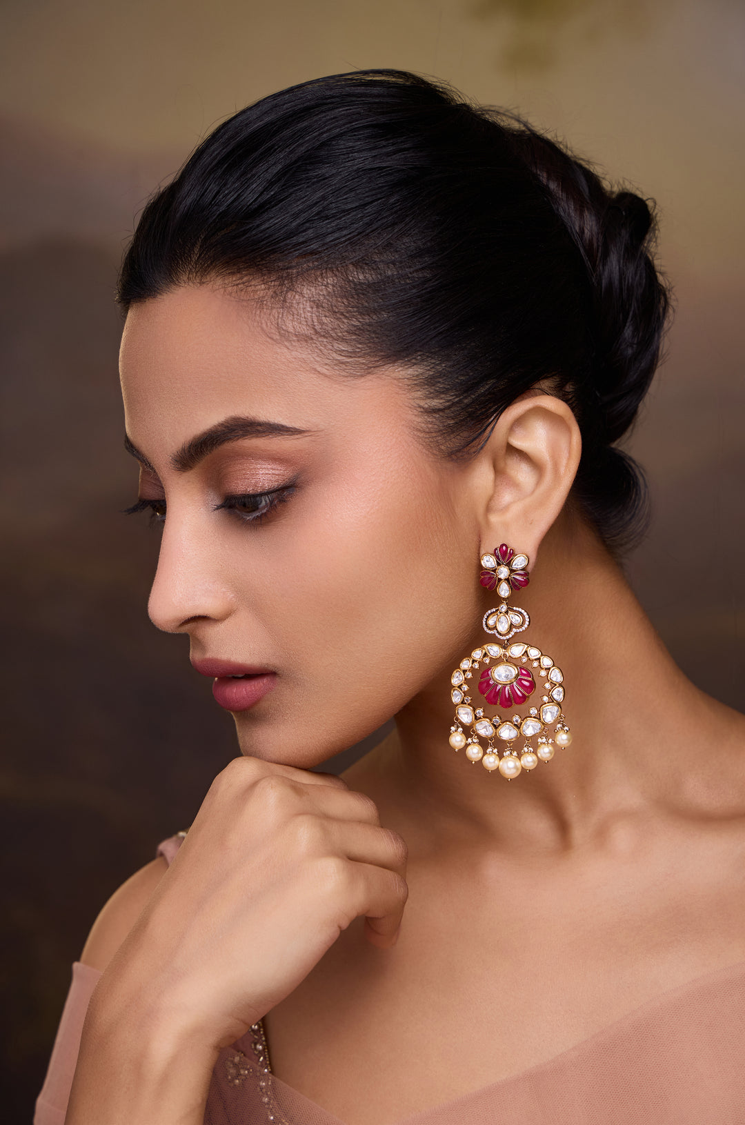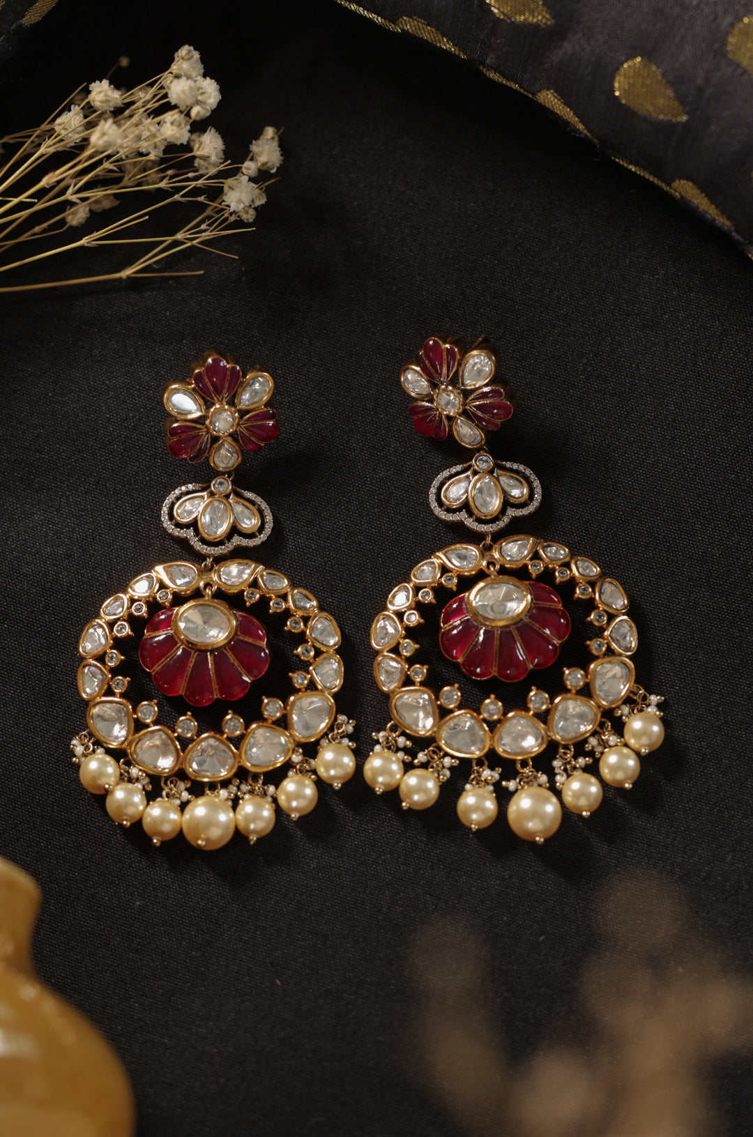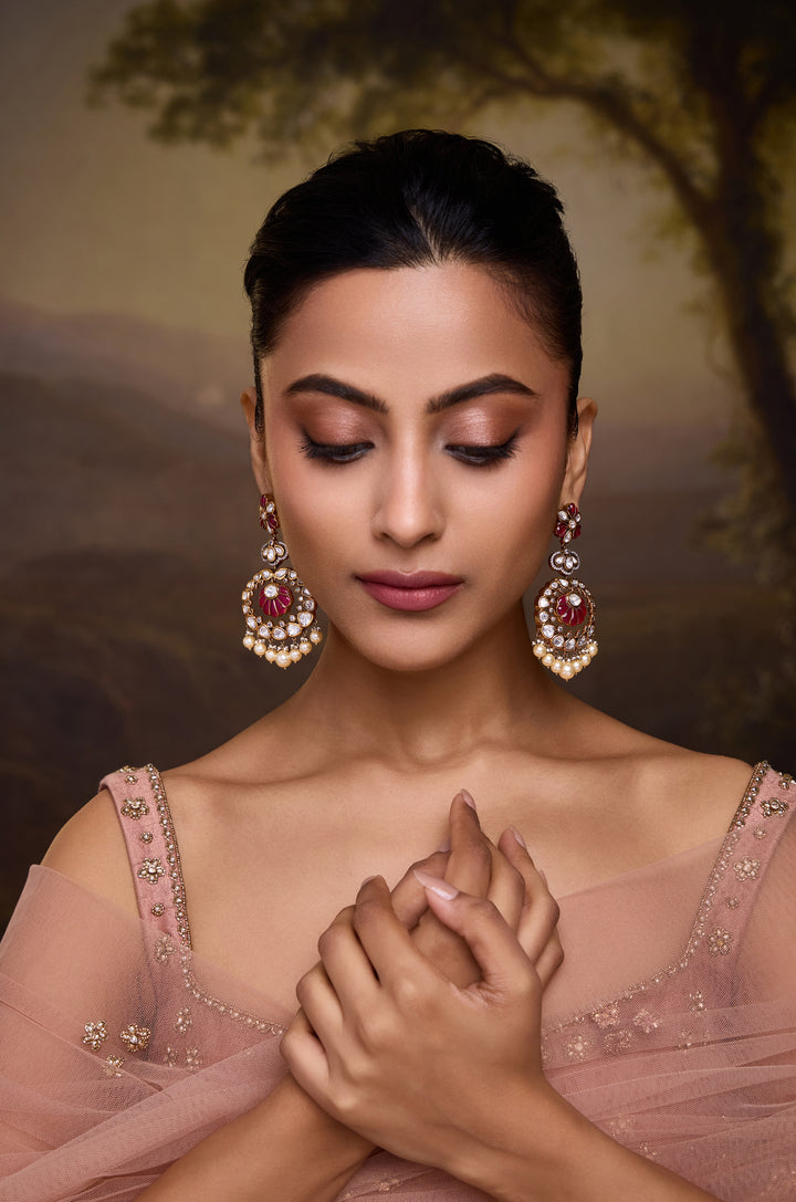 Zaeya earrings showcase exquisite artistry, combining the deep allure of garnet stones, the shimmering charm of polki, and the sparkle of zirconia in a design that exudes sophistication. Enhanced by a delicate fringe of radiant pearls, these earrings elegantly merge heritage with luxury. Perfect for festive occasions or elegant events, Zaeya embodies timeless grace infused with contemporary flair.