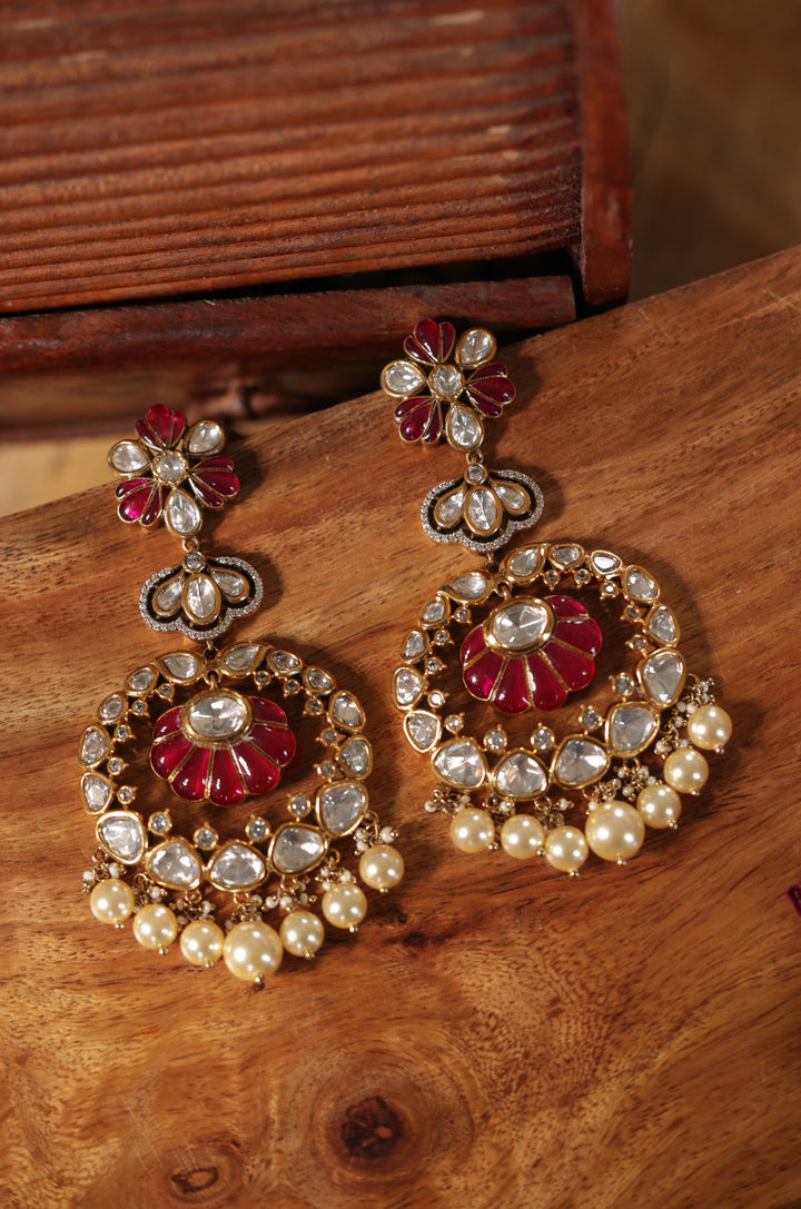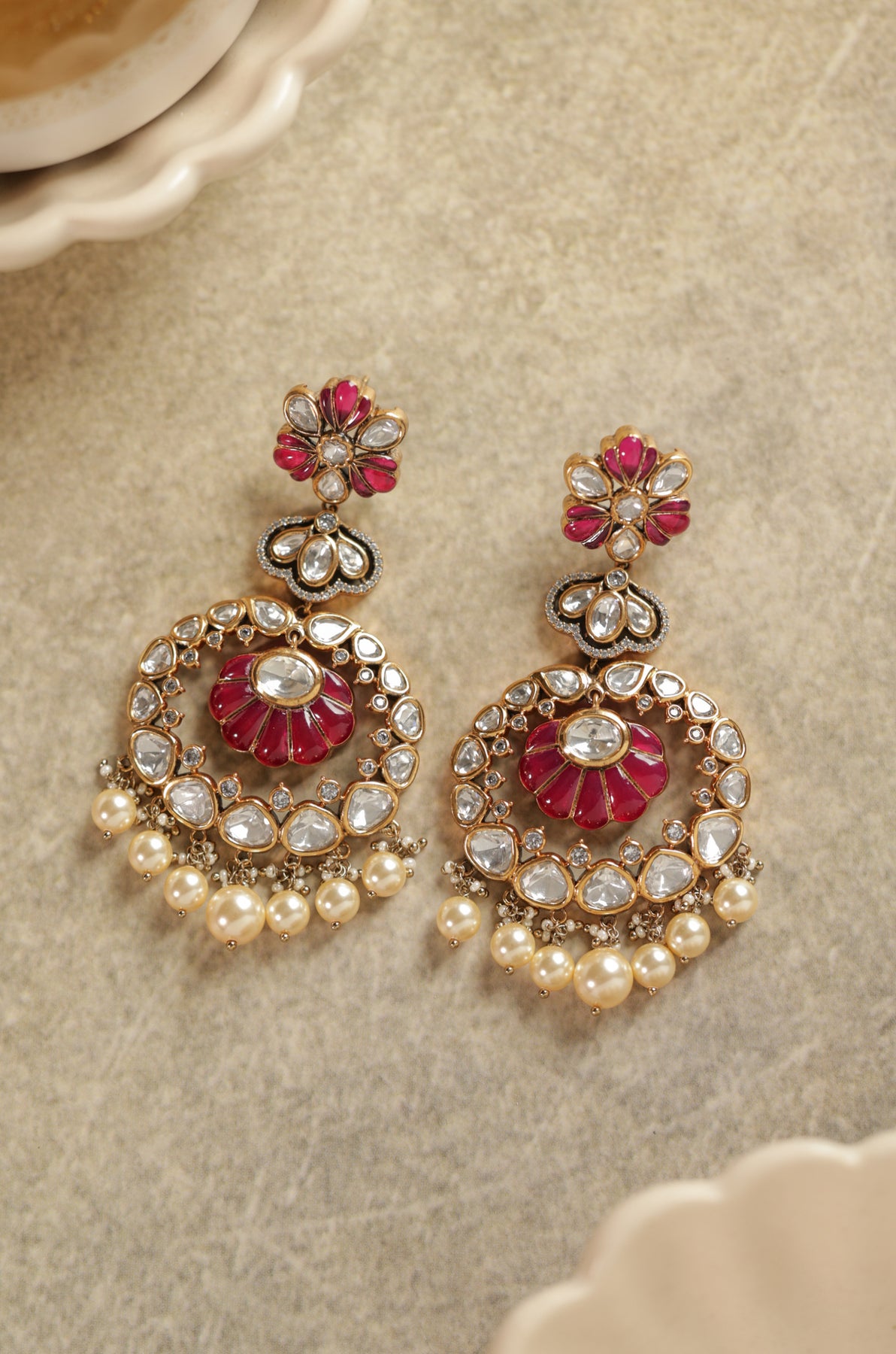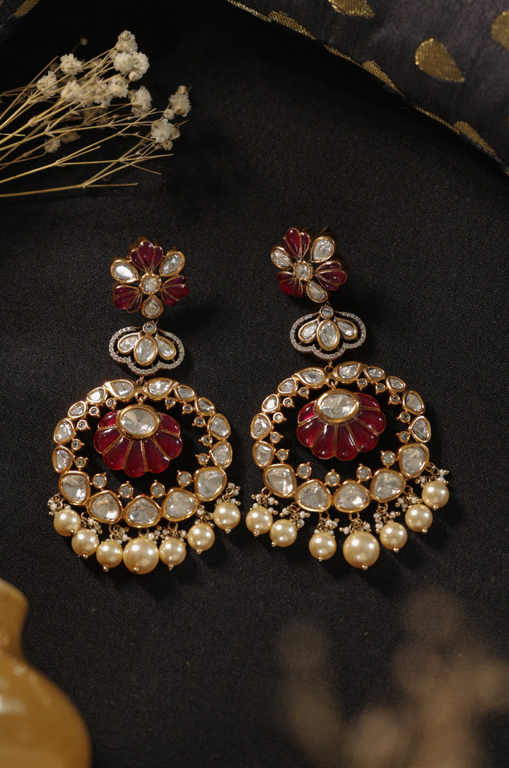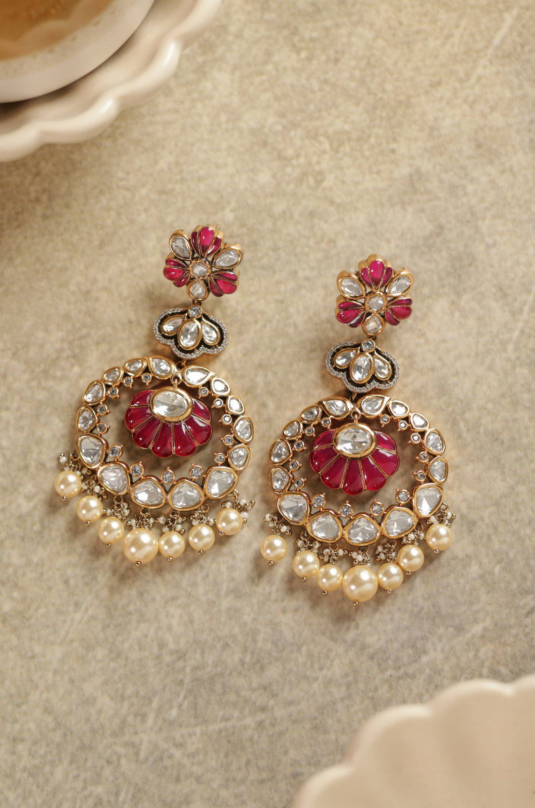 Zaeya earrings showcase exquisite artistry, combining the deep allure of garnet stones, the shimmering charm of polki, and the sparkle of zirconia in a design that exudes sophistication. Enhanced by a delicate fringe of radiant pearls, these earrings elegantly merge heritage with luxury. Perfect for festive occasions or elegant events, Zaeya embodies timeless grace infused with contemporary flair.