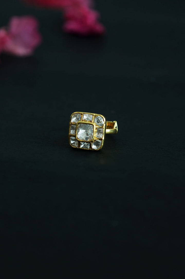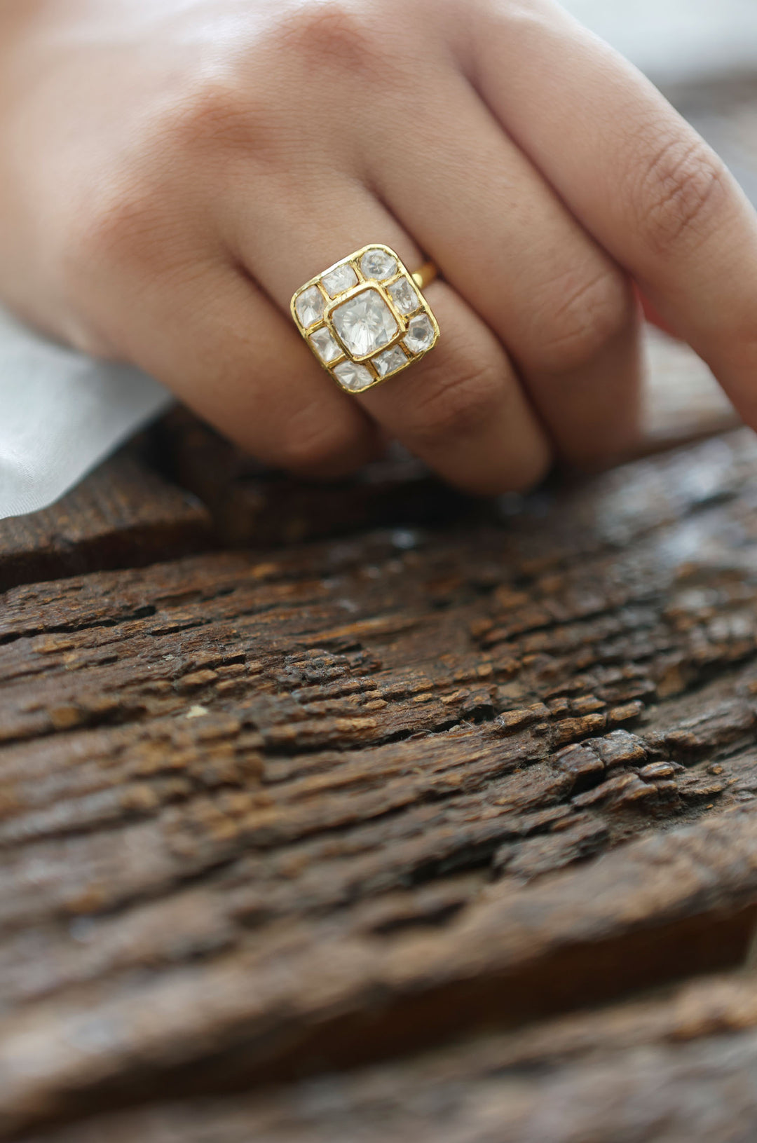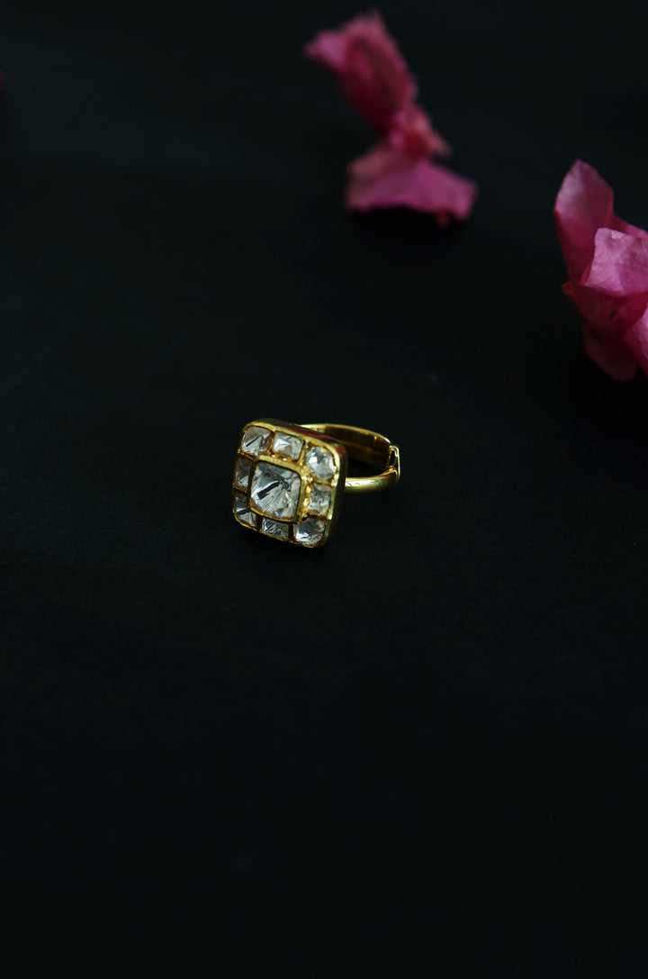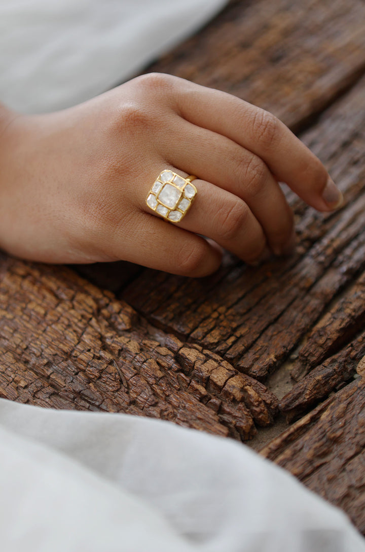 The elegant Zaheen ring features breathtaking polkis for an absolutely luxe feel that can be worn as a statement chunk or coupled with a pair of polki earrings. An amalgamation of modern and traditional design, the ring comes together in a remarkable combination that outshines across occasions and styles.