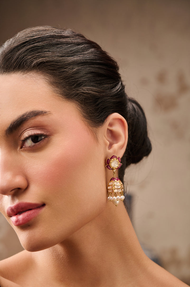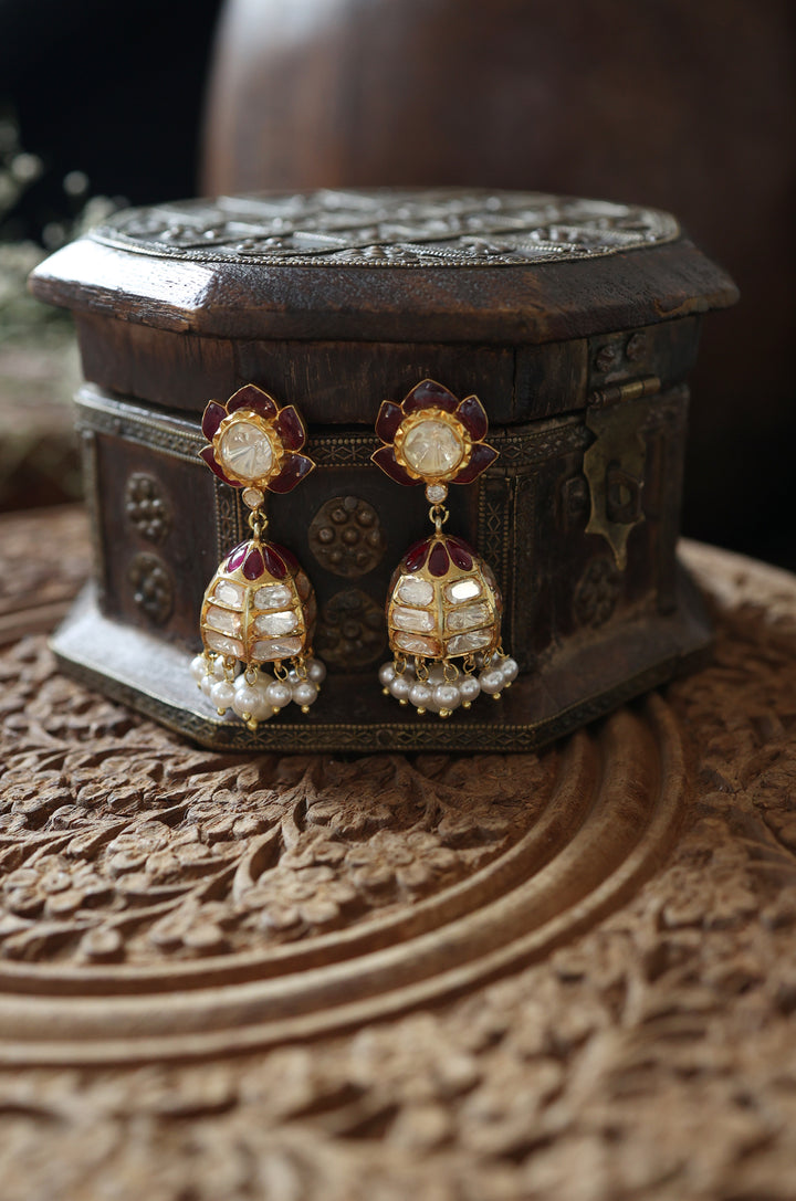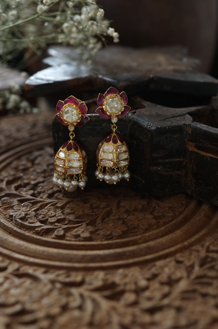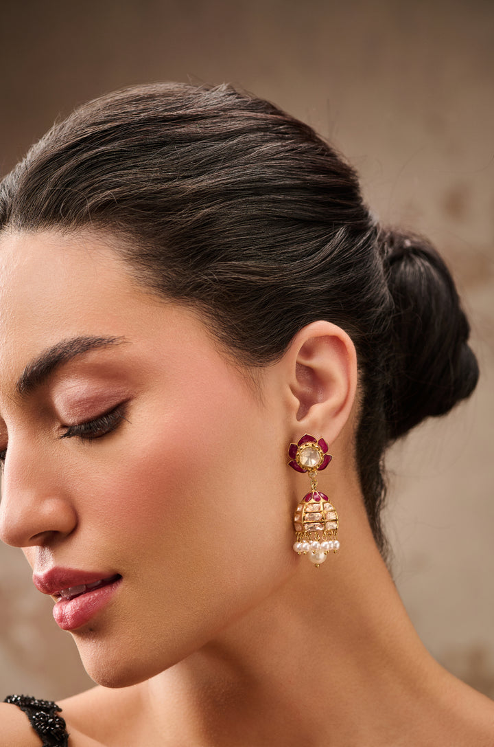 These earrings are a perfect blend of traditional and modern design, featuring delicate floral tops adorned with ruby red stones attached to a jhumka encrusted with sparkling moissanite polkis and highlighted with pearls. Crafted with fine silver, every intricate detail captures the essence of tradition while adding a contemporary twist. These earrings exude a radiant glow, enchanting all who see them, making them an heirloom treasure for generations to come or a stylish addition to your everyday wardrobe.
