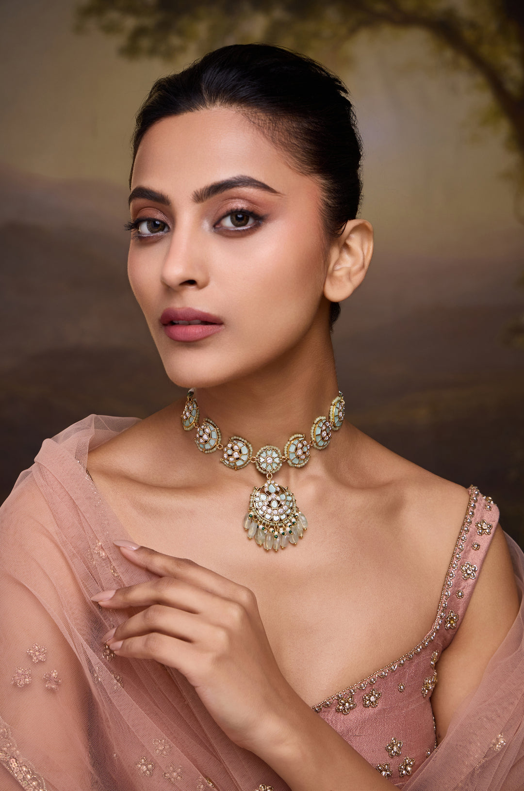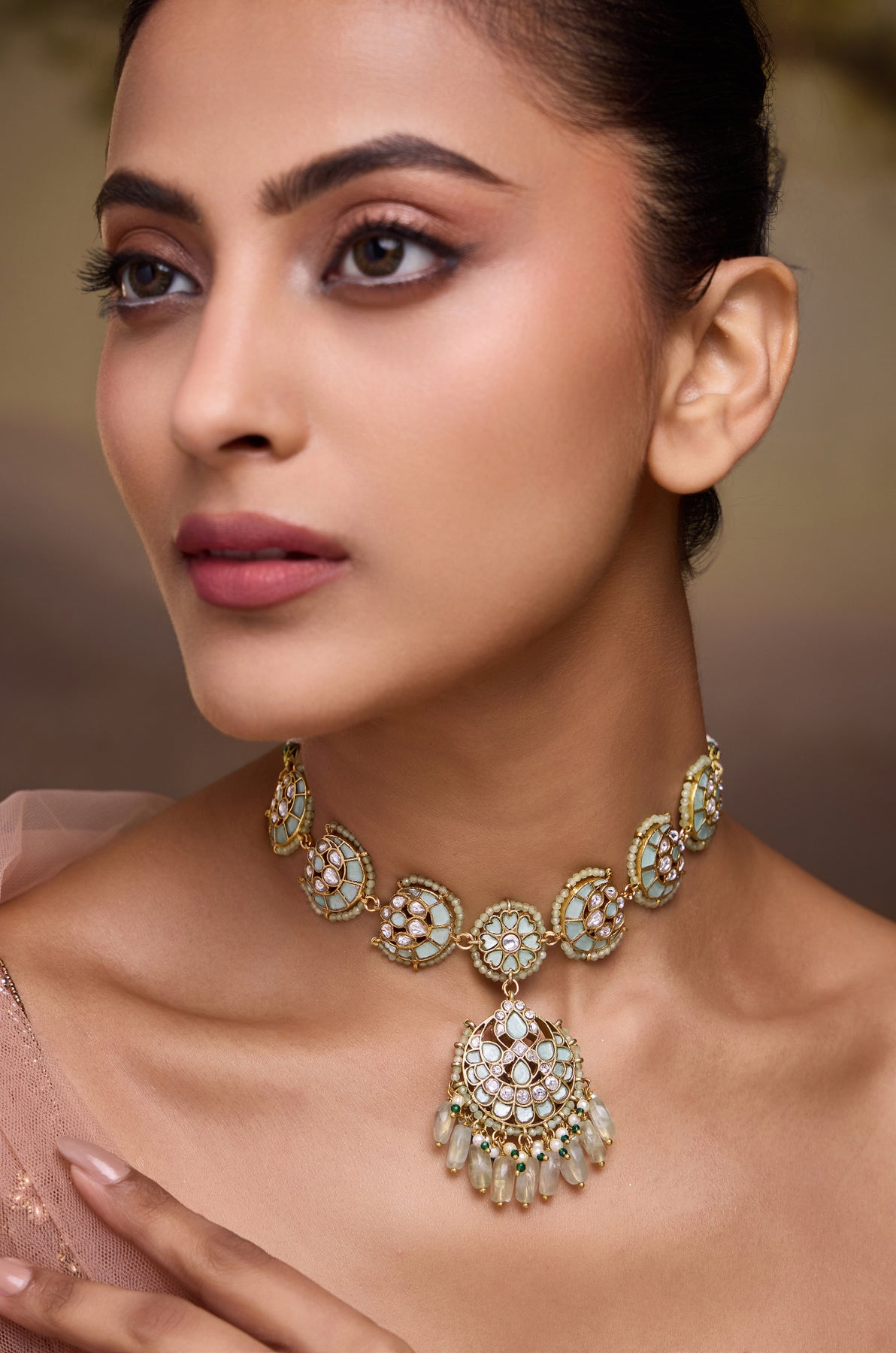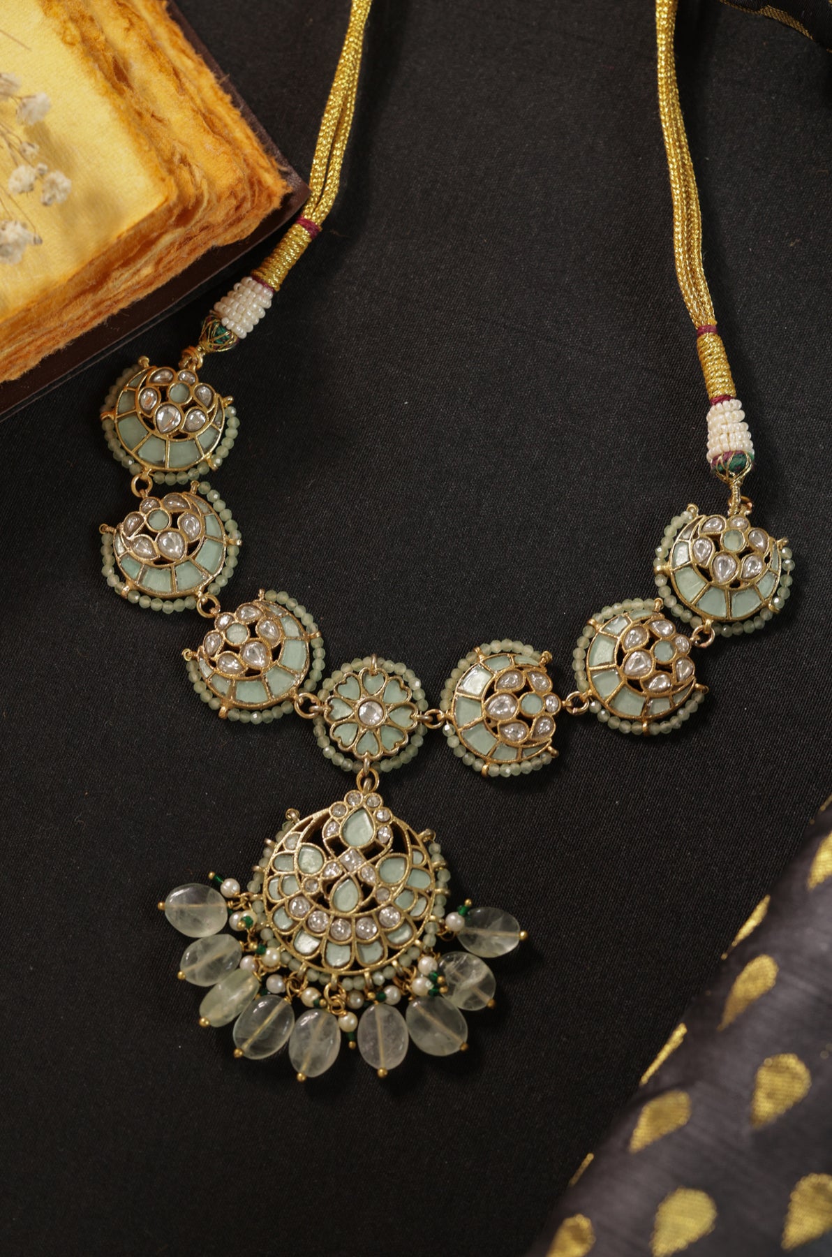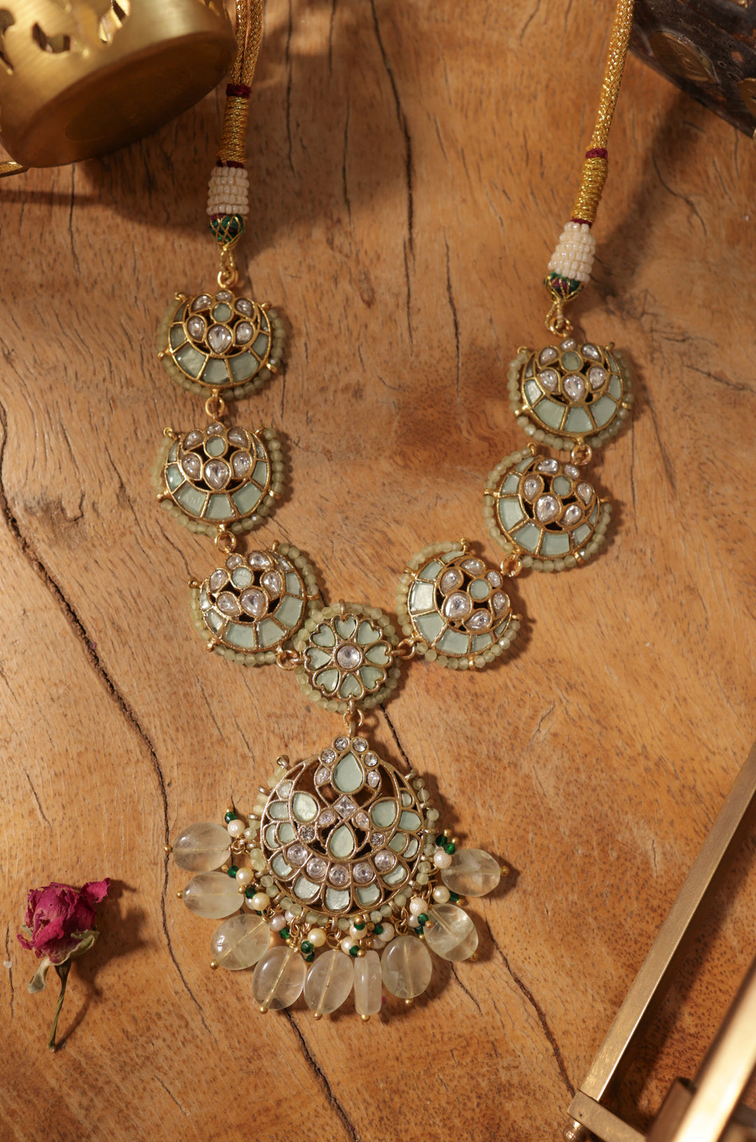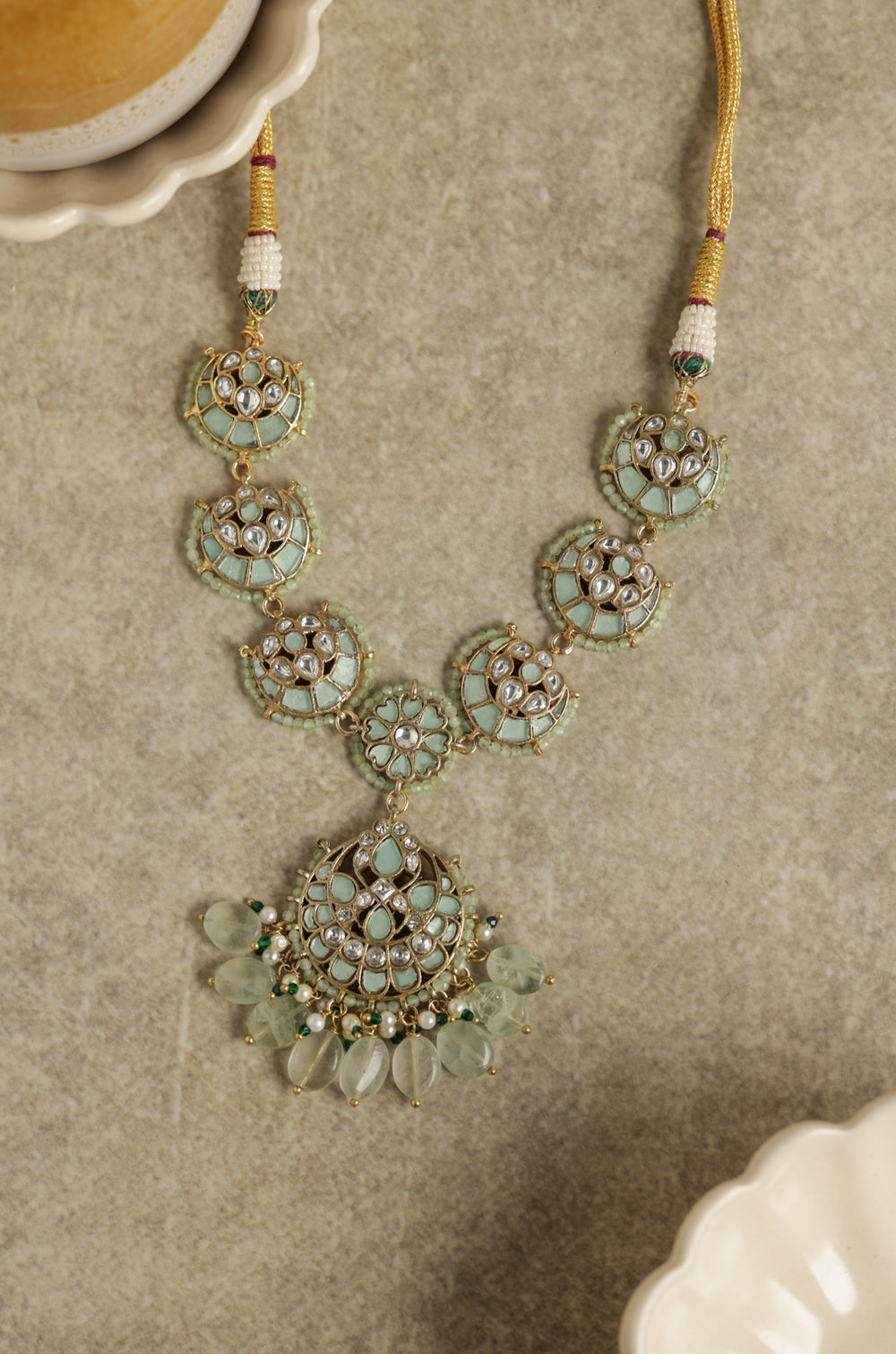 Elevate your elegance with the Zubera necklace, featuring exquisite kundan craftsmanship adorned with delicate floral motifs. Highlighted by vibrant fluorite stones, this contemporary piece blends traditional artistry with modern design, making it a refined statement for any occasion.